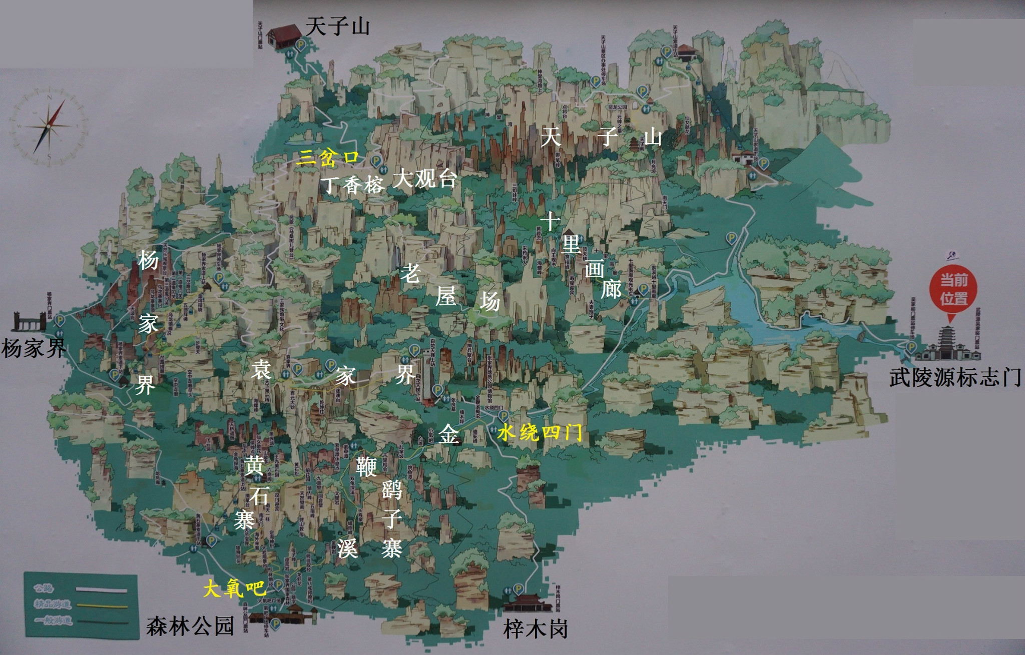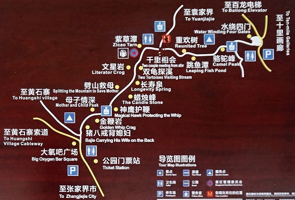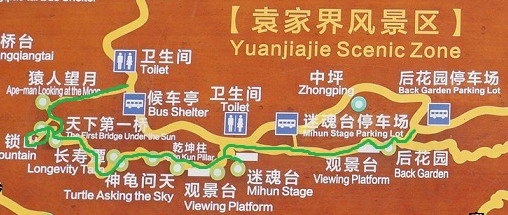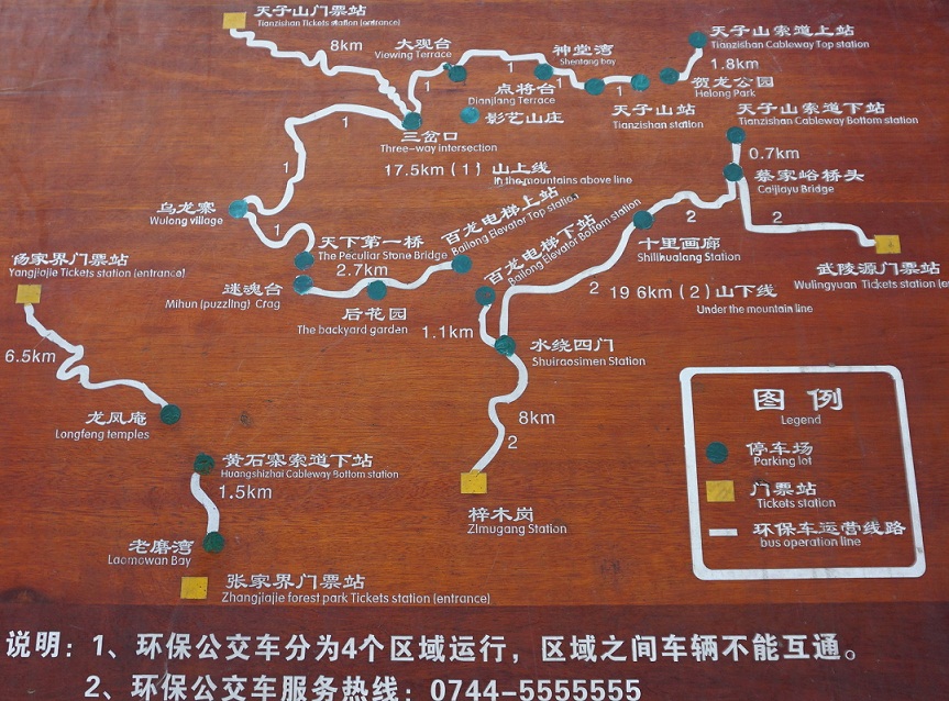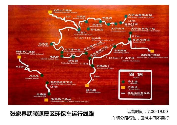 >>>环保车线路2条<<<标志门门票站——十里画廊——水绕四门——百龙天梯下站(搭乘百龙天梯前往森林公园袁家界)标志门门票站——天子山索道下站(搭乘天子山索道前往天子山景区)>>>游览线路引荐<<<较多游览者选择的入口,通常由此入口进入,从森林公园入口出,不走回头路。Day1 门票站——十里画廊——天子山索道——天子山景区——丁香榕(夜宿)Day2 老屋场 或 大观台(看日出)——杨家界——袁家界——百龙天梯——森林公园金鞭溪——森林公园票站出。
