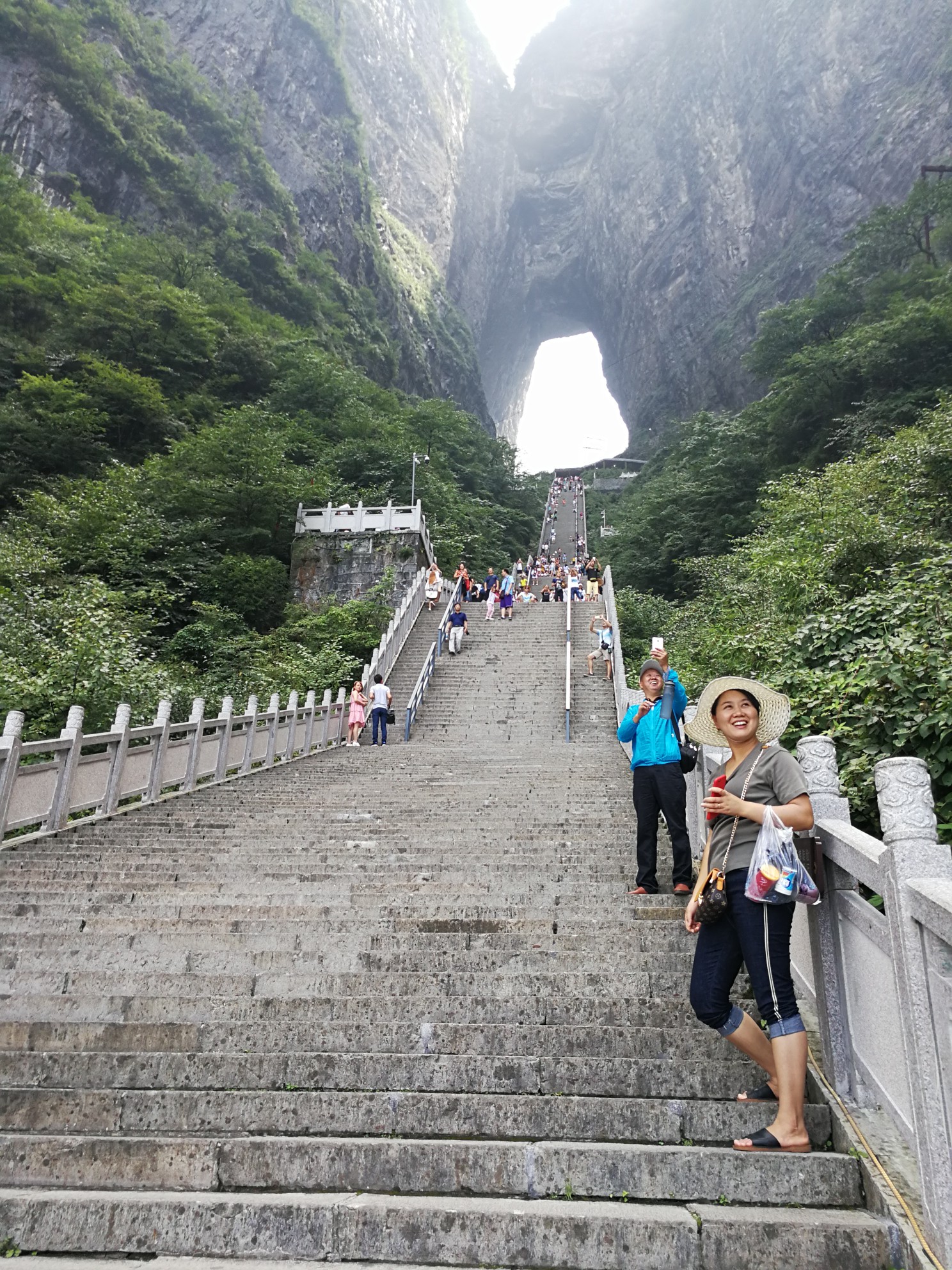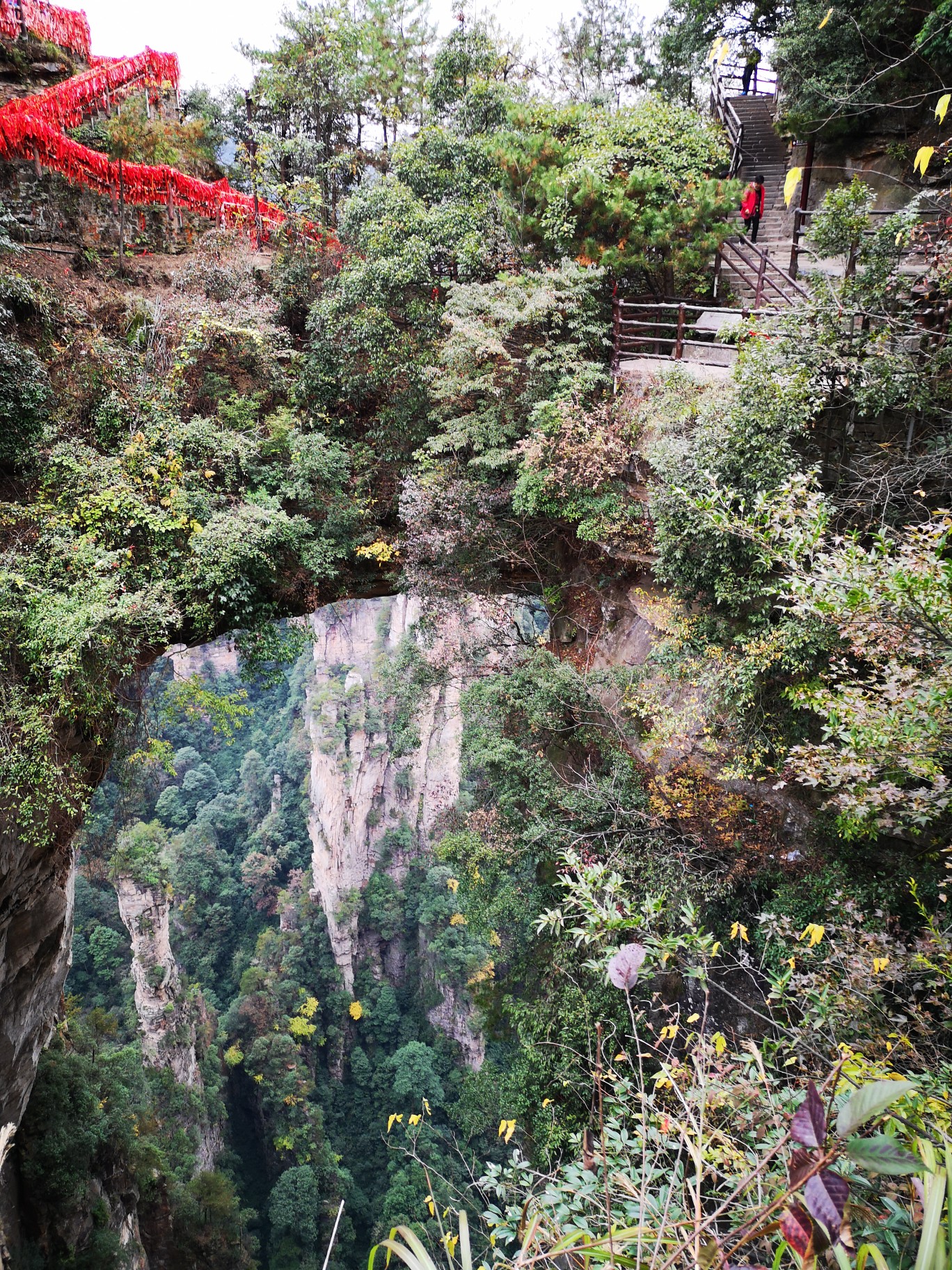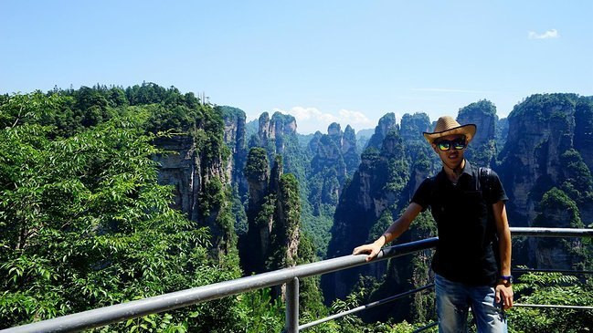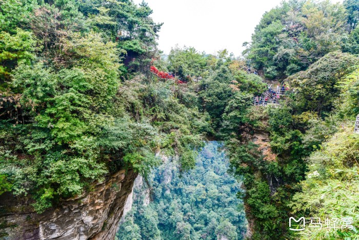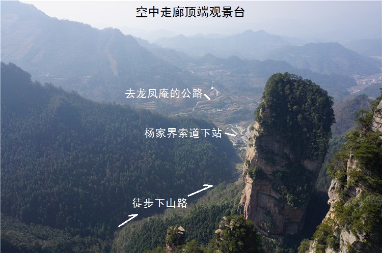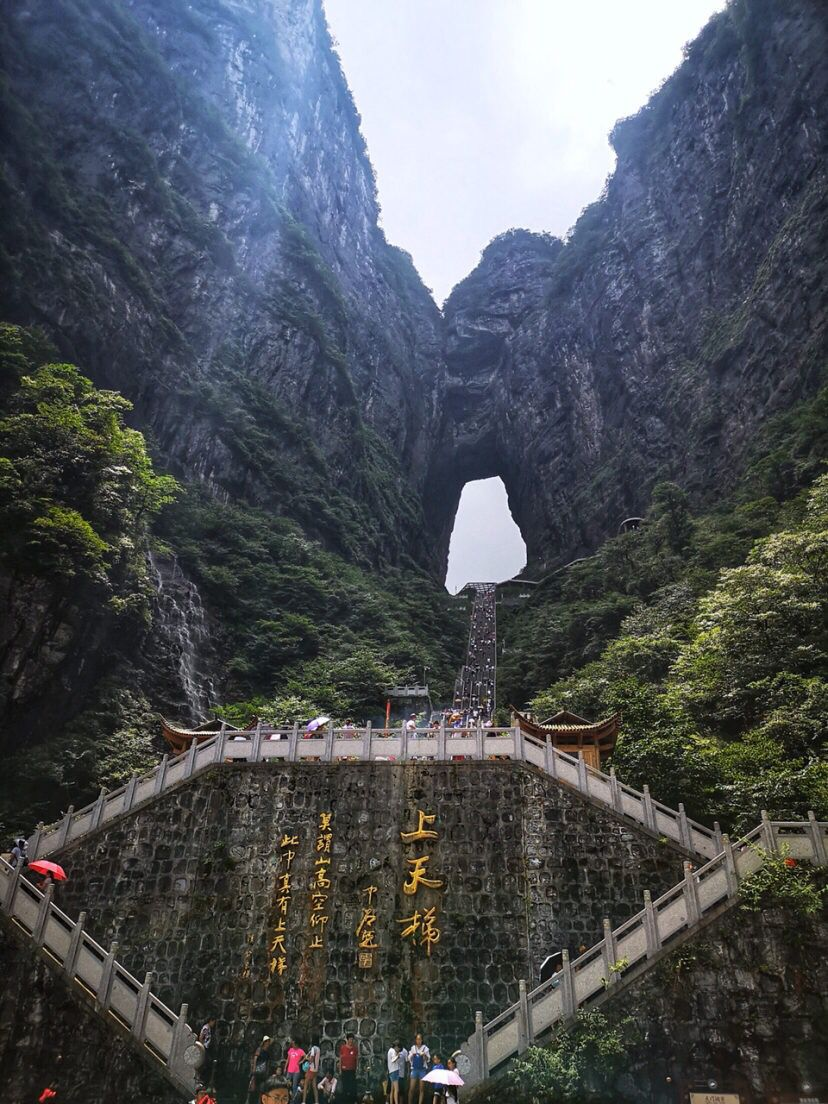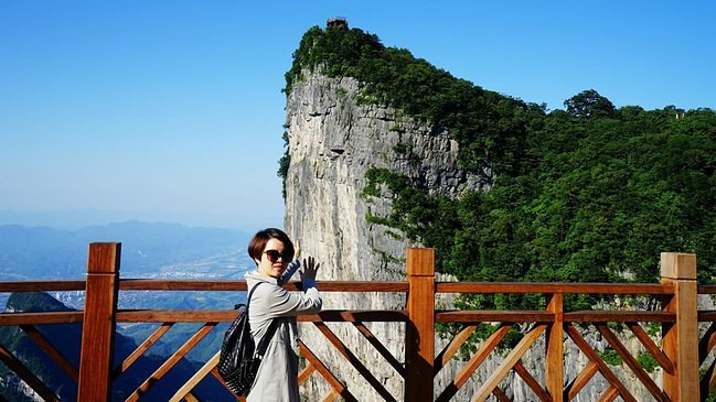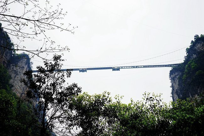 这里就是近处看到的天下第一桥,虽然也很壮观,但却是普通人视角,这里的游客很多,是比较有名的景点之一百龙电梯本来准备从乱窜坡徒步下山的,但是体力实在有限,而且徒步下山的路线几乎都没什么景色,实在不值得耗费体力。我们还是选择百龙天梯下山,依然是先到山顶的观景台,晴天的景色和阴天又有不同。