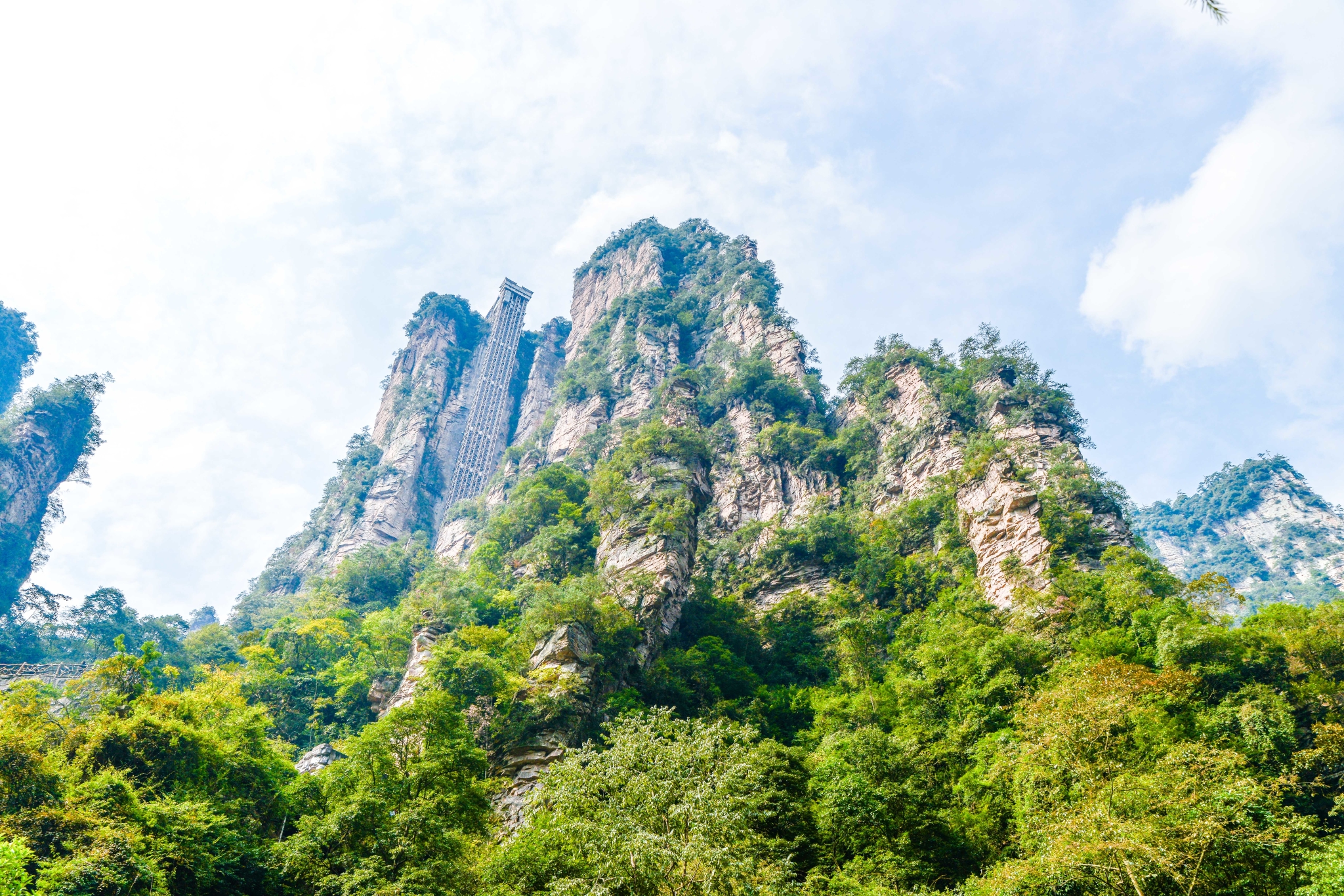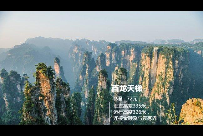 哈利路亚山| 原名“南天一柱”,因是《阿凡达》悬浮山的原型,被改为哈利路亚山。百龙天梯| 垂直高差335米,运转高度326米,全暴露式观光电梯,衔接起袁家界、金鞭溪。