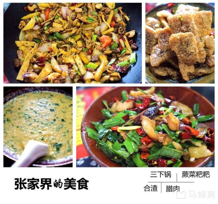 张家界美食,尤其要尝一下当地特色的三下锅,肥肠、猪肚、牛肚、羊肚、猪蹄或猪头肉等选多样,一锅煮,有干湿两种,口味较辣,当地人可是把辣椒当盐用了。当地特色菜还有岩耳炖土鸡、蒸腊肉、蒸香肠,鱼口味新鲜。合渣,也是特有地方菜,当地人称为“懒豆腐”,土家族流传有“辣椒当盐,合渣过年”的民谚。的土家族美食除了辣以外,还特别钟爱腊、酸、腌制菜食。土家腊味菜系列有腊猪肉、腊羊肉等;酸辣菜系列有酸野薤、酸青菜等;土家家常系列有和渣、南瓜汤等;腌菜类有腌肉、腌鱼、腌辣椒等;野菜类有地米菜、野葛粉等。街上可以看到到处都是三下锅。所谓的三下锅其实就是一种很方便的干锅,它是由三种主料做成的炖着不放汤的火锅。推荐干煸肠子、干煸核桃肉和湘西腊肉三种混在一起炖,吃的同时还可以点一份酸萝卜,又脆又酸。来湘西,土家腊肉一定要尝尝。腊肉虽然哪里都有,但每个地方都有自己独特的味道。这是湘西地区的土家族过年必备食物,传承已有几千年的历史。筋道入味的瘦肉,半透明肥而不腻的肥肉甚至肉皮都有滋有味,都让人欲罢不能。的特产是三宝(葛根粉、蕨根粉、岩耳)和一绝(杜仲茶),这里的猕猴桃、青岩茗翠茶、龙虾花茶、松菌都很有名,还有盐豆腐干、茅坪毛尖茶,腊肉加工成的小食品等等,都是很不错的特产。纪念品有龟纹石、土家粘贴画、土家织锦等。比较大型和齐全的购物场所有广和购物中心和梅尼超市等。