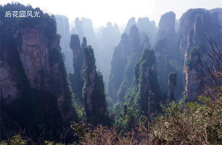 袁家界和黄石寨、鹞子寨隔着金鞭溪拱卫鼎立,遥相呼应,中间的一片群峰就是后花园,当然这是从袁家界的角度说的,从黄石寨的角度看就是前花园。