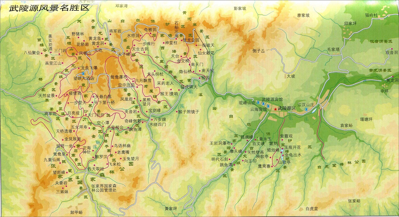天下第一桥分景区简介:天子山天子山自然维护区是 中心景区的重要组成局部。它东临索溪峪自然维护区,南接 国度森林公园,西连杨家界景区,绵亘盘绕近四十公里,总面积近百平方公里,至高点天子峰海拔1262.5米,最低海拔534米。因宋代土家族首领向大坤在此率众起义,自称“天王”,后来殉难于此,故名天子山,更有“峰林之王”的美称。上面的天子山指广义的天子山自然维护区,范围很大。而狭义的天子山景区普通指贺龙公园、点将台和神堂湾这3个连在一同的景区。下图是点将台入口处所拍的景区表示图,可见从天子阁到月亮垭之后分为两条路,左侧的卧龙岭和右侧的南 天门 道路,都能够下山去索溪峪。
