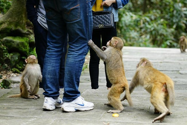 金鞭溪和山水一样出名的,就是这里的猴子。在金鞭溪一路走来,差不多能看到上百只野生猕猴,因为游客的喂食,所以猴子也都喜欢在这里等着。这里的猴子总体还是和人很友好的,大部分猴子都是凑近了等着游客喂食,不过也有性急的猴子,不等游客打开袋子,就扑过来抢,动作迅速,让人措手不及。