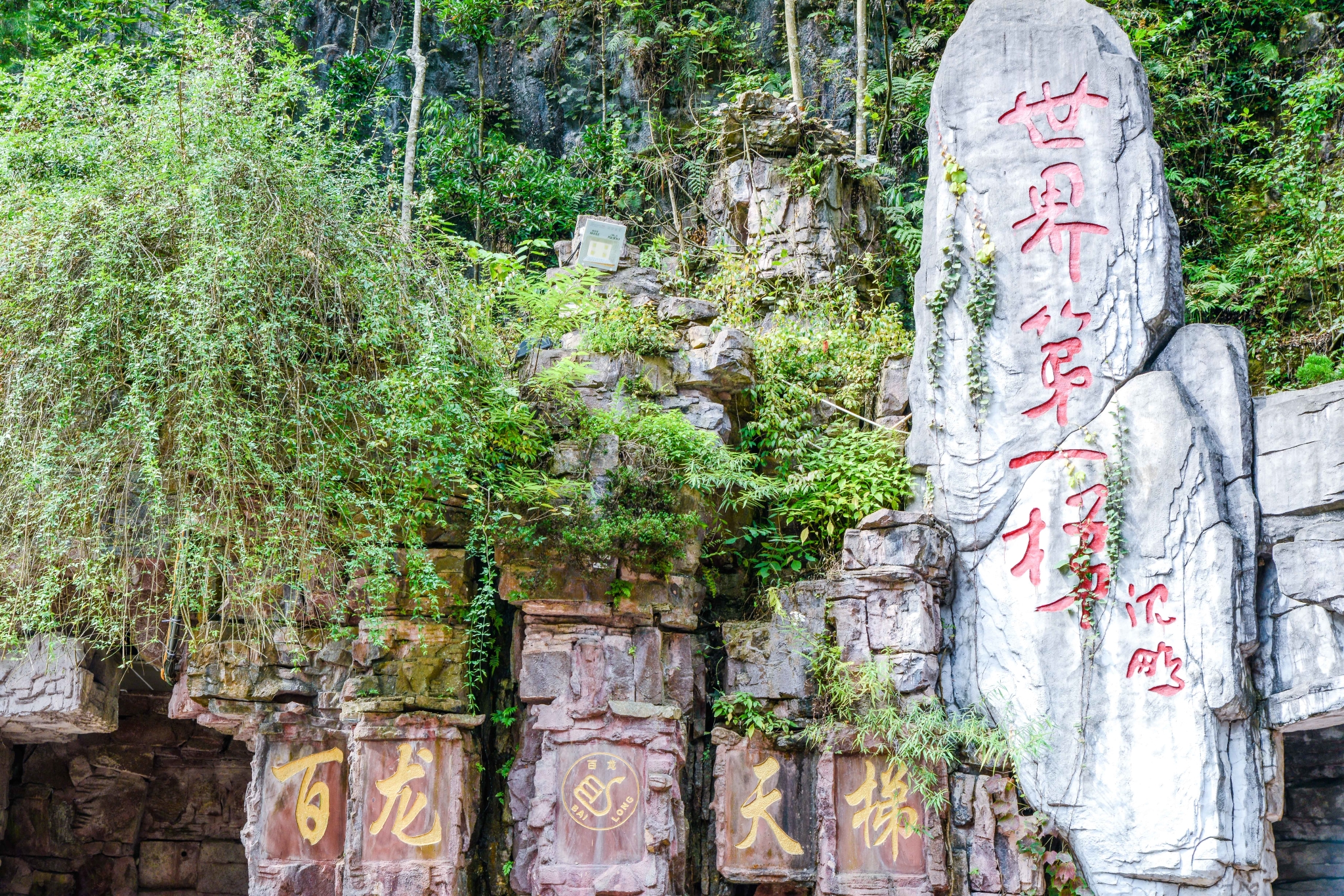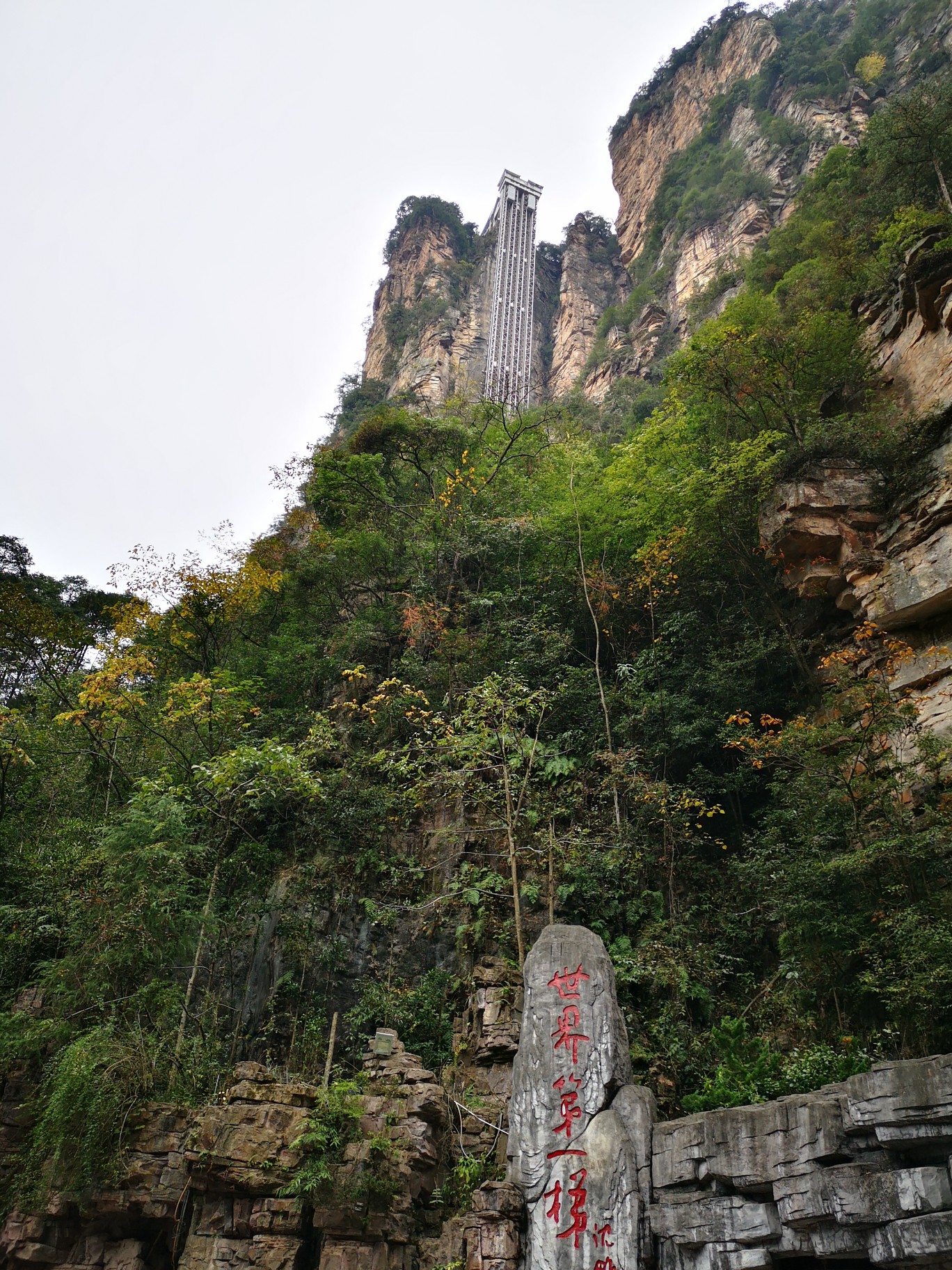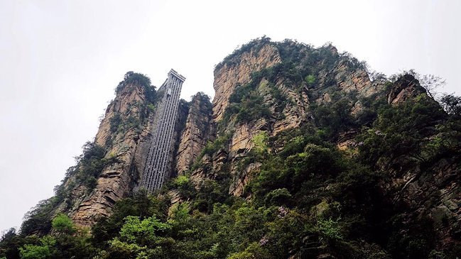 从金鞭溪坐观光车来到百龙天梯,百龙天梯是的一道宏伟靓丽的风景线。百龙天梯垂直高差335米,与山一样高的户外电梯,高耸入云,有着欲与天公试比高之感。,只有乘上电梯才可以到达袁家界和天子山。