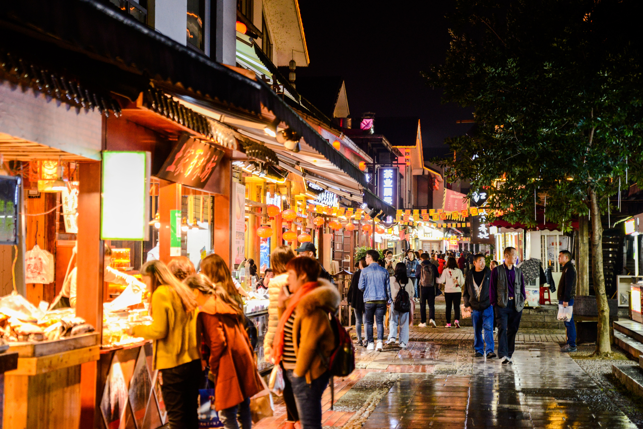 几个人在那里一边欣赏夜色,一边尝着特色小吃,美滋滋的生活。整个溪布街都是那诱人的香味,让人垂涎欲滴呀!