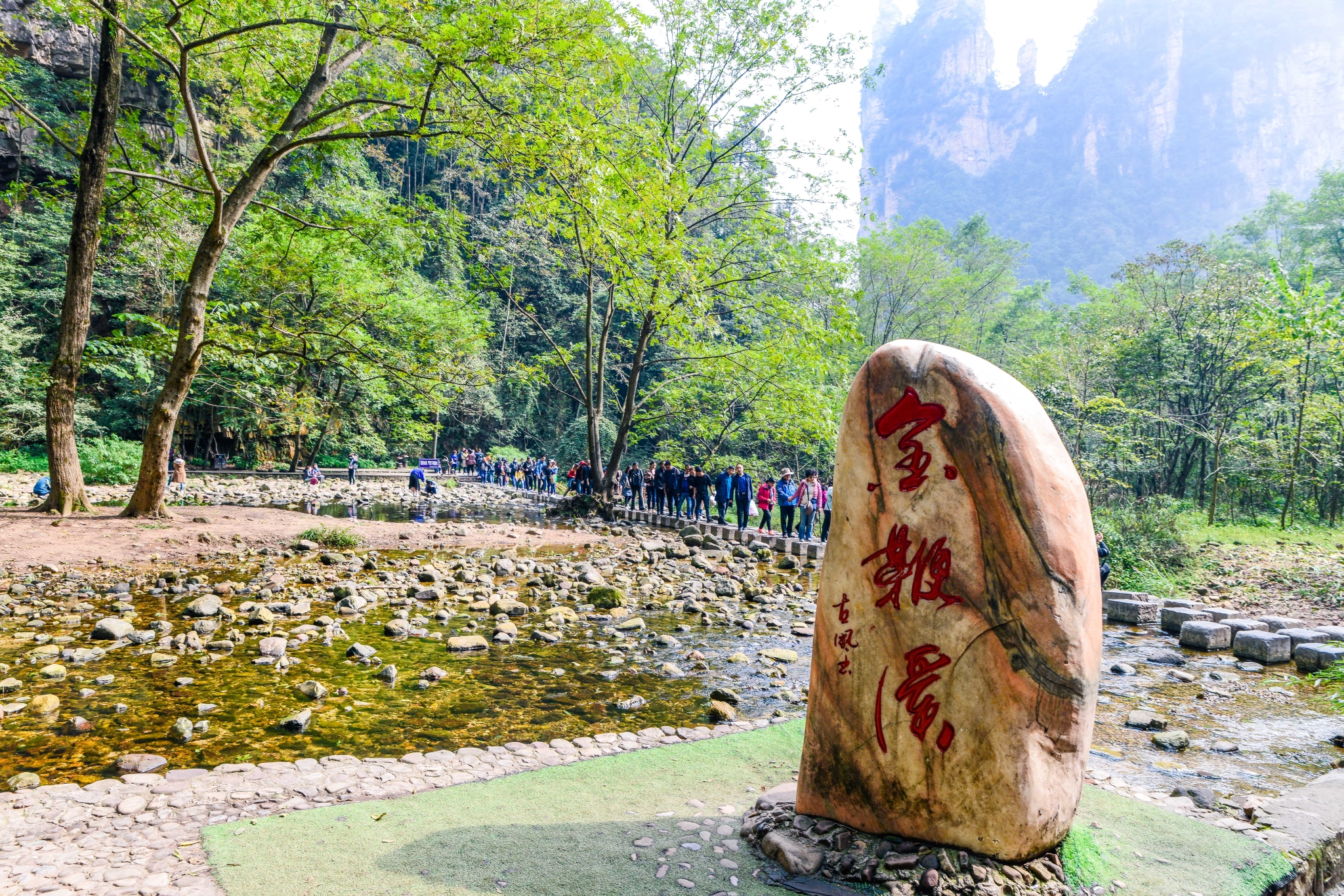 大氧吧广场,这里是金鞭溪的起点,四周青山叠翠、绿树成荫、空气清新,确实是一个好得不能再好的天然大氧吧。金鞭溪大峡谷以峰称奇,以谷显幽,以林见秀,以水为魂。峡谷两侧石峰拔地而起,形态各异。峰林间峡谷幽深,树高林茂,满目青翠。溪流潺潺,清澈见石,鱼儿欢欢,游翔浅底。