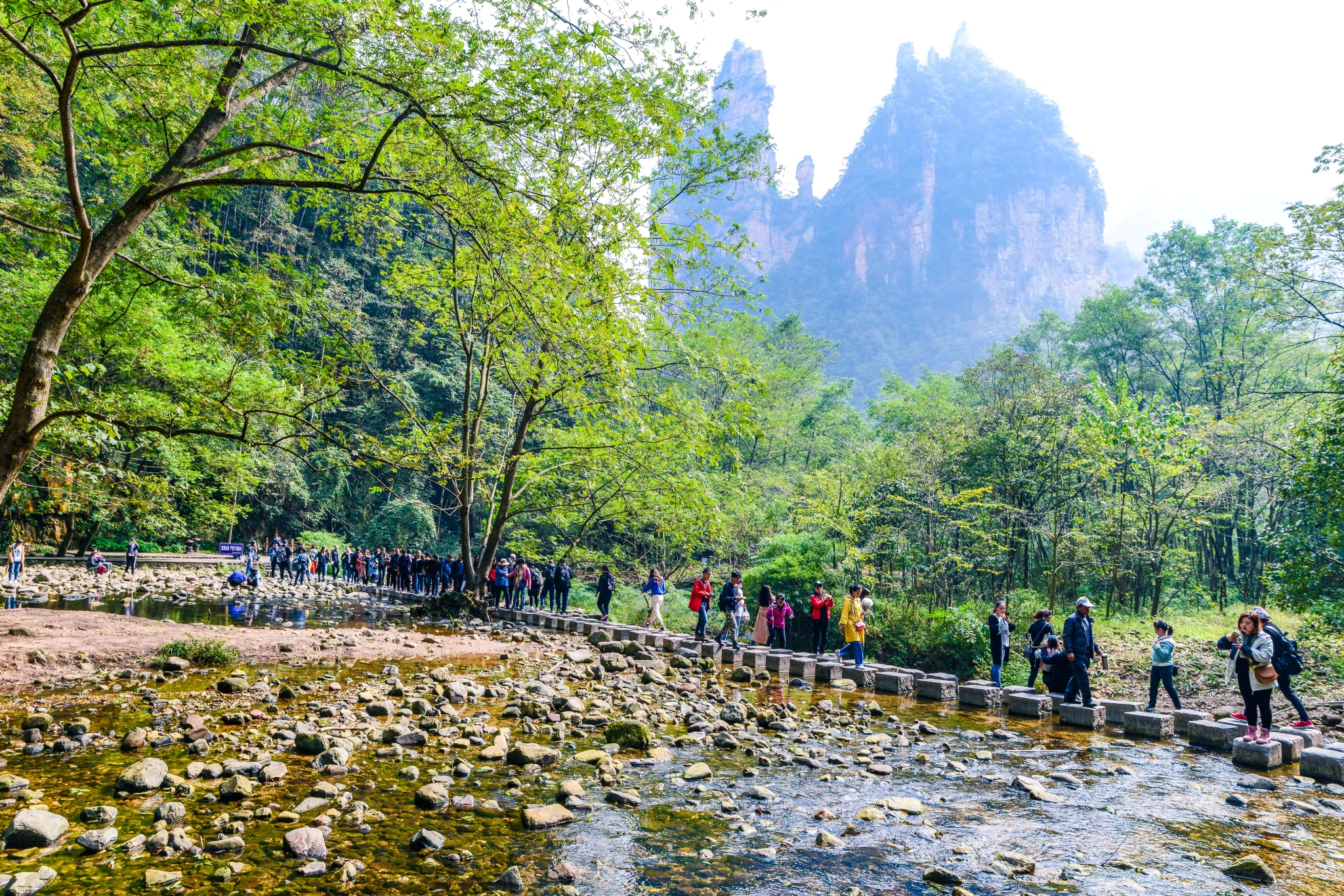 徒步金鞭溪的强度可不低啊,有老人和孩子同行一定要早一点进公园,一是早晨温度低,走起来比较凉爽,二是走完金鞭溪正好是中午,可以坐百龙天梯到山顶吃午饭,否则的话时间会来不及的。金鞭溪虽然很长但是景色实在太美一点都没有觉得枯燥,拍起照来也是活蹦乱跳的。