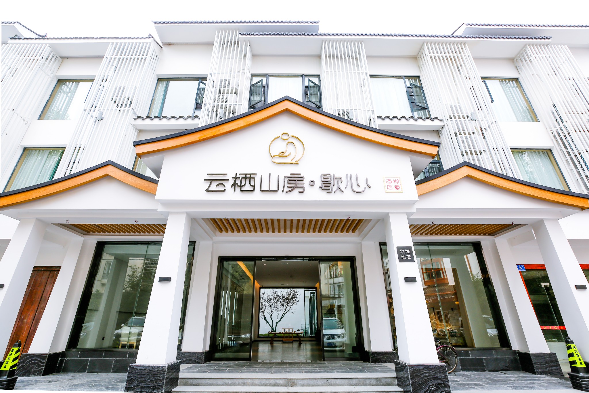 穿过庭院乘电梯上楼,整个庭院的风光展露无遗,青瓦黛墙,白色的墙壁搭配原木窗棂,完美运用了新中式的精髓,每一个细节都让人眼前一亮。