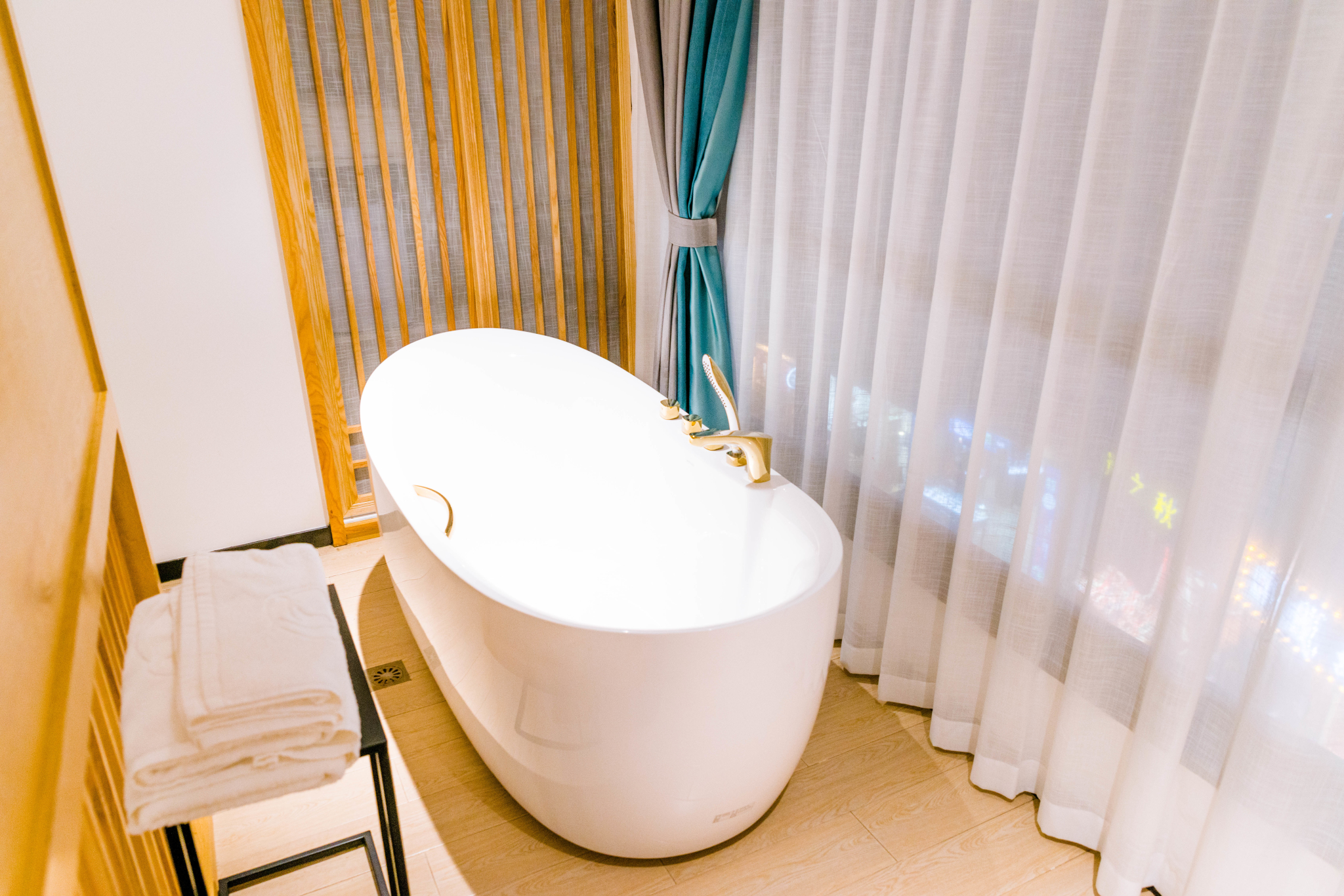 在窗台一角,隔着原木屏风是TOTO品牌大浴缸,从森林公园回来的晚上在这舒服的躺着泡个澡,闭上眼,静静的享受这难得的惬意时光,洗去一身疲倦。