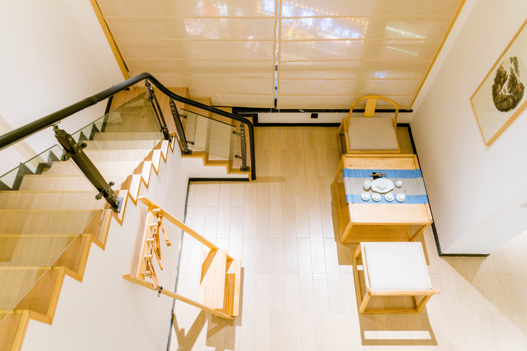 简约风格的楼梯,搭配着禅意十足的茶几,夜晚,和好友一起,泡一壶茶,共话往事,轻触流年,甚是难得。
