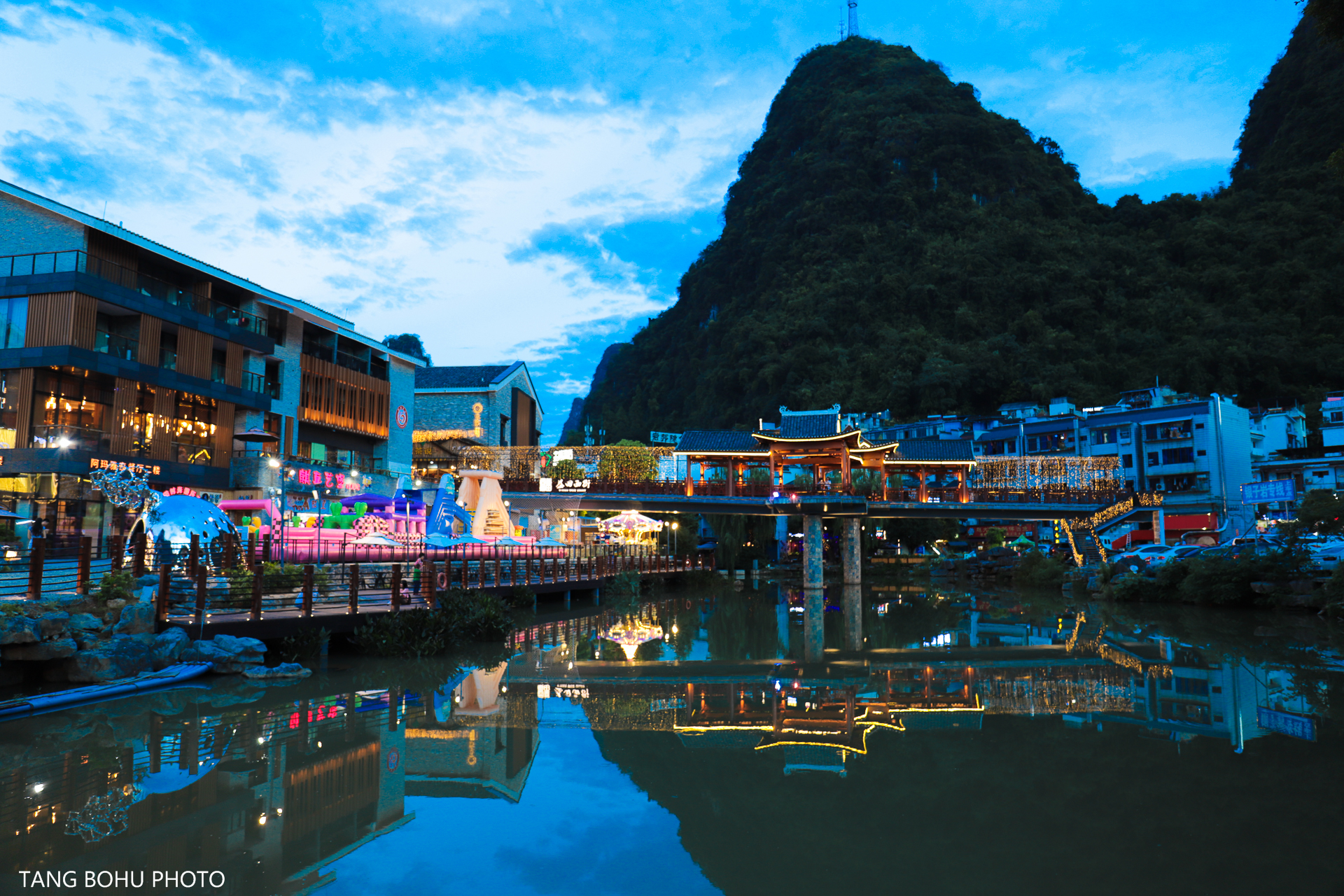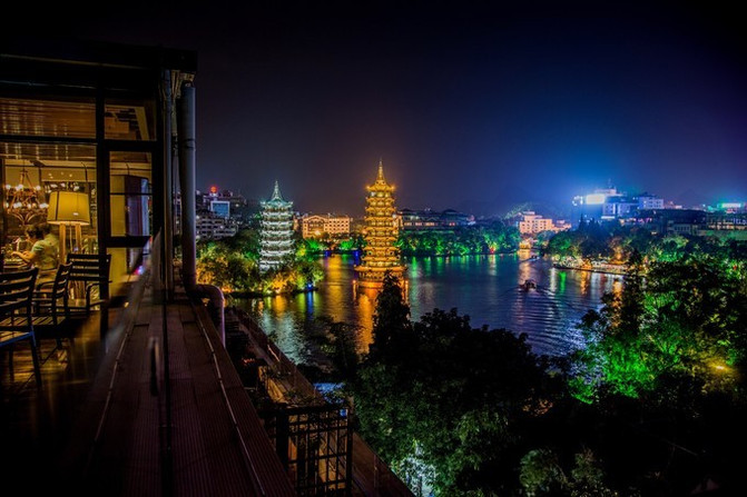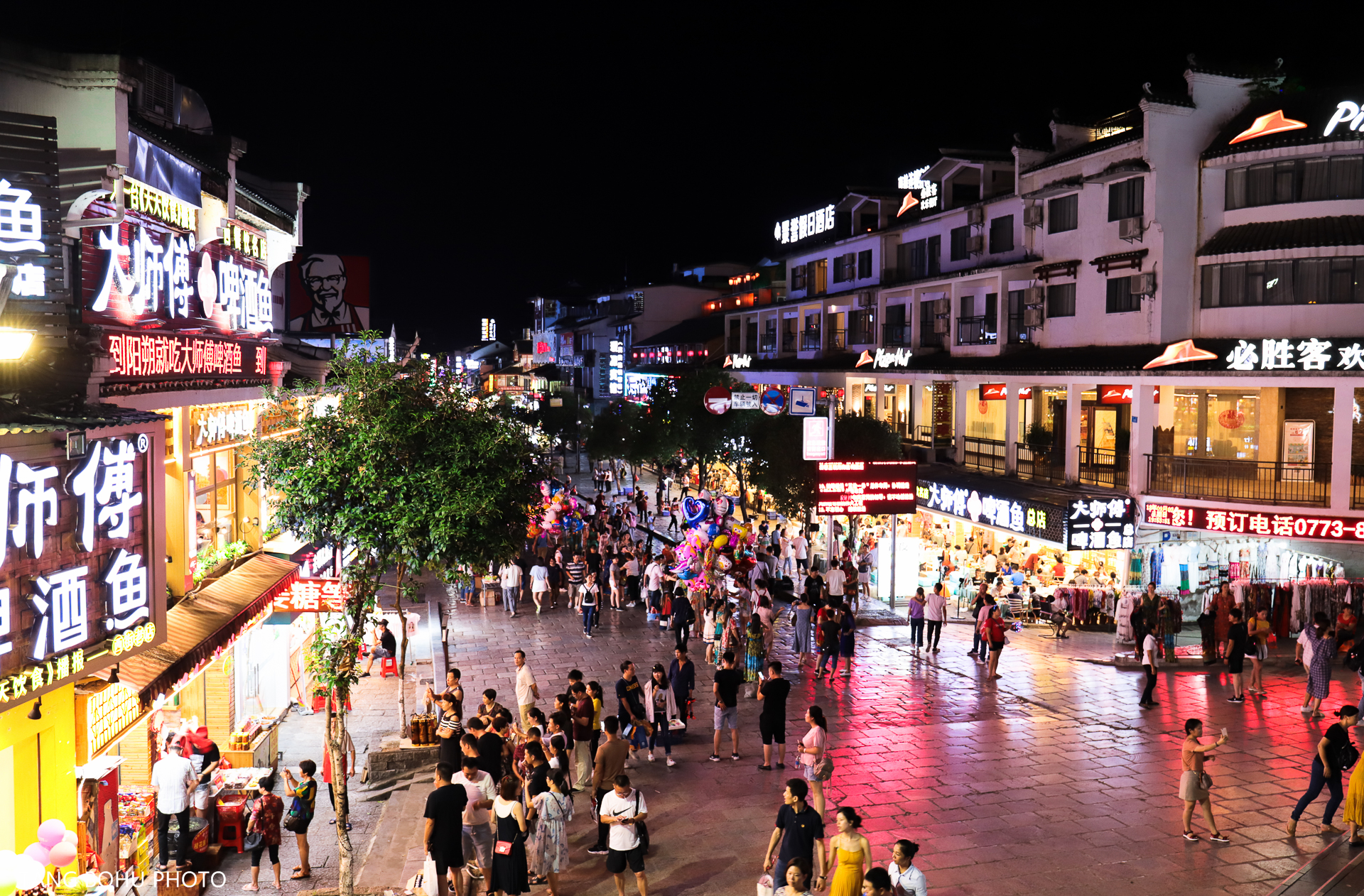 的夜色让人陶醉,走在 西街 的往 漓江 的一侧,远远就能听到驻唱歌手下在酒吧里喝着歌。街上有很多酒吧,到了晚上就变成了热闹的天堂一样,各种音乐响起,歌声在整个 西街 里远远流荡着。人来人往,深夜游客们纷纷回到各自的住处。 西街 旁边,五颜六色的灯光照耀古老的建筑与茂盛的树木,显的夜景更佳的迷人,更佳的光彩夺目。