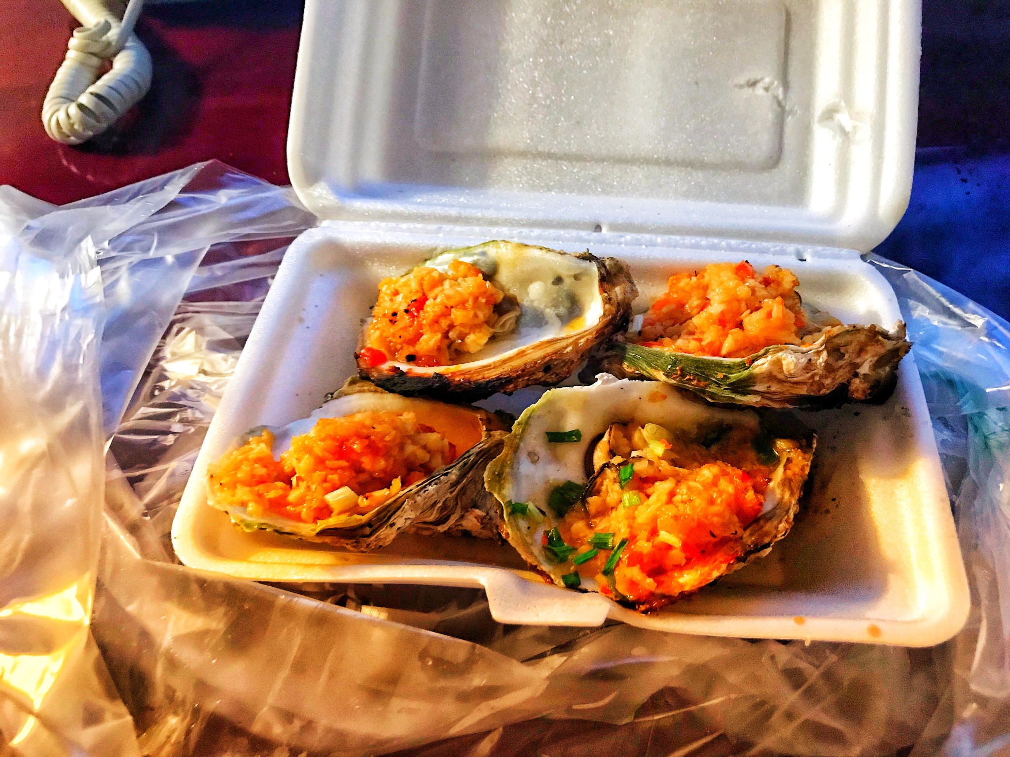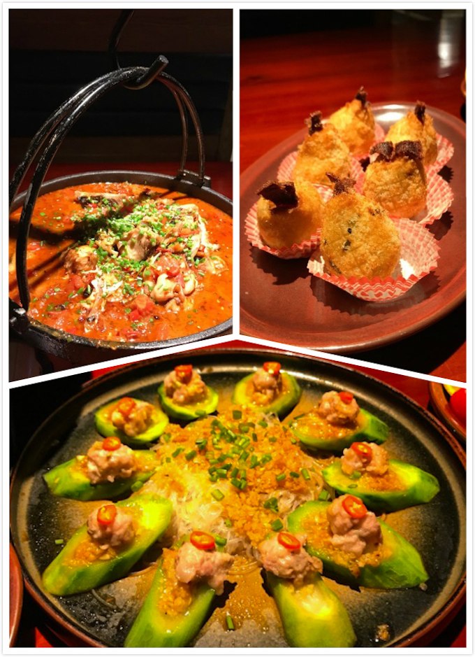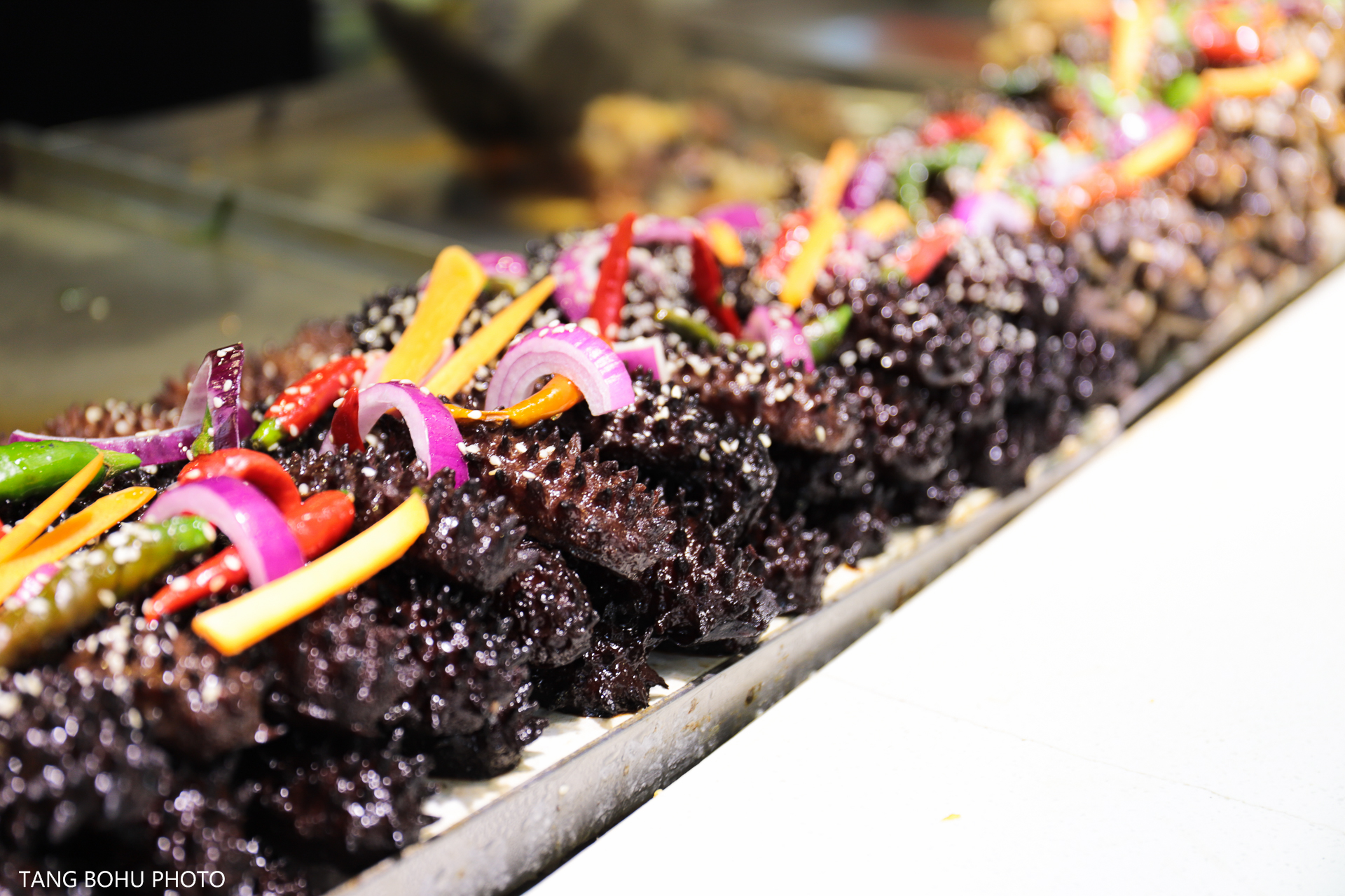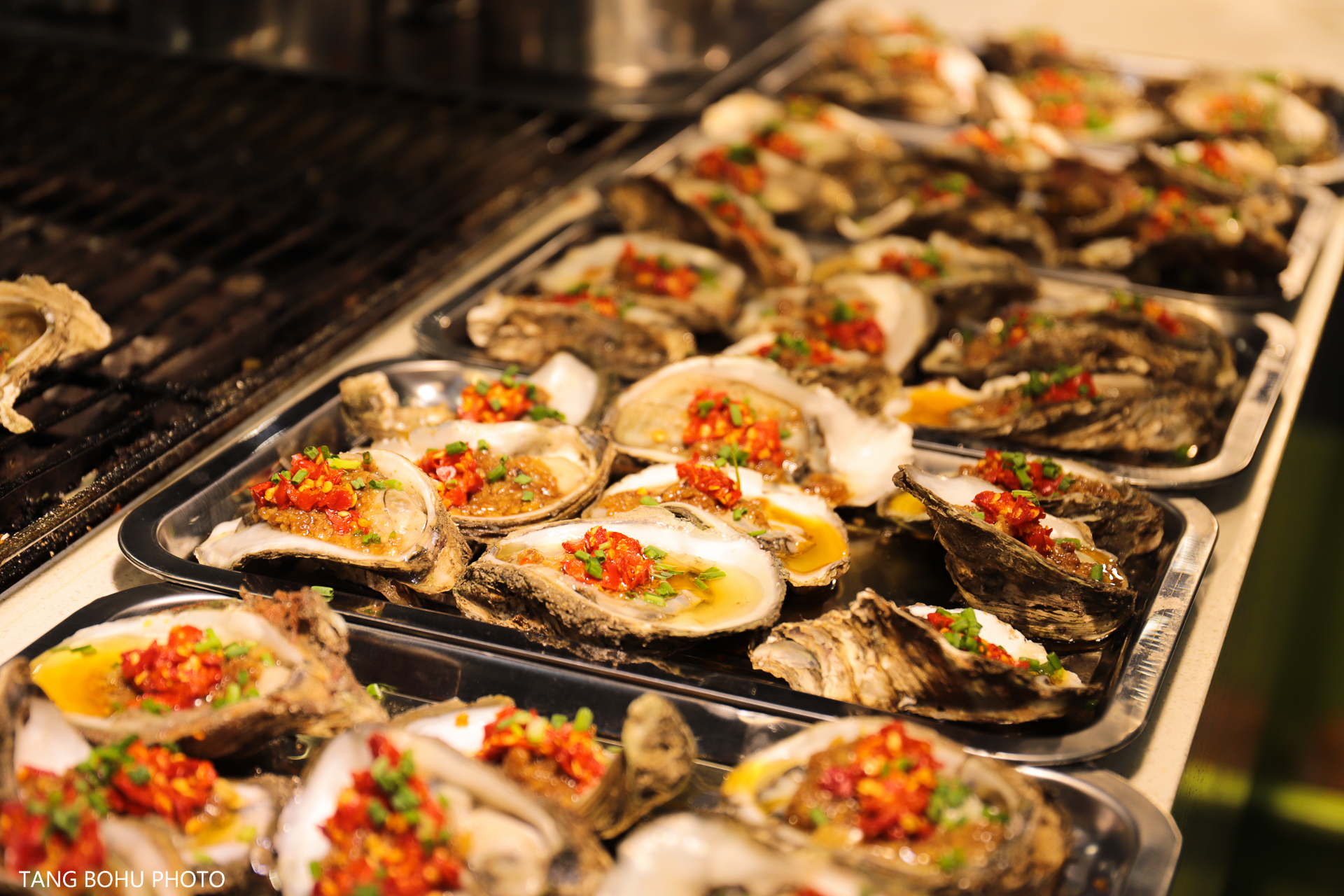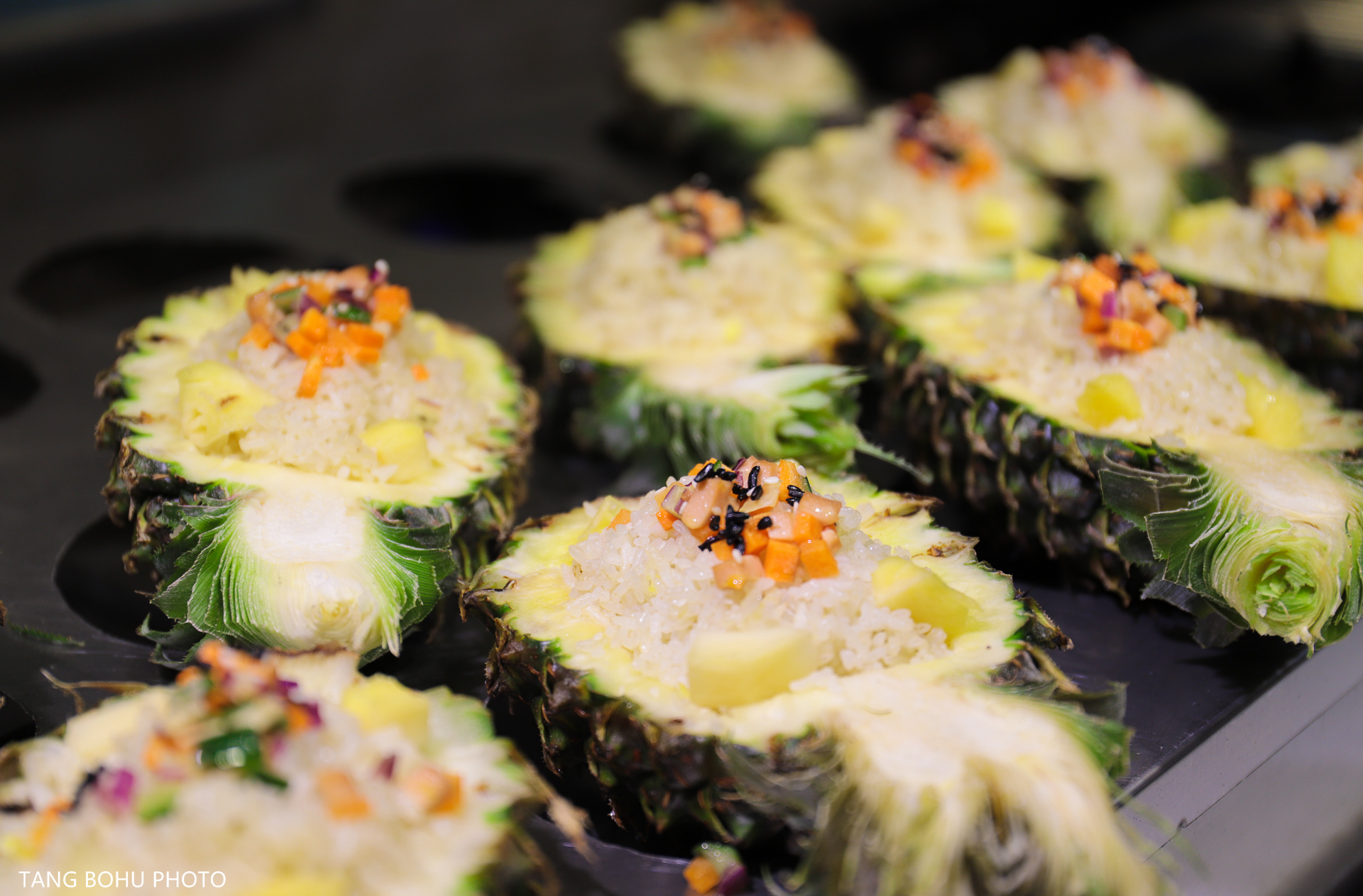 菠萝饭感觉和炒的不太好呀,和 泰国 的菠萝饭简直无法比呀,看上去就是白米饭直接放进菠萝里一样,炸豆腐的颜色诱人,烤生蚝,还有一种多种颜色的甜品,看上去就想去吃吃那个味道如何。