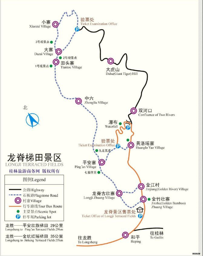 【第一天】如果上天再给我们一次机会,我是绝对不会再选择在10月1日出发,上午9:00左右出发,从广州到县城也就566公里左右,正常来说,下午4点多5点可以到达县城。原计划是到达后,傍晚和晚上可以逛逛县城,吃吃小吃,买一下土特产,养足精神第二天开始真正的行程。但是人算不如天算,当天一路上遭遇数次超级大塞车,短短500多公里路,上午9:30直到晚上凌晨12:30,才到达县下榻的酒店(县碧莲大酒店,算是县城里比较好的酒店,旅游旺季大概280元/晚),足足开了15个多小时!!哎,也没办法,谁让这是黄金周呢!这一天累不堪言,没什么可以过多叙述,还是早早休息,第二天开始真正的旅程吧!【第二天】从县城的碧莲大酒店出发到景区,大概30多公里全是不好走的山路,合起来也要开1个多小时的车。到达景区后,正常来说,车子只能停在景区山下的停车场,然后拿上行李徒步走上去。我们本想听从景区指示,停在大寨的停车场,然后徒步走到田头寨的,因为看地图以为不是很远。结果大寨停车场满了,指示让我们去小寨,虽说看着地图觉得不是很远,但我们毕竟有一位年纪大的老人家,于是打电话问客栈老板如何是好。这一通电话改变了整个战局,客栈老板一听我们被引导去小寨,很焦急叫我们不要去,从小寨回来远得很,让我们回来景区售票处,他安排了一位穿着民族服饰的老太太在正门候着我们,准备带我们上山。我们订的客栈在田头寨,这里有必要放一张的游览图上来解释一下,我们选择田头寨,因为他距离1号、2号、3号观景台,距离都挺近(看起来)。