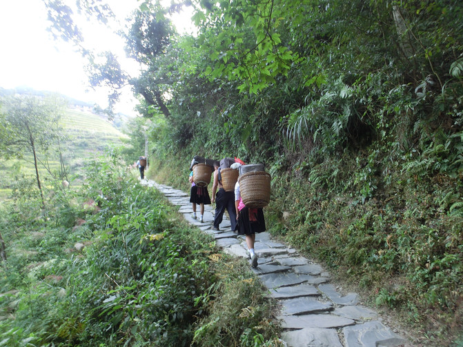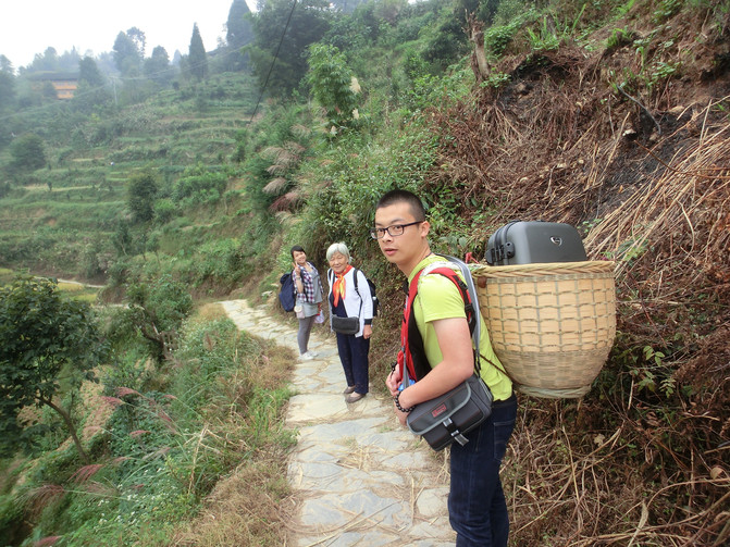 来到寨子上,才知道有客栈的小老太太开路,我们把车子开上山省了多少力气,路上很多徒步上来的客人体力不支,都花钱让村民帮忙背行李上山来。