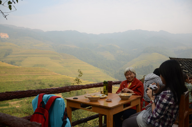 入住了山上的客栈,时间已经来到了下午,老爸老妈和外婆已经累得不想动了,他们决定就在客栈的观景台上喝茶聊天。看这老太太笑得多开心~