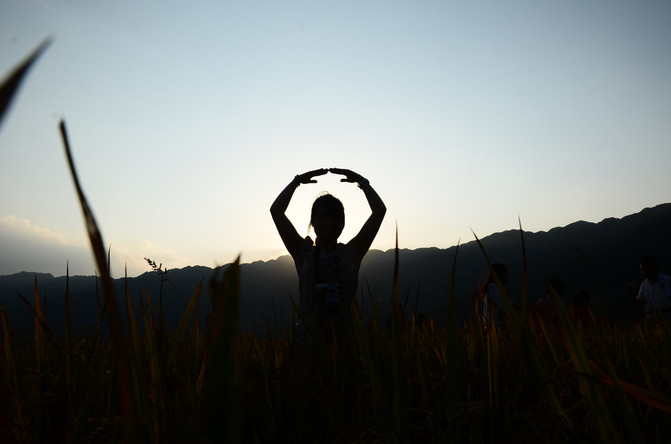 我和女友决定趁着天黑前,赶到金佛顶(即地图上3号观景台)看日落。从田头寨到金佛顶,客栈老板说,你们得赶紧走了,走过去也得2个多小时,脚程快点或许能赶上日落。废话不多说,我们收拾一下,背起背包,拿着相机就出发,路上也没怎么赶路,看见好看的停下来拍照,手机APP显示日落时间为18:00,我们17:45分赶到了金佛顶,满眼的稻穗,金光闪闪,加上夕阳的照射,有一种说不出的丰收的满足感。