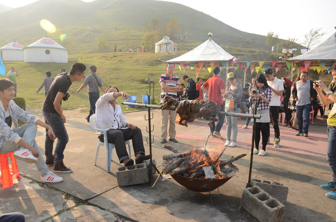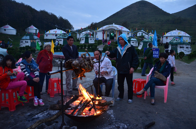 这里漏了说一件很重要的事,中午当我们从昨晚的宾馆转移来到蒙古包的时候,住在旁边蒙古包的邻居就开始找人凑分子晚上吃一只烤全羊。因为一只烤全羊可供10个人吃,人少了吃不完,最后我们和两家人预订了晚上的烤全羊,1600元一只,当我们看完风车回来的时候,看到营地里面的羊已经开始烤了……