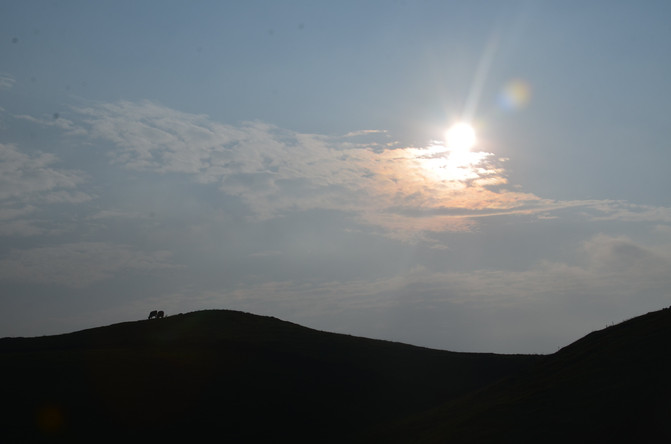 大厨说,烤全羊起码得一个多小时,趁着这会儿太阳还没下山,营地有一条小路可以通到这个山头的山顶,我们趁着天亮,又跑上去看日落去……刚爬几步的时候,回头照了一张么,一口气爬到了山顶,回头看营地,下面一个个白色的蒙古包就是我们的上来的营地,原来已经走了那么远了……