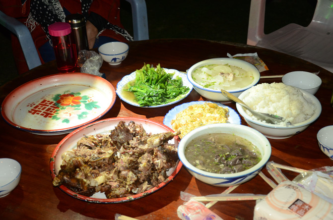 噔噔噔噔~~~整个晚上的重头戏开演了!在我们的蒙古包旁边开餐,不过晚上还是好冷啊……烤全羊看着不是很大,原来切下来好多,这一盘原来才是四分之一只羊,我们五个人根本吃不完……还分了一点给旁边的邻居……
