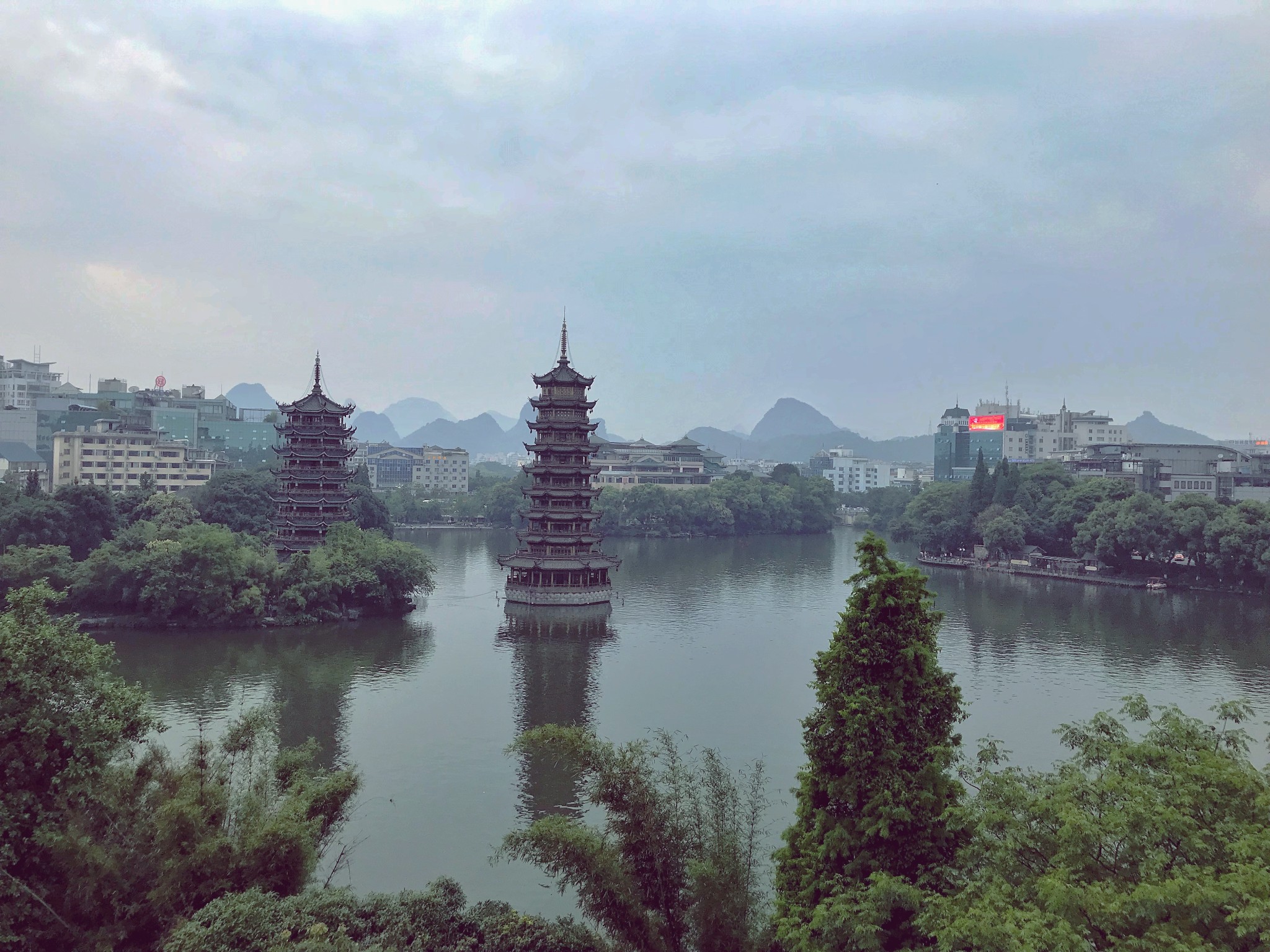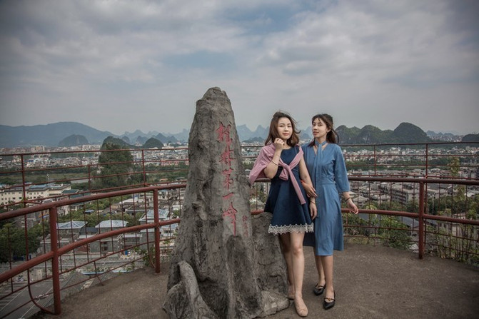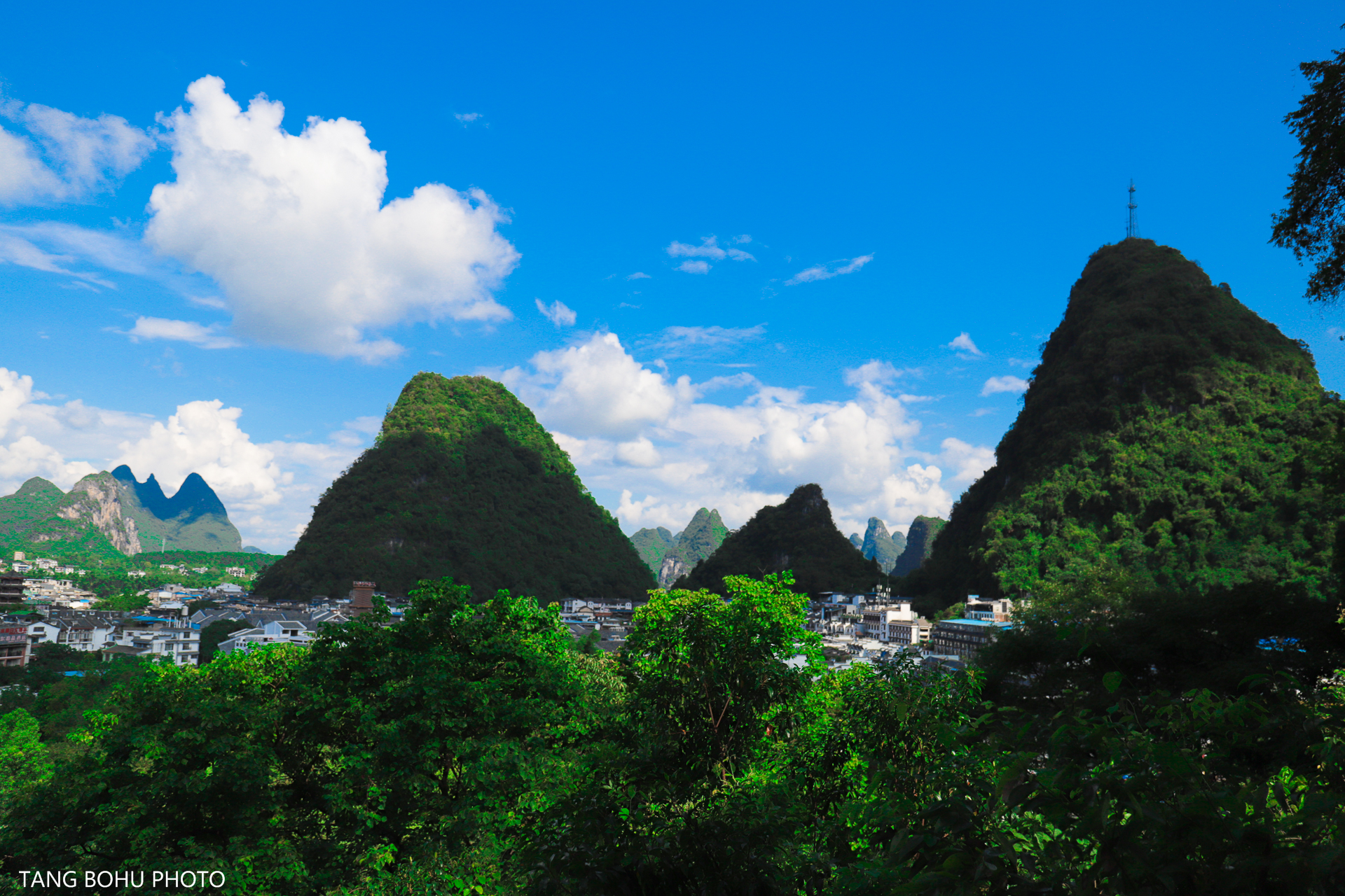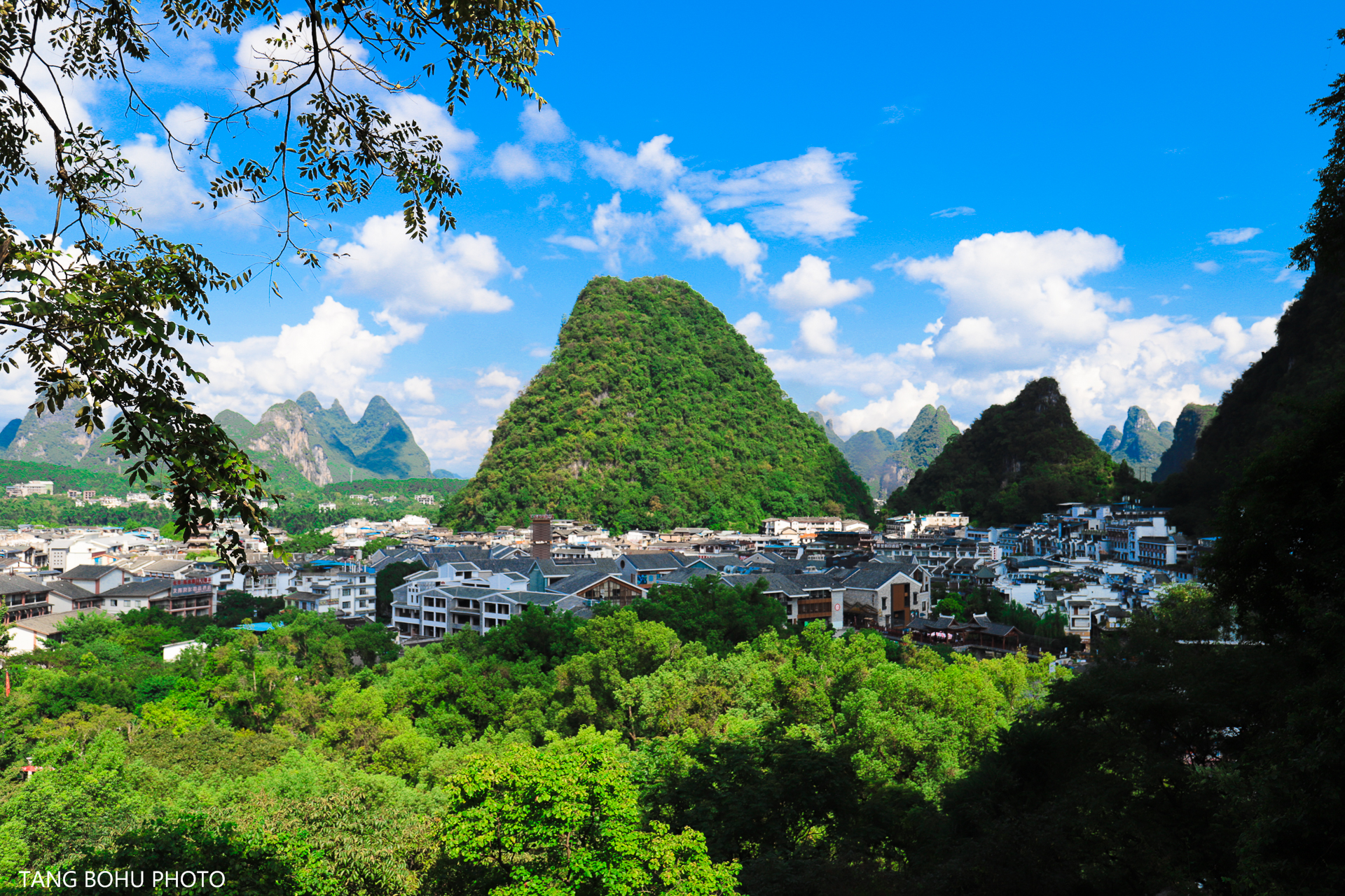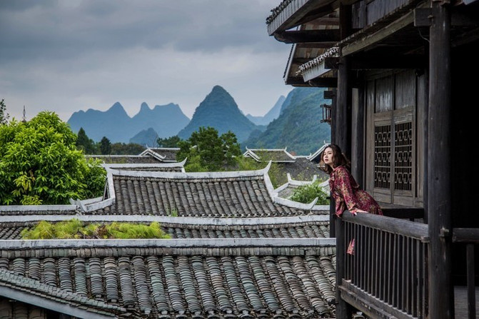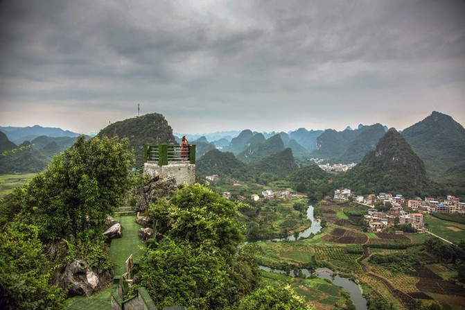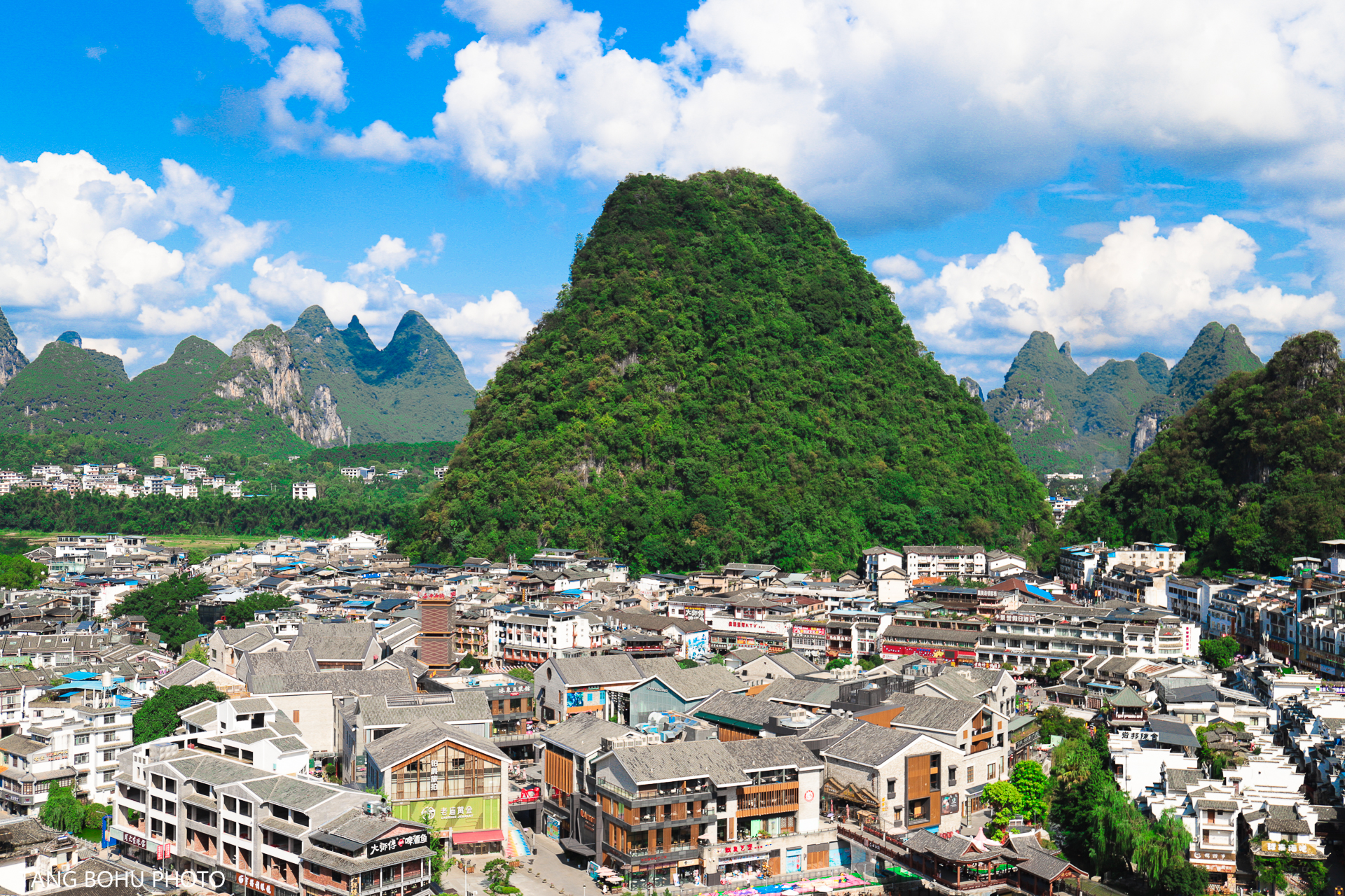 在往上爬最后一亭子叫卧云亭,这里就是整座山的最高点了,从亭子的一个门走出去又像是阳台一样的,视野更加开阔,整个 小城景色尽收眼底, 西街 ,民楼处处都能看到。云朵很低仿佛伸手就能摘到云朵一样。 山水是 中国 山水的代表,典型的喀斯特地形构成了别具一格的 山水,人在空中俯瞰 就你是在一幅彩色的油画中,处处皆色景呀。我们也经常听过“ 山水甲天下, 风光甲 ”说的就是 山水的代表其实都是在 这里。今日终于让我目睹了这一幅美丽的山水画。