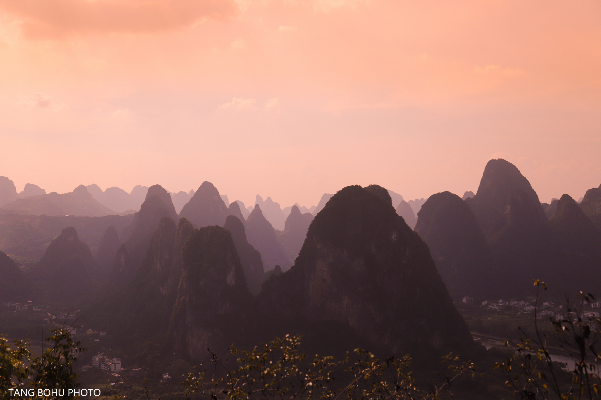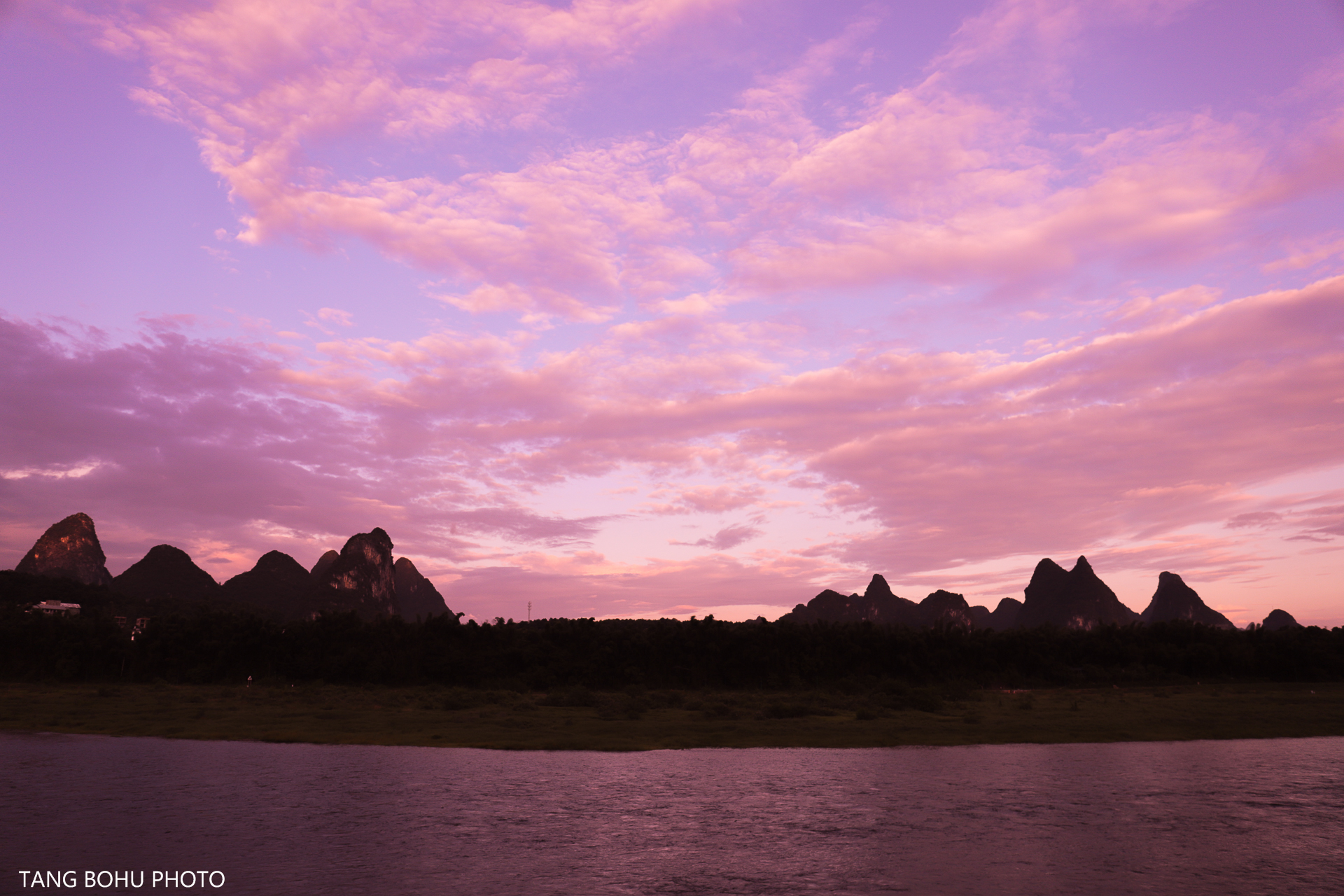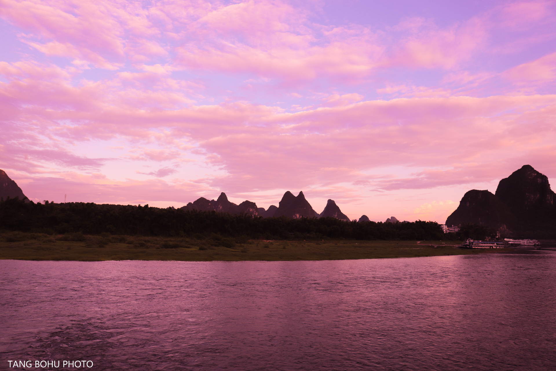 在漓江岸边遇见最美粉红色晚霞沿岸的风光是连绵不绝的山水画。人行其中,是喜悦,是欢欣,接踵而来的是流连忘返!有山,有水,山可作肴,水可作酒,能品尝一番如此美味,此生无憾!山亦为眉黛,水亦为胭脂,能闻一番如此清香,真可谓神清气爽,好景怡人。那么人呢,除了感觉到自己已是世外仙人之外,恐怕也只能感觉到次之的飘飘欲仙了。美丽的仙境近在咫尺,却总是若隐若现,难以留住变幻无常的身影。 漓江 的美,美在一年四季中,美在一江两岸里;她没有淡季旺季之分,没有白天黑夜之分。 漓江 多滩、多弯,一滩一色,一弯一景,源源不断地给人惊奇、给人兴奋,直到你美的疲劳。