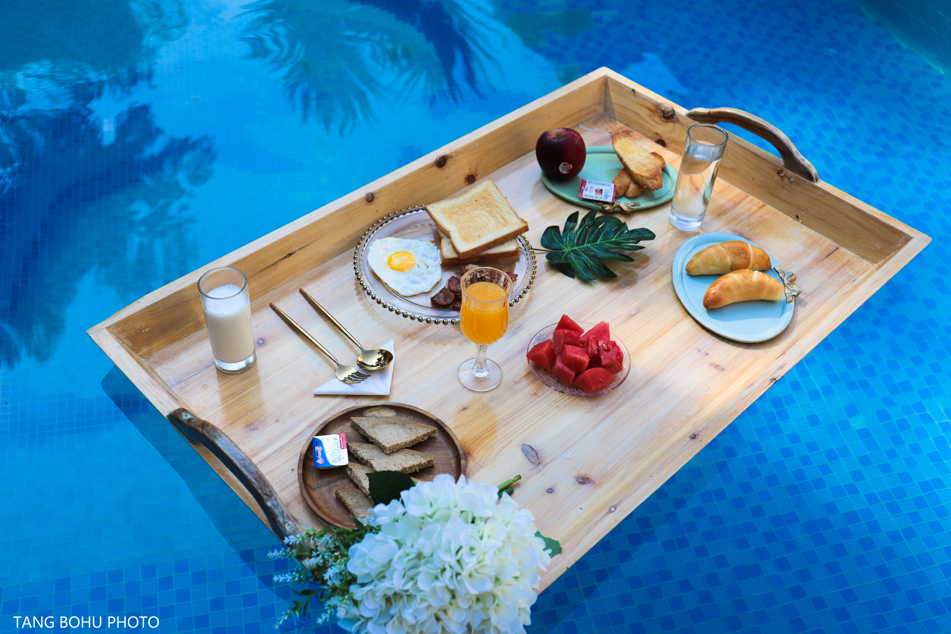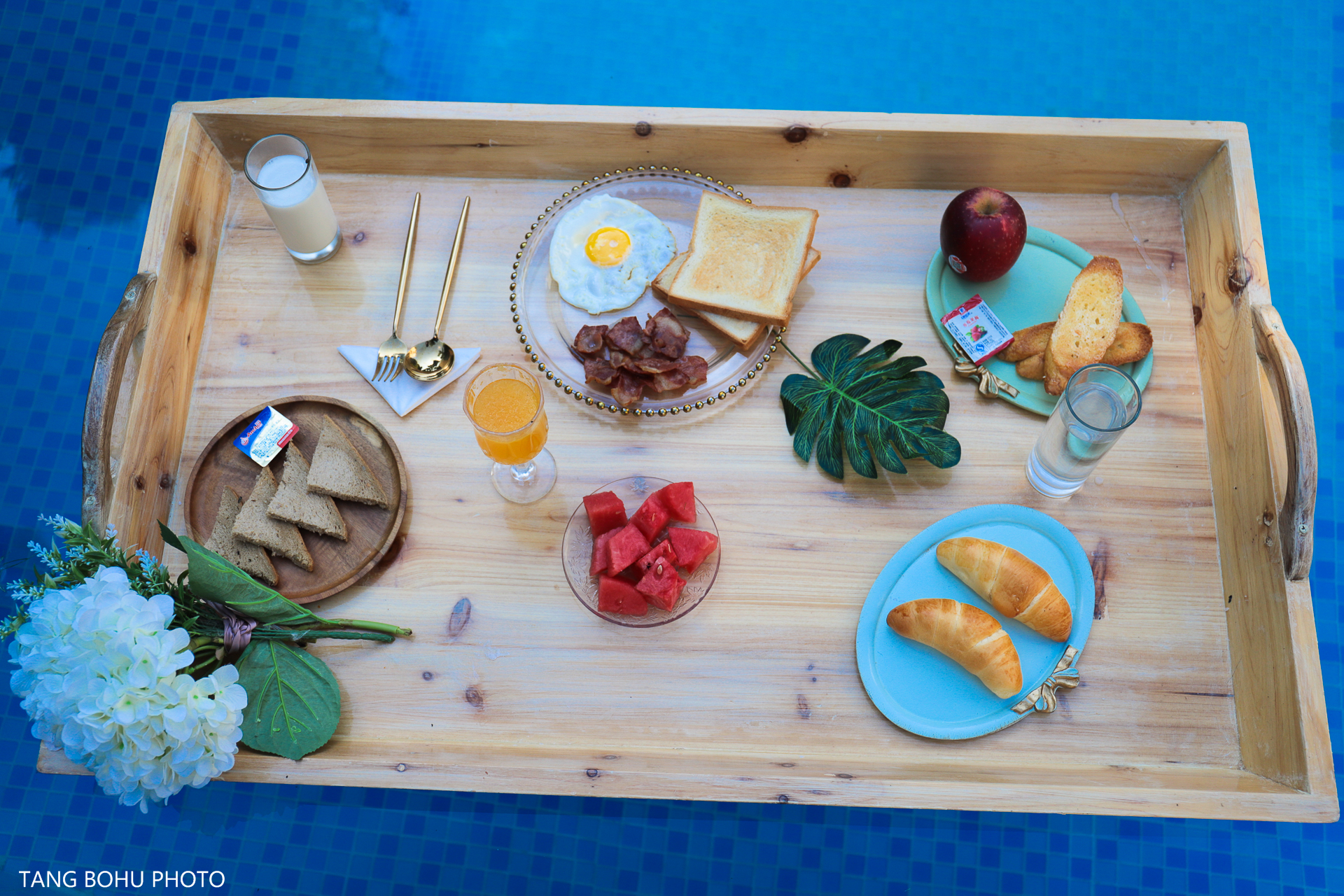 超火的网红漂浮早餐,吃个早餐也要湿身说到早餐,大家想到的都是最普通的在桌子上吃早餐吧?但是最近境外网红们都流行到泳池中央吃早餐啦!我也体会一下漂浮早餐在 雪狮岭江畔酒店就可以吃到了。顾名思义漂浮早餐就是把把精美的美食摆在木质托盘上放在游泳 池上 ,美食漂浮在蓝蓝的游泳 池上 ,女孩子就有福了,这个时候就是你展现比基尼的时候,穿着比基尼一边在泳池里吃着美味的早餐,一边慢慢欣赏太阳冉冉升起,周围的山犹如美丽的画卷一般把你融入这幅画中,慢慢享受这份惬意的早餐吧。