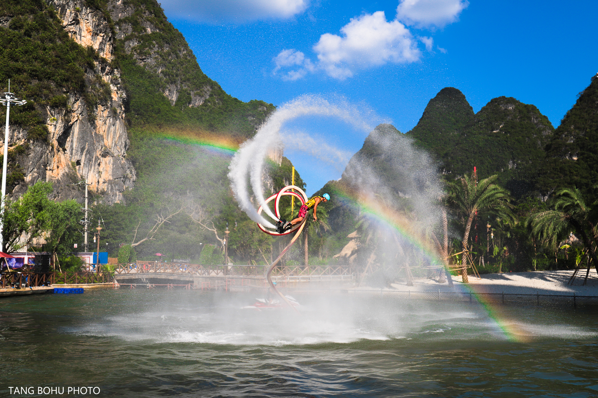 只见一个黝黑的皮肤小伙子出现在湖中,随音乐的响起,表演者在空中表演后空翻等各种动作,溅起的水花划过一道道美丽弧线,在太阳的照射下一道美丽的彩虹就出现在眼前了。游客响起了一阵阵掌声。表演者在空中做起了各种高难度的动作,华丽的动作,让人看了眼花缭乱,表演的小伙子想要飞上去就飞上去,想要空中翻转就翻转,技术太厉害了,控制得很好,不愧是空中飞人呀。