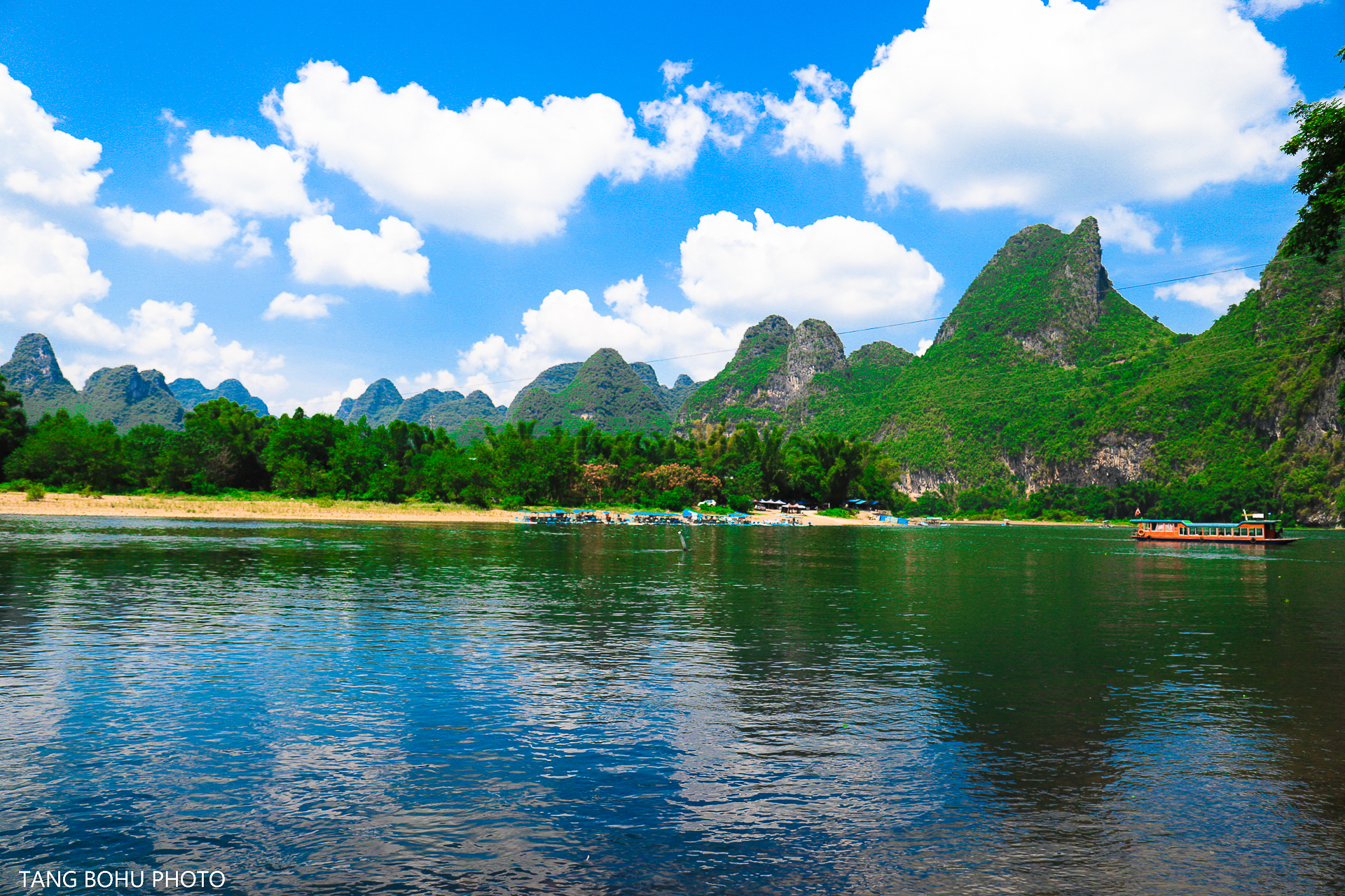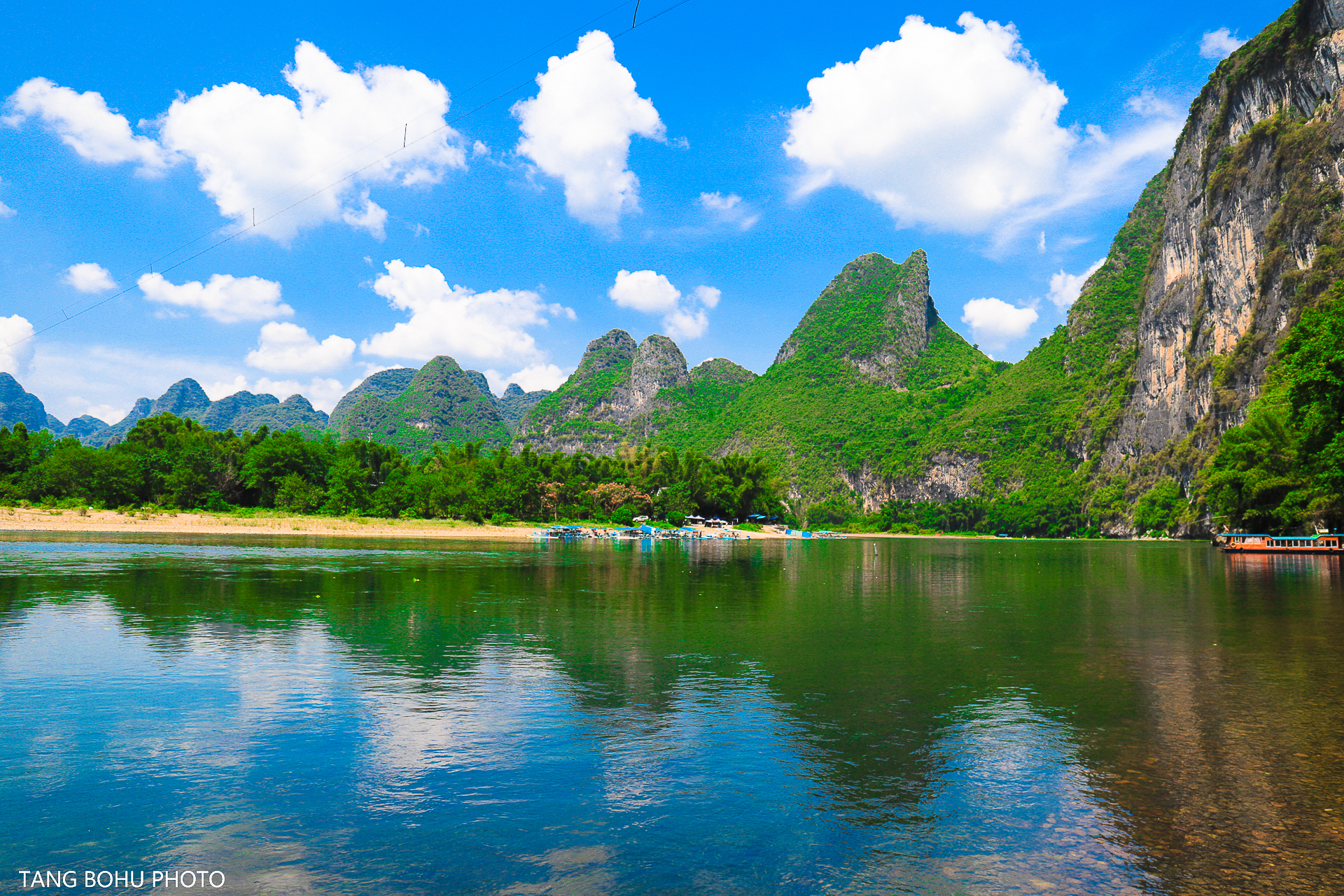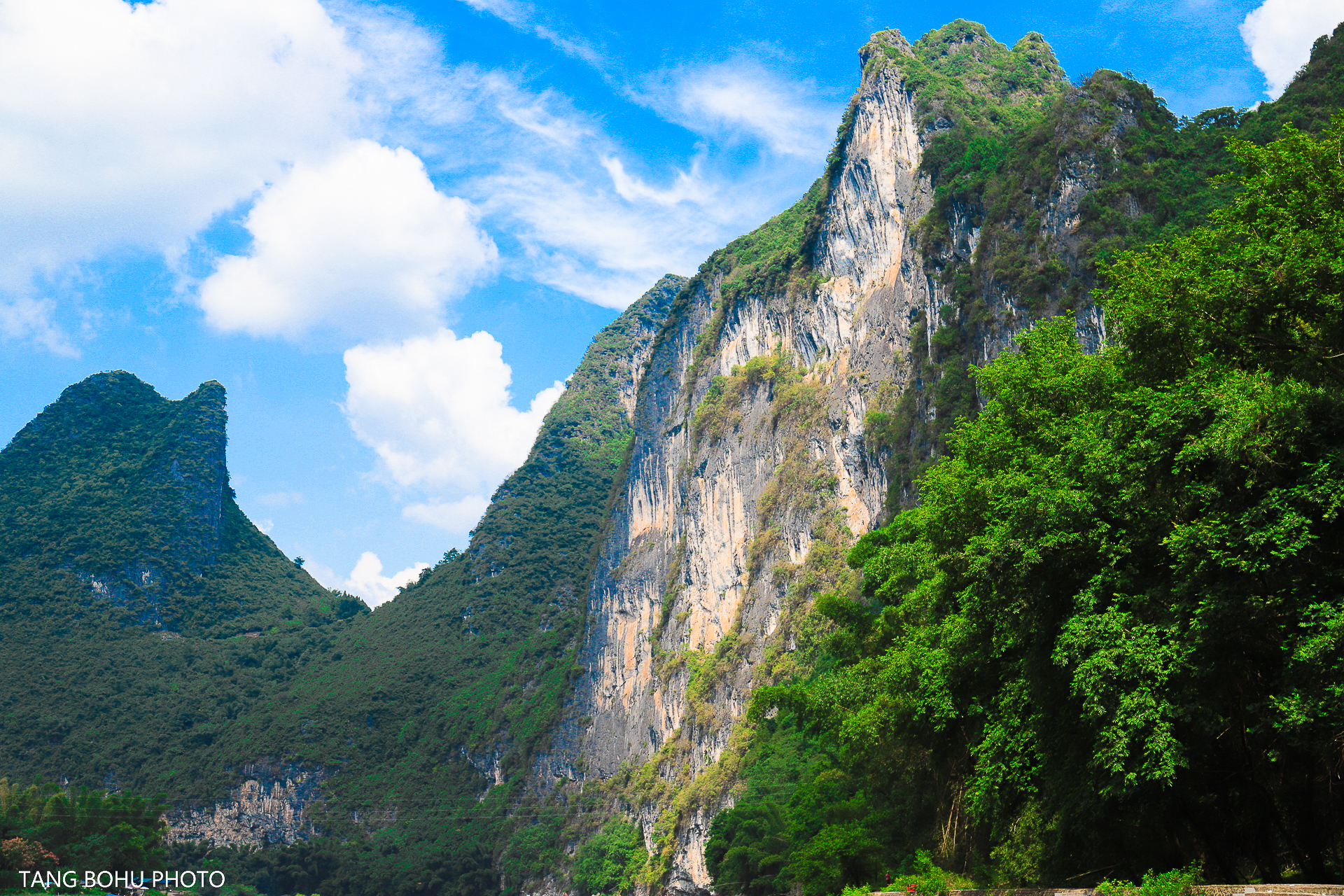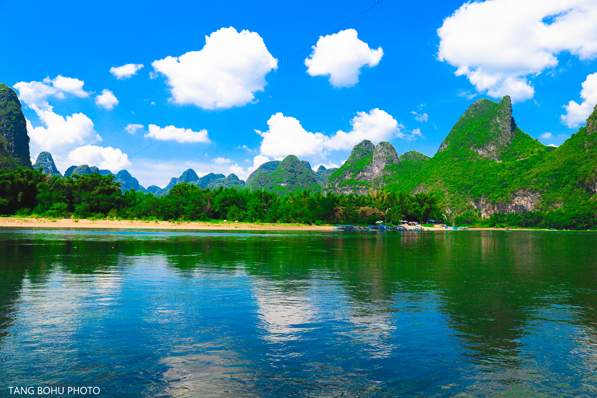 到 漓江 ,你不用整个身心与灵魂去极力想象,一定领悟不到她美的精华。单凭那拔地而起,各不相连,奇形怪状,姿态万千的青山。这座象女人,那座山象手套,左看象将军,右看象老妪,就连一窍不通的老外,抑或是嗷嗷学句的幼儿都指手画脚,描述的眉飞色舞。神奇的九马画山,不管你是笨拙或是睿智,都觉得是那样的栩栩如生,神态各异。似立似卧,似奔似跃,或俯首痛饮,或仰 天长 嘶,把客观物象的山水写意的如此多情而饱满!