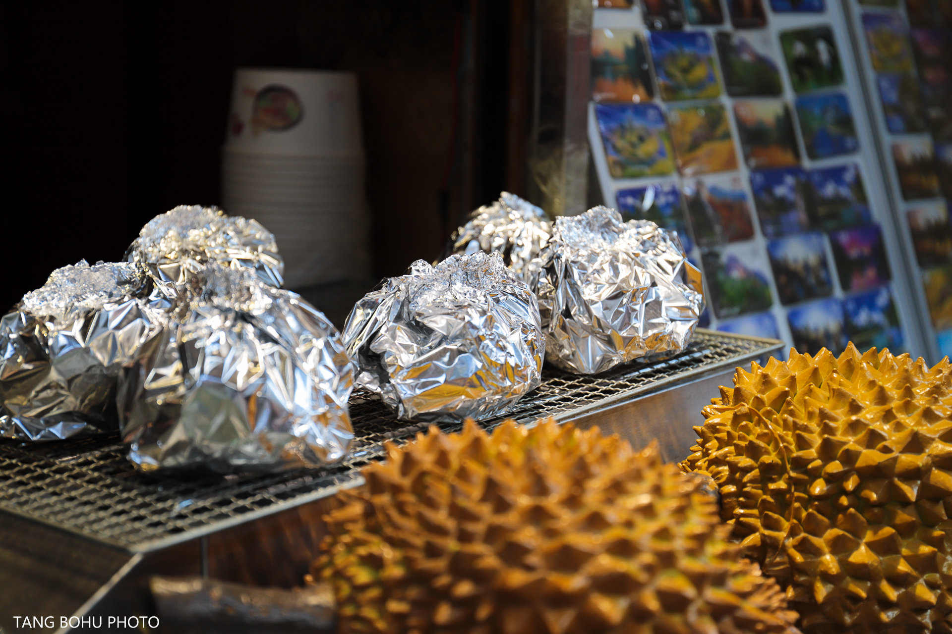 水果酸奶很特别,使用婴儿奶瓶装着,哈哈,我看没几个大人买呀,要是走在大街上一边走一边喝这样的酸奶我想回头率肯定很高呀。有见过榴莲,还没见过烤榴莲的,这不还真的遇到烤榴莲这种做法的水果。烤起来的榴莲应该味道很独特吧。除了美食店外,还有各种各样的艺术品,装饰品店。适合晚上慢慢的去逛街。