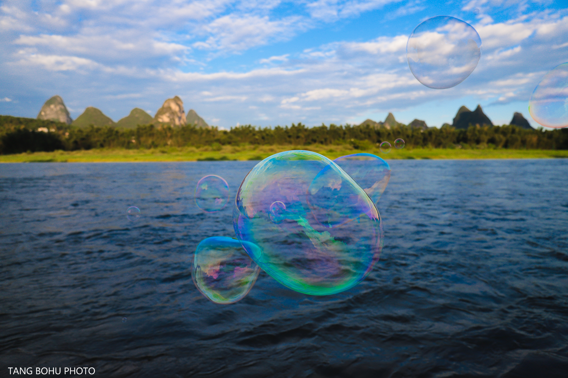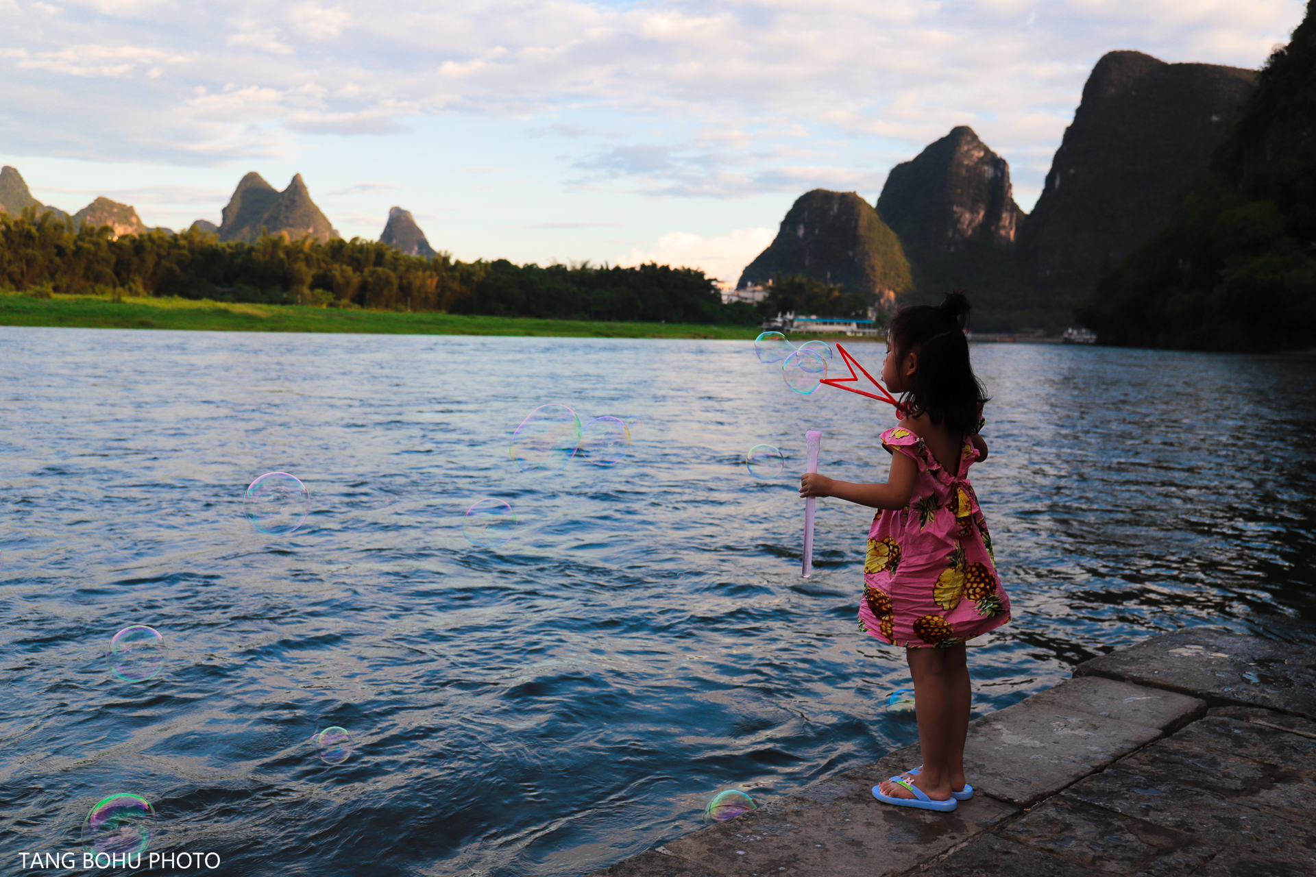 漓江 的岸边小朋友正在吹着气泡,气泡在 漓江 上飞舞着,傍晚的夕阳照在五颜六色的气泡上闪闪发亮。我走在 漓江 的岸边慢下脚步,坐在石板凳上静静地等待着日落。听见 漓江 水向东游去, 漓江 的江面上在微风吹佛中荡起一圈圈水波。夕阳慢慢地下山,在另外一侧云朵开始变得通红。