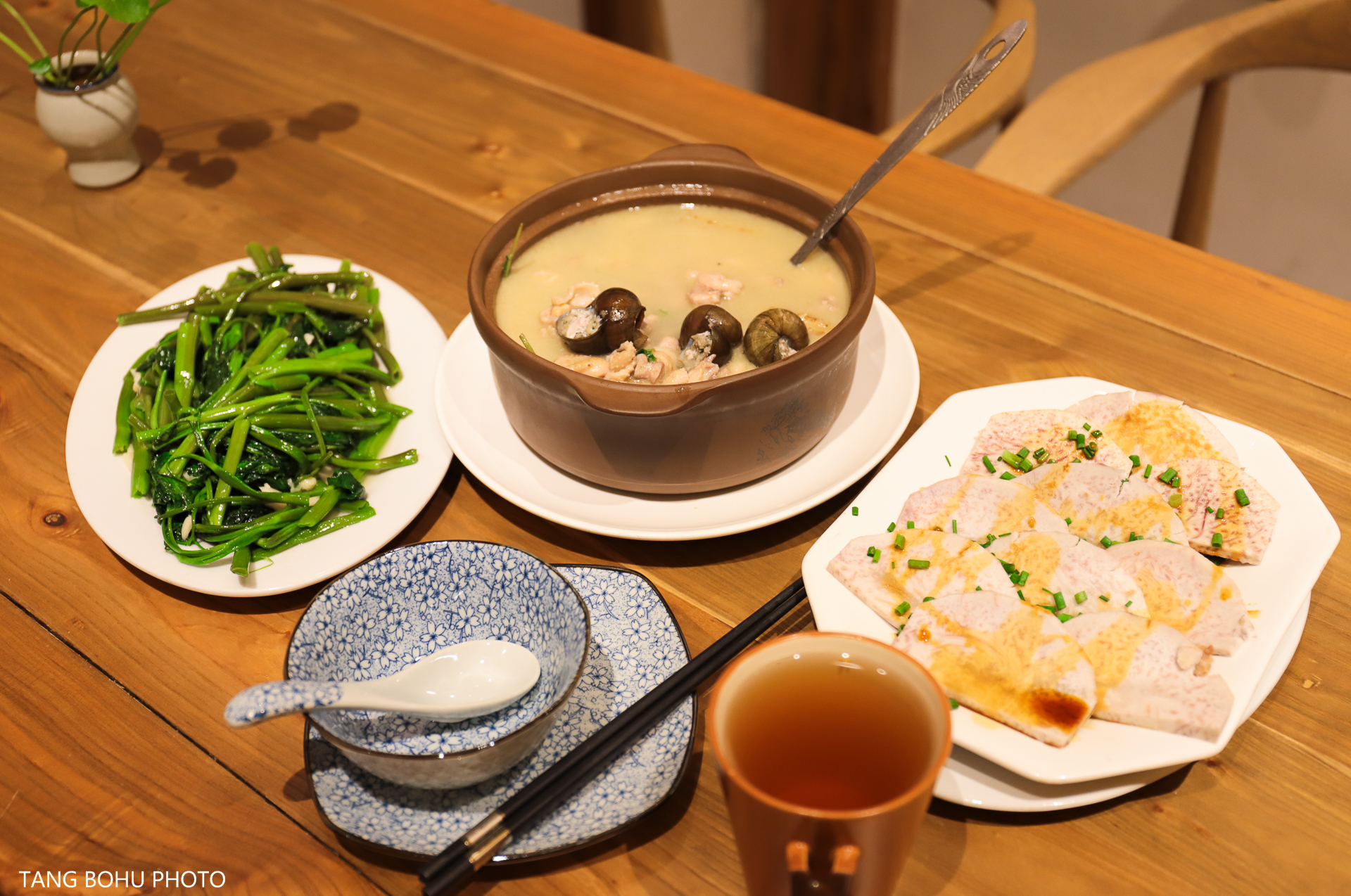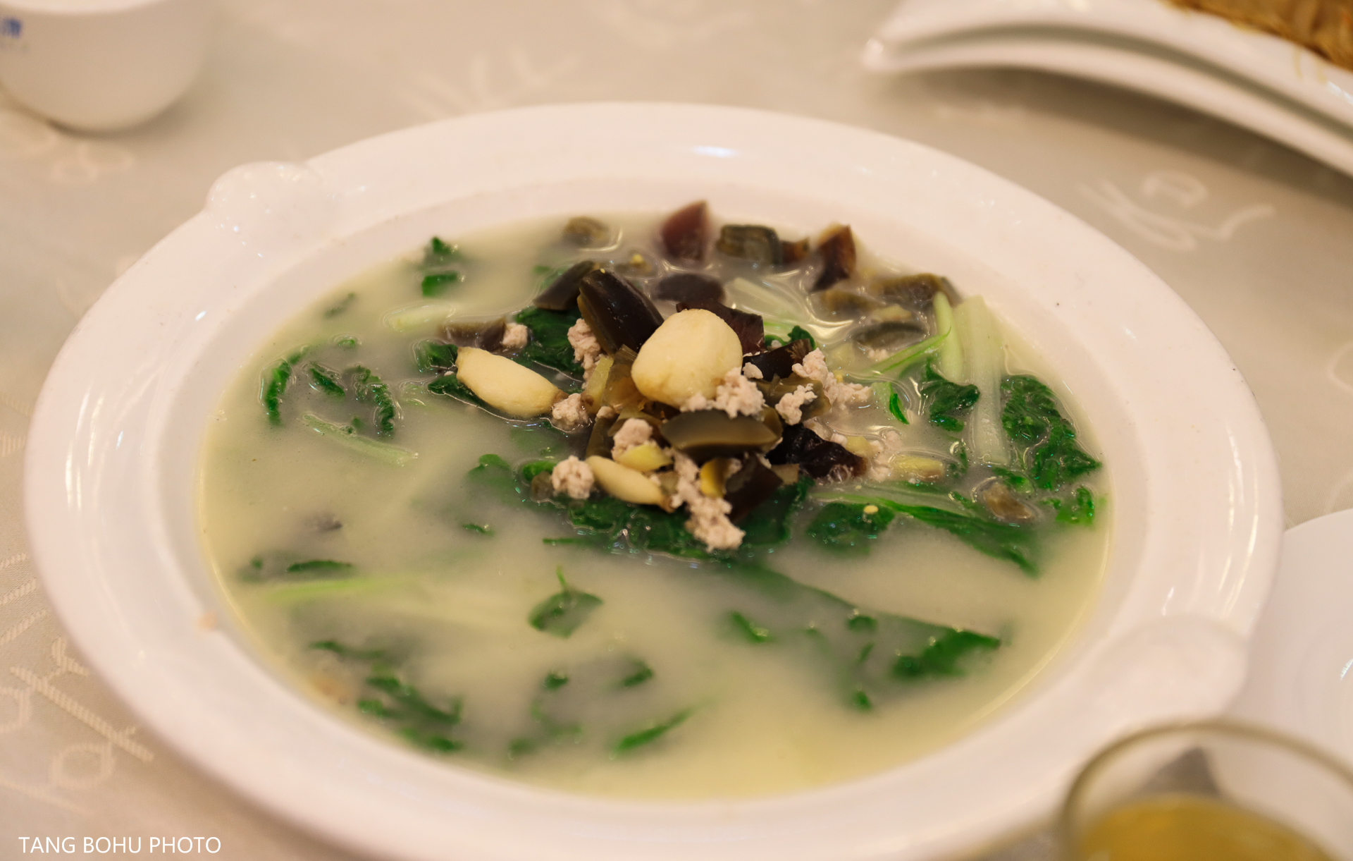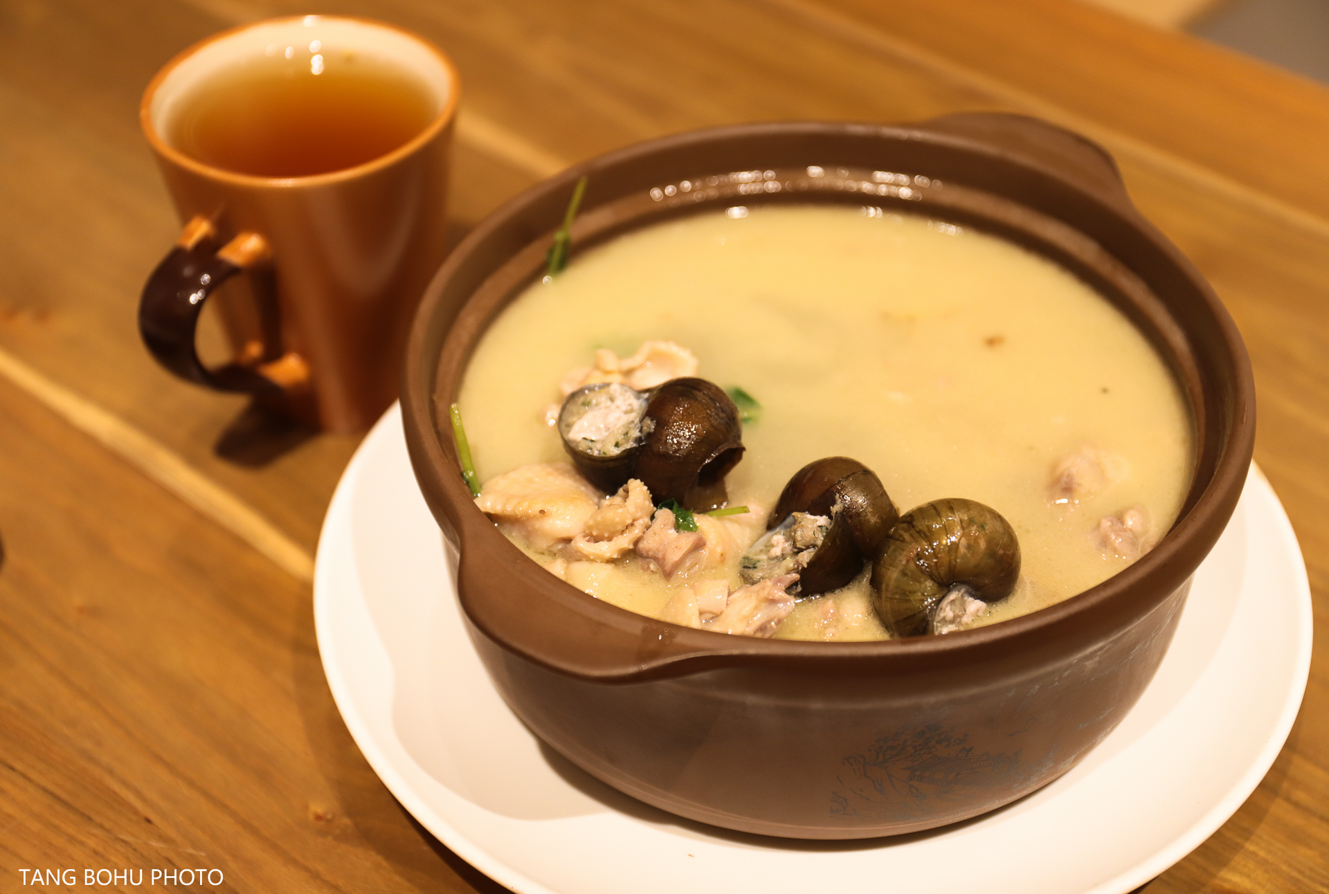 田螺酿炖鸡:鸡汤很新鲜,汤 里加 入大骨头和鸡肉一起炖,还加入了大大的田螺,田螺里用肉泥田螺肉塞满就成了田螺酿,加上一些薄荷叶一起煮,乳白色的汤尝上一口味道鲜甜,汤的鲜美让味蕾久久留住,让人回味无穷。一下子喝了两碗下去,因伯虎是闽南人吃得比较清淡,对于喝到这么鲜美的鸡汤真是一种满足感。