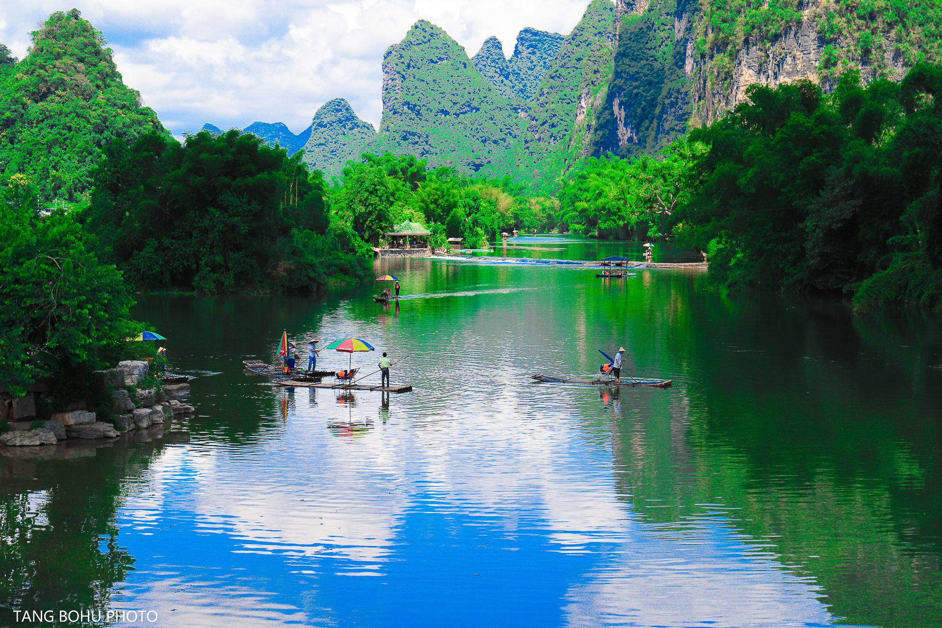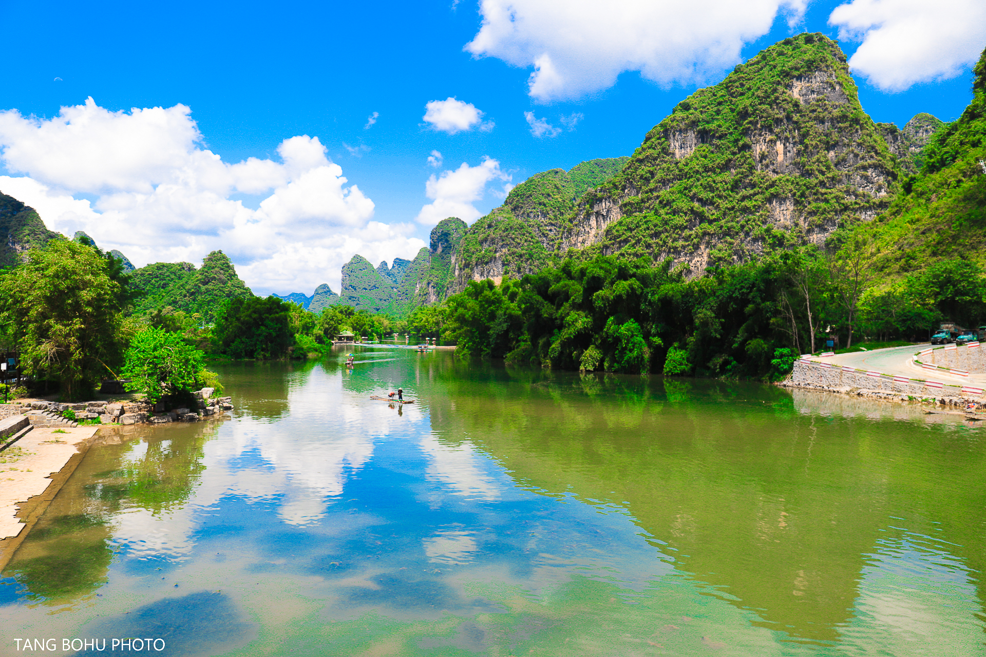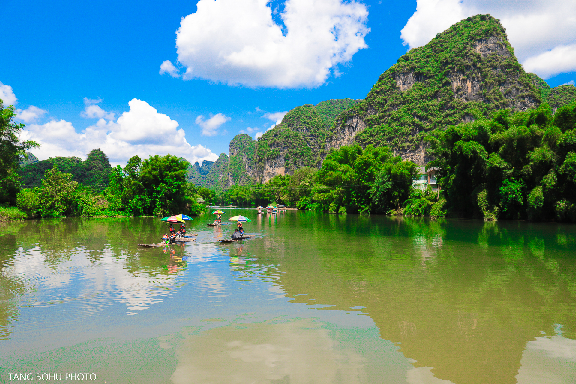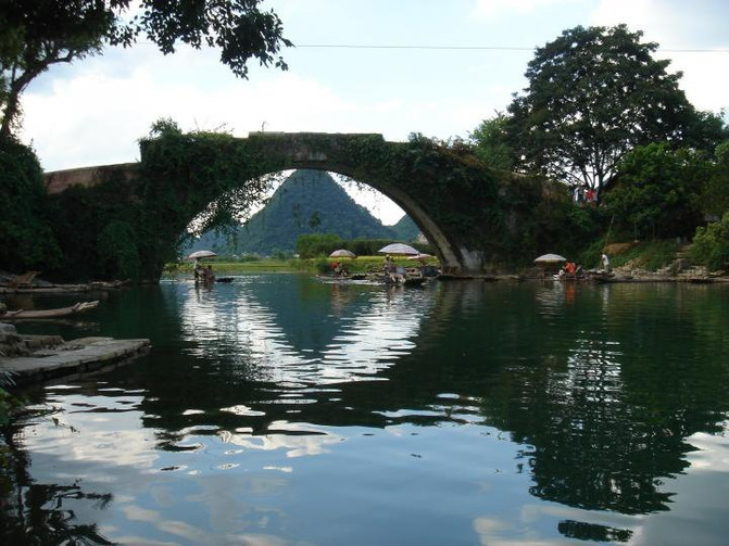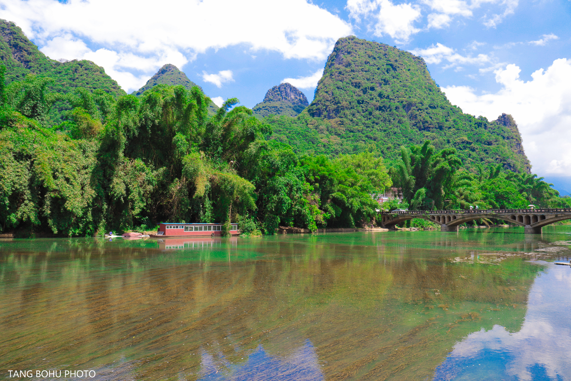 那洒满阳光的 遇龙河 水,清亮得一尘不染,看得见水底的浮草和倏忽而过的鱼儿;听得见艄公的侬语及竹筏上的欢声笑语。挥之不去的那份喜爱之情,久久不能忘却。这里,水质丰盈,碧波如镜,与小 漓江 干涸的河滩形成了鲜明的对比。两岸石山连绵,奇峰耸立。岸边翠竹摇曳,河水清澈见底,不时有渔筏 从江 上划过,一派原生状态,给人以清幽、宁静之感。