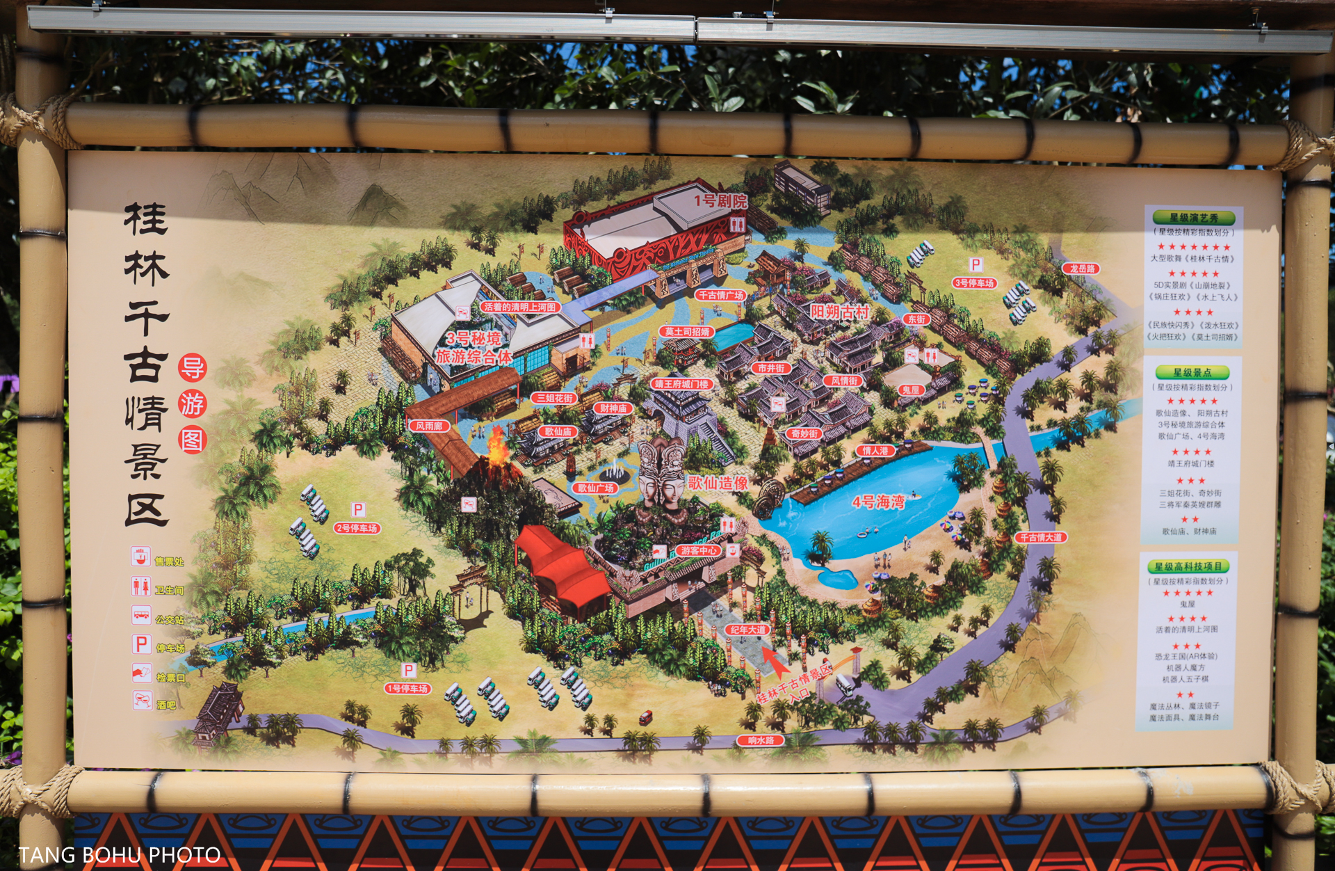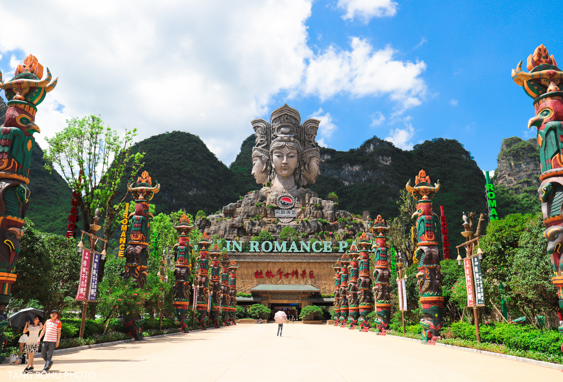 千古情,一生必看的演出下午从 西街 打车到景区只要10元左右,非常方便,《 千古情》是宋城演艺继《宋城千古情》、《三亚 千古情》、《 丽江 千古情》、《九寨千古情》、《炭河千古情》之后的又一巨作,我看过其它地方几场千古情的演出,来了 肯定不能错过《 千古情》的演出了。进入景区迎面而来的是巨型歌仙造像气势宏伟,与 山水融为一体,是八桂大地真善美儿女的化身。整个景区被四周的山围绕着,环顾四周处处皆是景呀。在这样的景区里简直就是一种享受呀,犹如人在画中游一般。