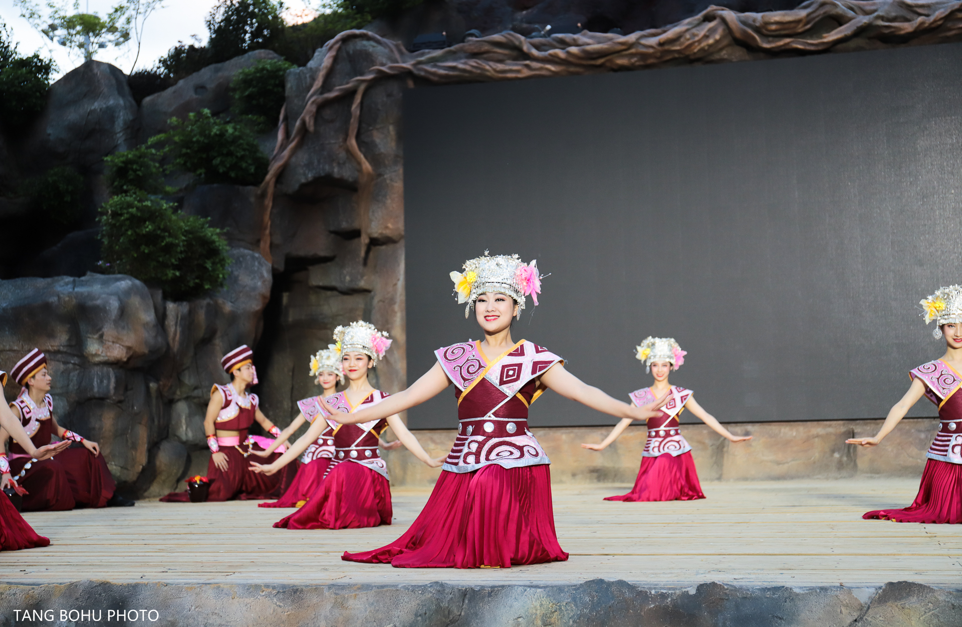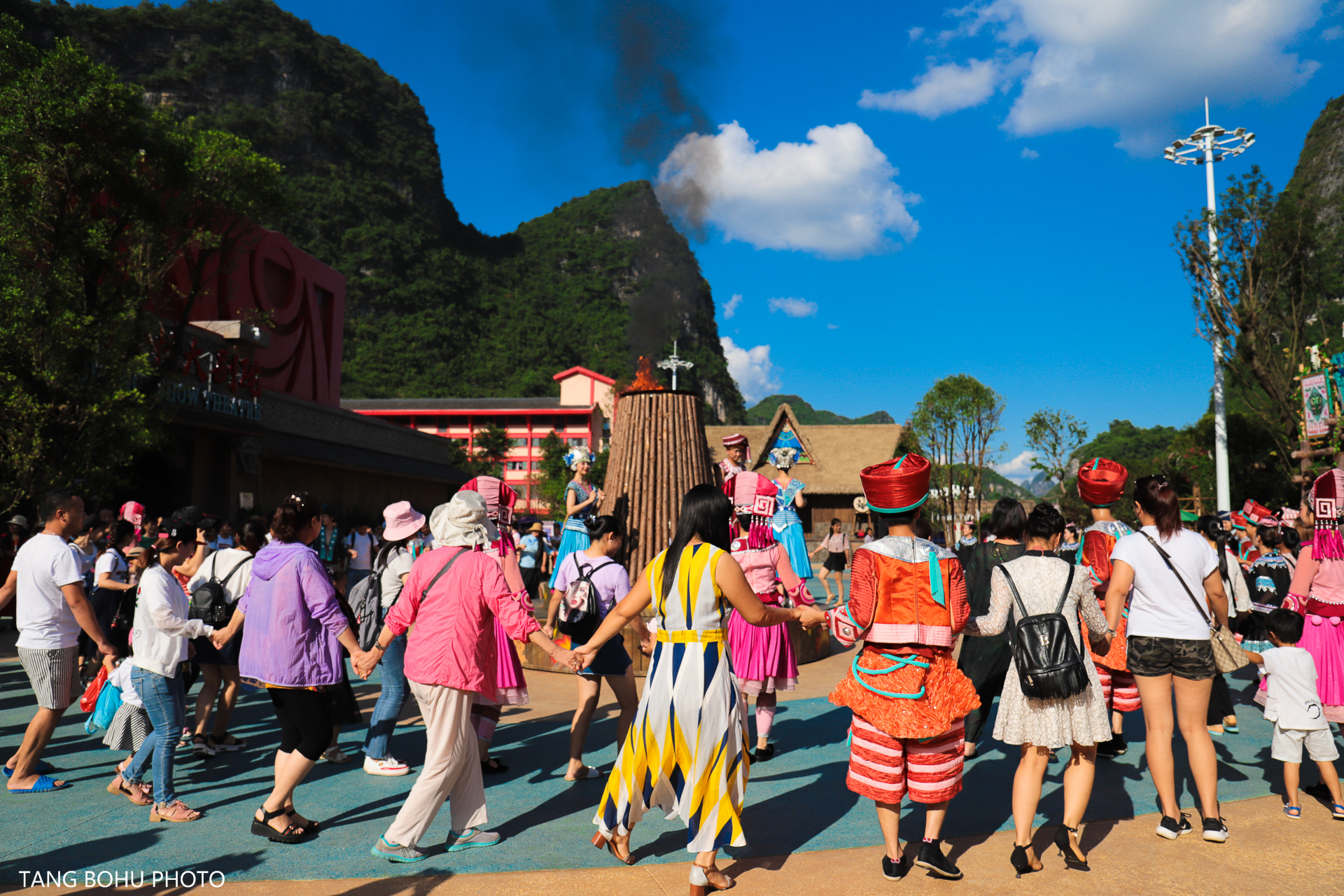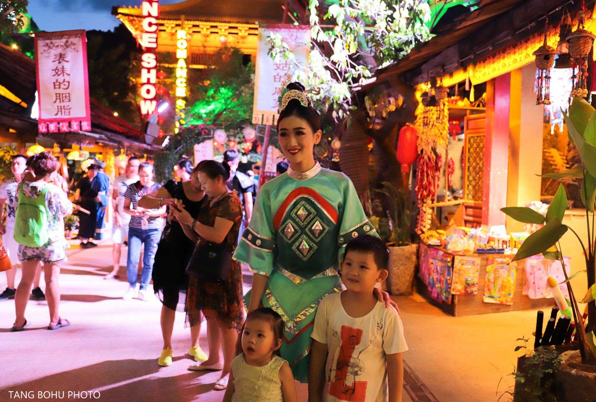 在风情街上每天都会上演民族快闪秀白天一场晚上又一场,我从白天到晚上一起感觉这两场,壮族、苗族、瑶族、侗族等穿着少数民族服饰火辣热舞,与游客近距离亲密互动,全场嗨翻天了。一些漂亮的女演员们都非常配合的拍照合影。一场民族快闪秀让游客们比白天都热情洋溢,跟着音乐扭动着身体。亲近的与游客互动,不管你是那里来的,热情会感染给在大家,表演的小姐姐们一边表演着的一边还不忘跟小朋友一起互动拍照,全场热闹非凡,每个人都玩得很开心。