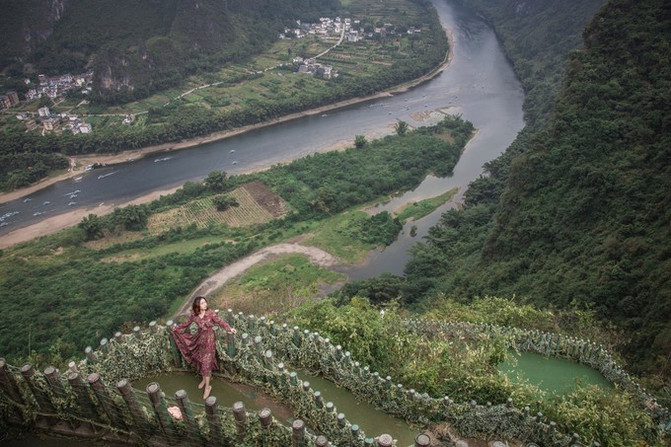 老寨山上看一场美丽的日落爬 老寨山 可真不是一件那么简单的事呀,从兴坪码头边上的路慢慢爬上去,刚刚开始还好,后面越来越难爬,一路上大汗淋漓,需要爬45分钟左右才能到顶上的亭子,最后面一段非常不好爬,有一个铁梯子基本上就是90度了,这里就要大家注意一下了,抓紧手呀,要不然就掉下去比较危险一些。不过爬到顶上去景色果然不错哦。登高望远,会当凌绝顶,一览众山小。俯瞰 漓江 上的船变成渺小,远山的青黛在蓝蓝的天空下。山峦相拥相偎,蜿蜒起伏,望不到尽头。山形如卧如坐,如蹲如立;似骆驼,似鲫鱼,似老人,似观音;像对镜梳妆的长发美女,像翘首遥望的孩童,又像注目凝视的老者……老寨从 老寨山 上看到兴坪码头的船只一游荡在 漓江 之中,曾几何时, 漓江 ,就在我魂牵萦绕的梦中,飘渺美丽。一支传唱经久的山歌,是她的灵魂,在山水间飘荡,神往的不只是青山绿水,更有那纯真美丽的爱情传说。