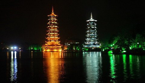 票 RMB40/人,我们正好碰到一个团队有两人没来,节省一个人的钱,进入公园后, 还是最土的规据,集体照,证明来过了,去过的人都知道象鼻山也就这样,我们 本来想去鼻那去摸摸,但很不幸,正好那里在修也不知道什么,封路,根本过不 过去,爬得的动的朋友们,把那个山给爬了下中,穿了穿象眼,比他们在下面的 至少感觉过了,之后去了河对面的所谓爱情岛,以为是什么浪漫之都啊,没什么 特别的,就是一般的公园,多了点情侣的塑像,可能因为这个而命名吧。 离开象鼻山,问路的问路,看地图的看地图,要找到方向嘛,不过我们很顺利, 很快找到了的市中心,正阳路步行街,很热闹,跟我们南京路差不多,一到 那里,大家都不行了,看见面包房就冲进去,有个要提的,在上海是决对也看不 见在市中心,而且是西点房还有零点几的食品,很新鲜,红豆饼和老波饼 0.6 元/个,太新鲜了,每人要了自己要吃的,一份甜点一份饮品,算是下午茶,先 垫个底吧,小休片刻,离身继续,这一继续可一发不可收拾,全是小吃,我们是 看一个想吃一个,章鱼小丸子,一人两根竹签,像没吃过一样,有劲死了,车轮 饼,咸甜什么饼,美味扭扭螺,意大利酸奶,还偷了人家一大卷纸巾,占为己有 批萨,不谈了,弄弄都吃不下了,吃起来不要太吓人哦,刚开始还斯文,后来就 是带上手套,直接抓,往嘴里塞,有气势,要的就是这种感觉,可以的我们,吃 到这里,总算是可以停住了。 我们是想去看两江四湖的夜景的,我们住的地方在杉湖边上,那想一圈绕下来正 好,在问了下路,知道了大致的方向,我们就往目的地走,一路上经过了中山中 路,那一路跟展会一样,全是小摊,卖各种各样的东西,看见了双皮奶,有三种 味道,原味,桂花,香芋,又不放过,每个味道各来一种,大家一起吃,尝尝味 道。离开了中山中路,我们说说笑笑,不知不觉走到桂湖了,这是我没想到,本 来只想到榕湖就折回的,看来人家说的没就这么点大,看看地图还以为很远 呢,个人觉得山特多,到处都可以看到山,我们沿着桂湖小走了一段,配着 湖光夜色,天气温度也适宜。建义大家真的没必要去花钱做船。由于大家都太累 了,我们没继续逛下去,而是直接回到我们的住处那杉湖,那里有日月双塔,如 时间充裕,绕着四湖走走放松下,尽情呼吸下新鲜空气,这是上海享受不到的, 上海哪有这么多树啊。 在回程的路上我们还碰巧看到一档选秀节目,不知是音响效果