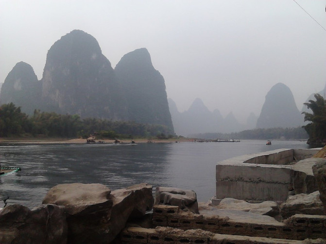 第二天 2013年9月13日 大爱漓江——精彩的竹筏漂流第二天早晨我想,怎样才能不再这样痛苦的睡觉?和我们共用一个小院的有一间房,和我们的房间等价,就是上图中往院子里看去能看到的那个白色小门。我决定去看看那间房,看看它空调在什么位置。一看之下大喜,不但空调的位置不在床头,而且那种古色古香的中式风格让我一眼就喜欢上了,于是立刻提出换房。店家说那间房有人订过,帮忙协调一下,能不能换看运气。唉,不管那么多了,先出去玩!出门之前略略先顽皮的跑到阳台上卖个萌。今天的活动是漓江漂流,在旅游攻略上找到的师傅姓杨<壹 ,八零, 柒 柒三, 林 六, 壹八 . 一>为人厚道。“杨堤——兴坪”精华段。两大一小280元包了个竹筏,我觉得划算,是按人头收费,不足四人补空位费。1.3米以下的小孩儿不算人头,要是超过1.3米,价格就比这个多了。关键是自己家人一筏,自由自在,想怎么拍照,想坐什么位置,全自己说了算。而且多方对比选的这家,承诺不开马达不赶时间,慢慢飘,保证游玩时间在四小时以上。吃过米粉,我们溜达着往汽车站的方向走,中间坐了一小段让略略极开心的电瓶车。到杨堤,大概一个小时车程,票价9.5元。包车到杨堤,单程120元。我选择了到汽车站坐巴士前往,原因有三,一是盘算了一下和包车价格差异有些大,二是我们当天只安排了漂流这一项活动,时间上不着急。三是汽车站到杨堤码头是空调车直达,基本十多分钟一趟,路程也不太长。到了车站,上了一辆中巴车,嘿,空调开的真足。报了个车号给竹筏师傅,就等着他在码头接我们了。谁知刚开出车站,怎么这么热呀,原来中巴车司机竟然给空调关了,汗!于是车上的窗户全部打开,也还好,有风。大约一个小时多点,我们顺利到达了码头!