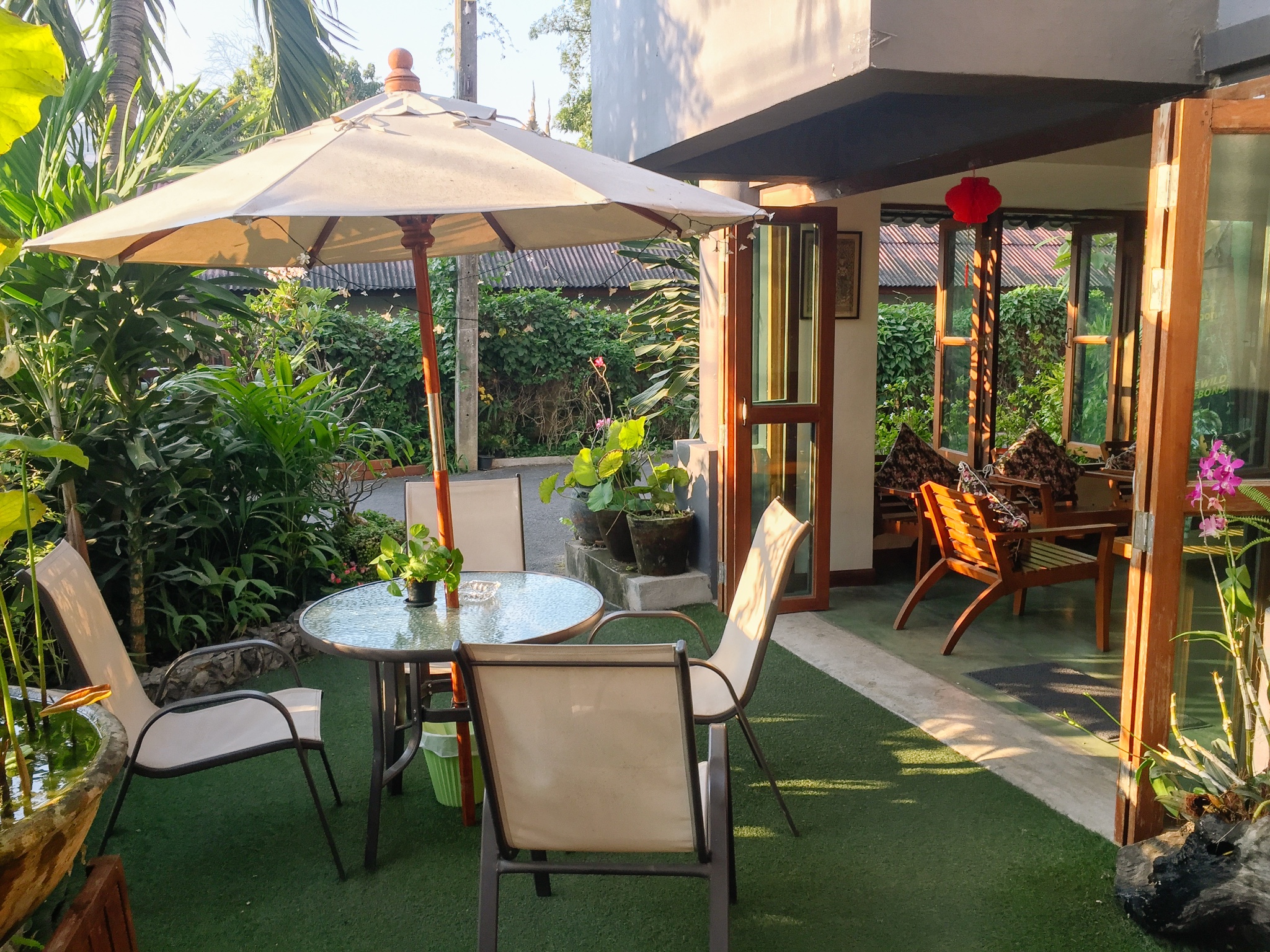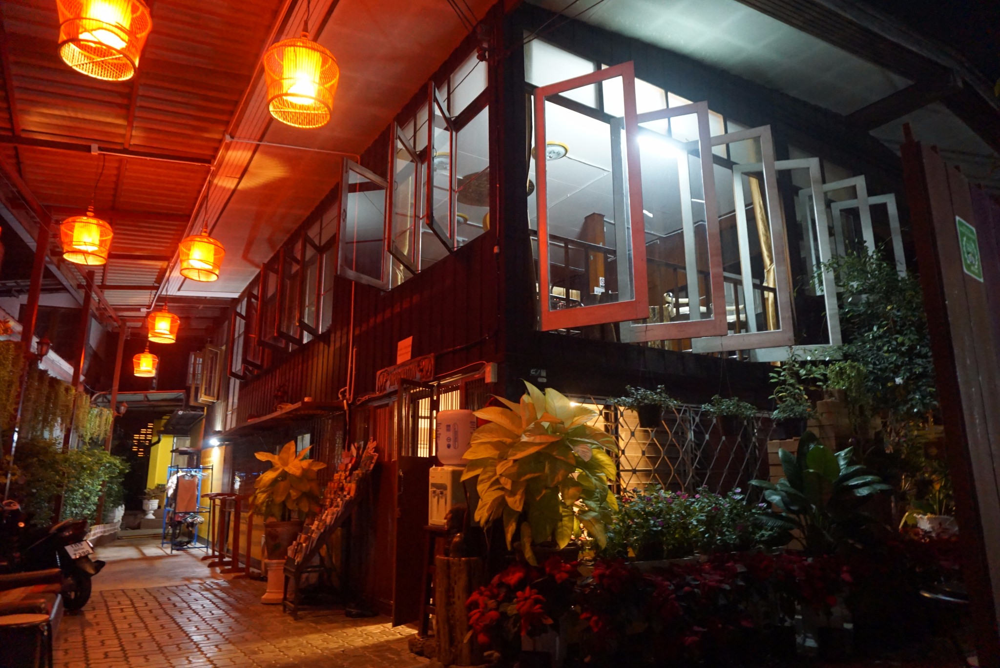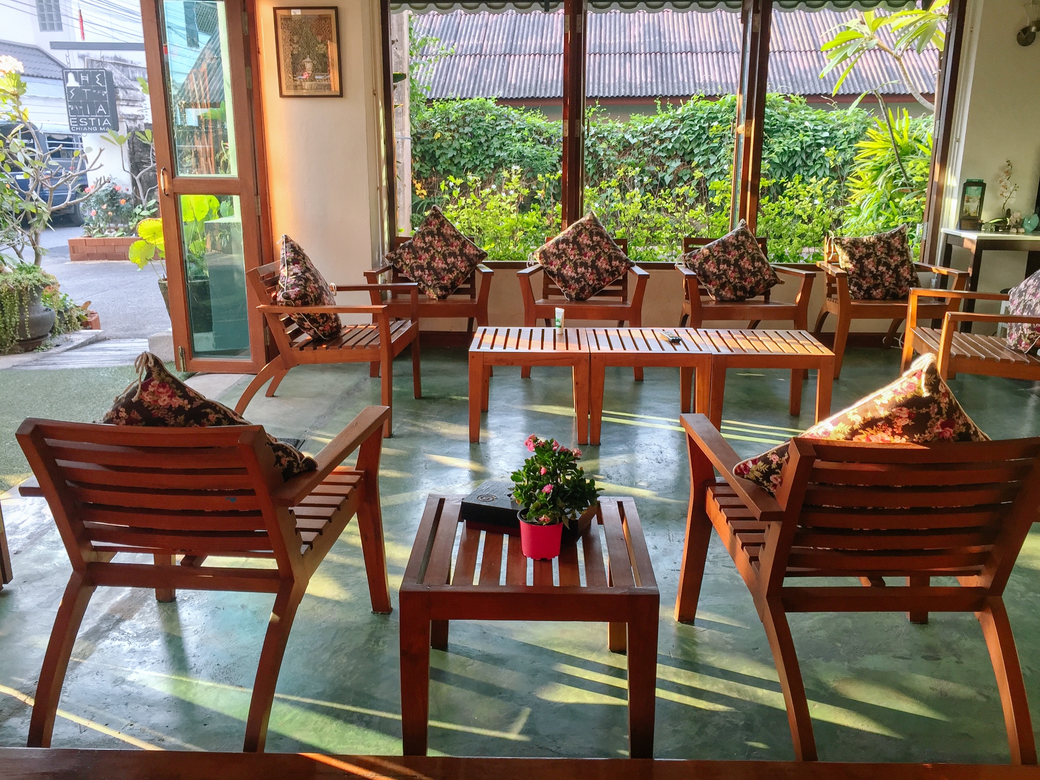 的民宿不少,但高性价比的民宿不多,来说说我住过的这家民宿,Grace House 隔世. 九巷,首先是地理位置靠近塔佩门和711,出游、逛夜市、购物都很方便,最关键的是性价比高呀,标间800B,单人间450B,完全属于物超所值。旅店内非常清洁卫生,从大堂到房间都是换鞋进入(门口备有拖鞋),房内布置整洁素雅,朴素而不失端庄,有独立的卫生间。大堂左侧是前台办公区域,右侧设有开放型自助厨房,可以随时加工餐食,柜上备有咖啡、茶叶和小点心可免费享用,室外还有给住客洗衣服和晾衣服的区域~~最喜欢大堂门口的小花园,夜晚和驴友坐在廊下闻着花香吹着习习凉风聊天、发微博,一杯茶或咖啡就可以享受一个温馨的夜晚~~