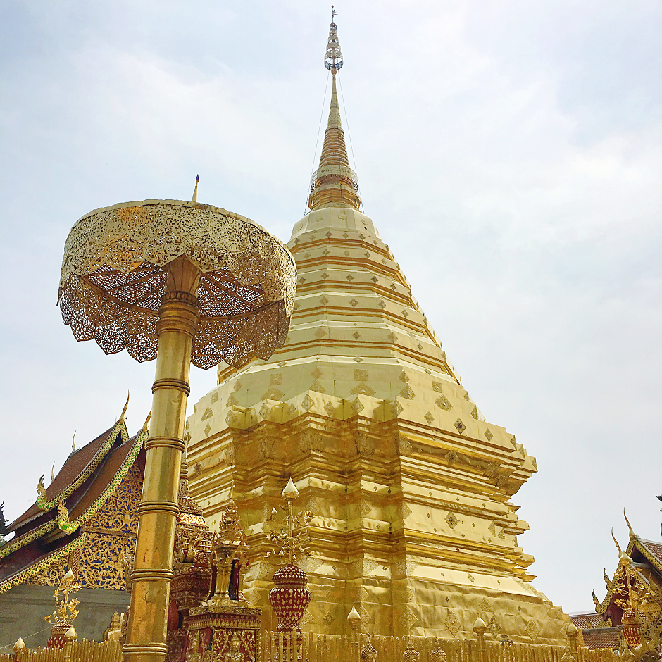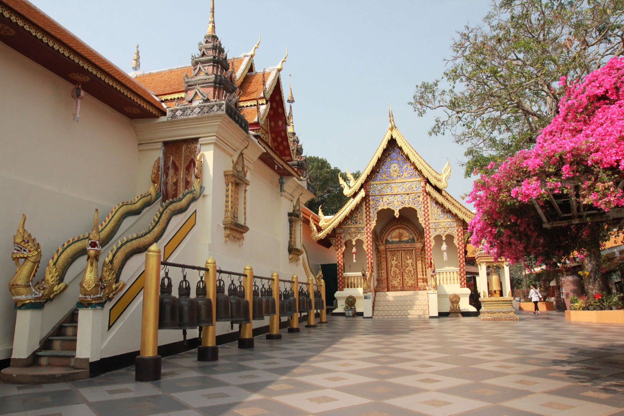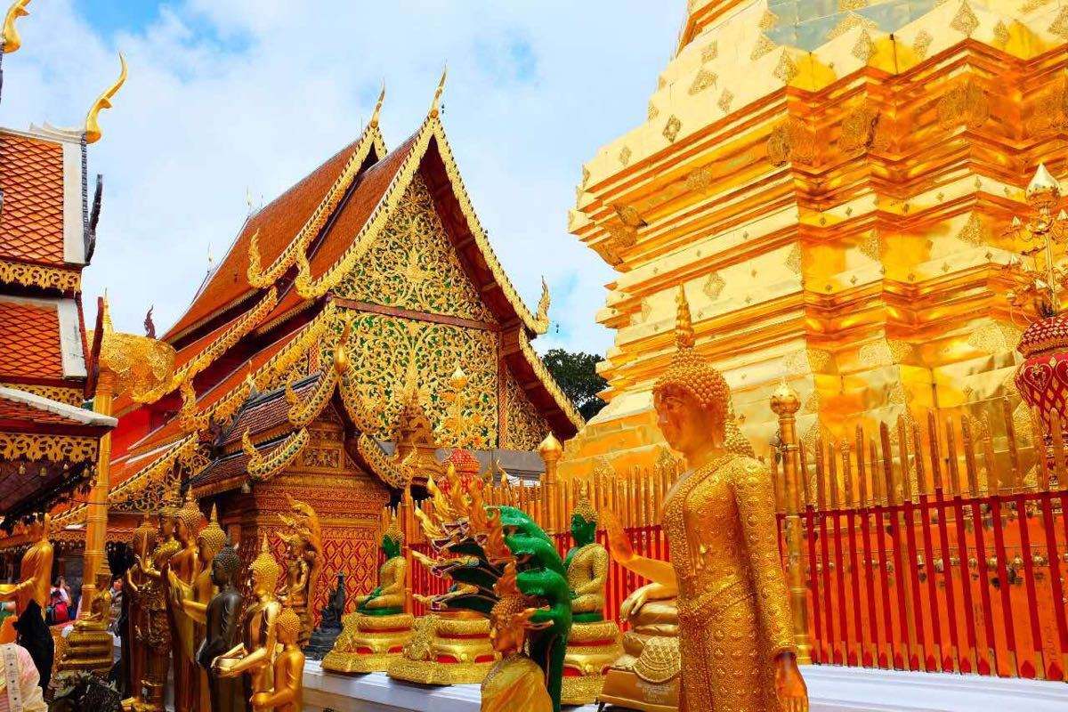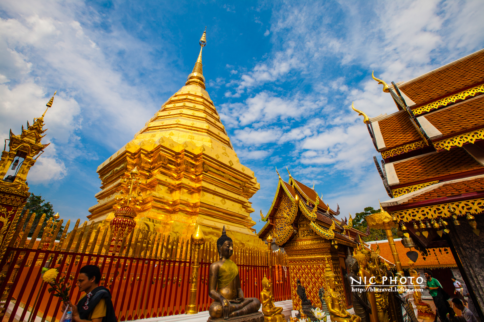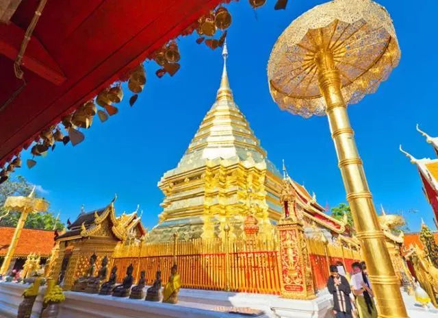 双龙寺·双龙寺又称素贴寺,因有两条长龙在两侧台阶坐卧而得名,是泰国著名的佛教避暑胜地。 ·相传14世纪泰北得到释迦牟尼佛的舍利子,一位高僧将舍利子放在白象背上,任由其寻找供奉位置,最后白象走到了素贴山这里。 ·至今佛寺的金色佛塔中仍供奉着佛祖的舍利子,每年都吸引世界各地的信徒前来朝圣。 ·在主殿后方设有观景台,在这里能俯瞰整个