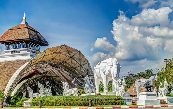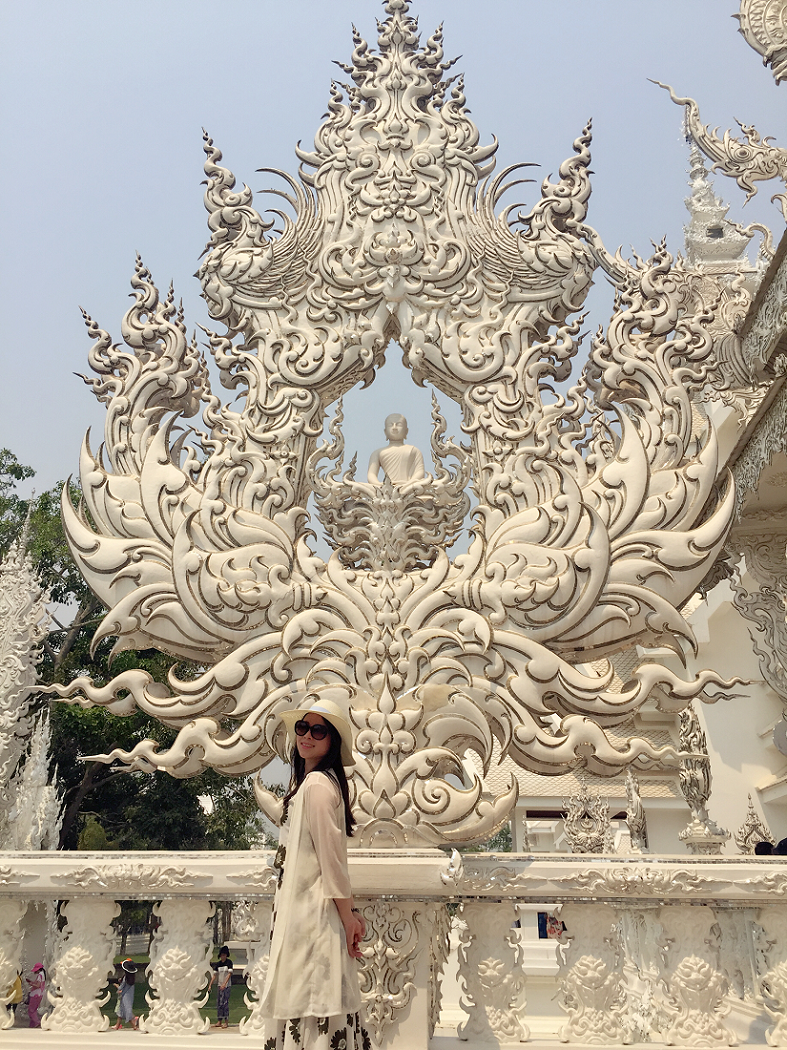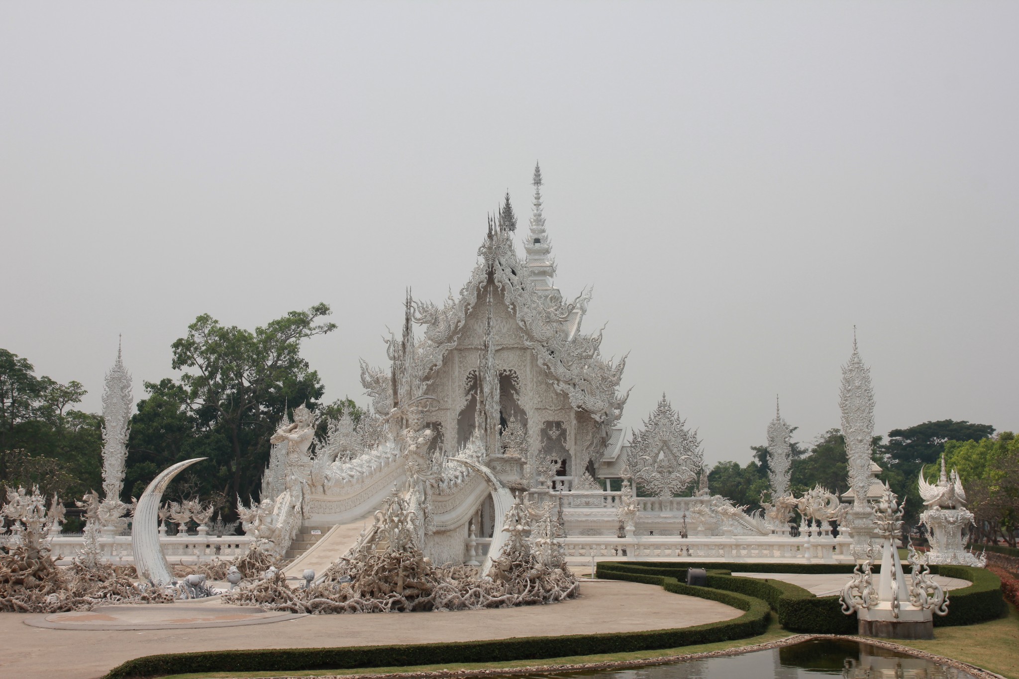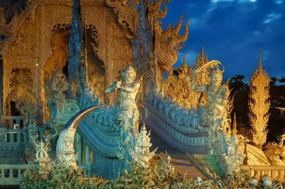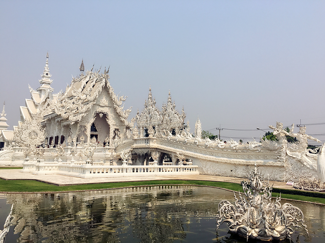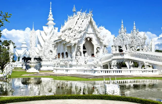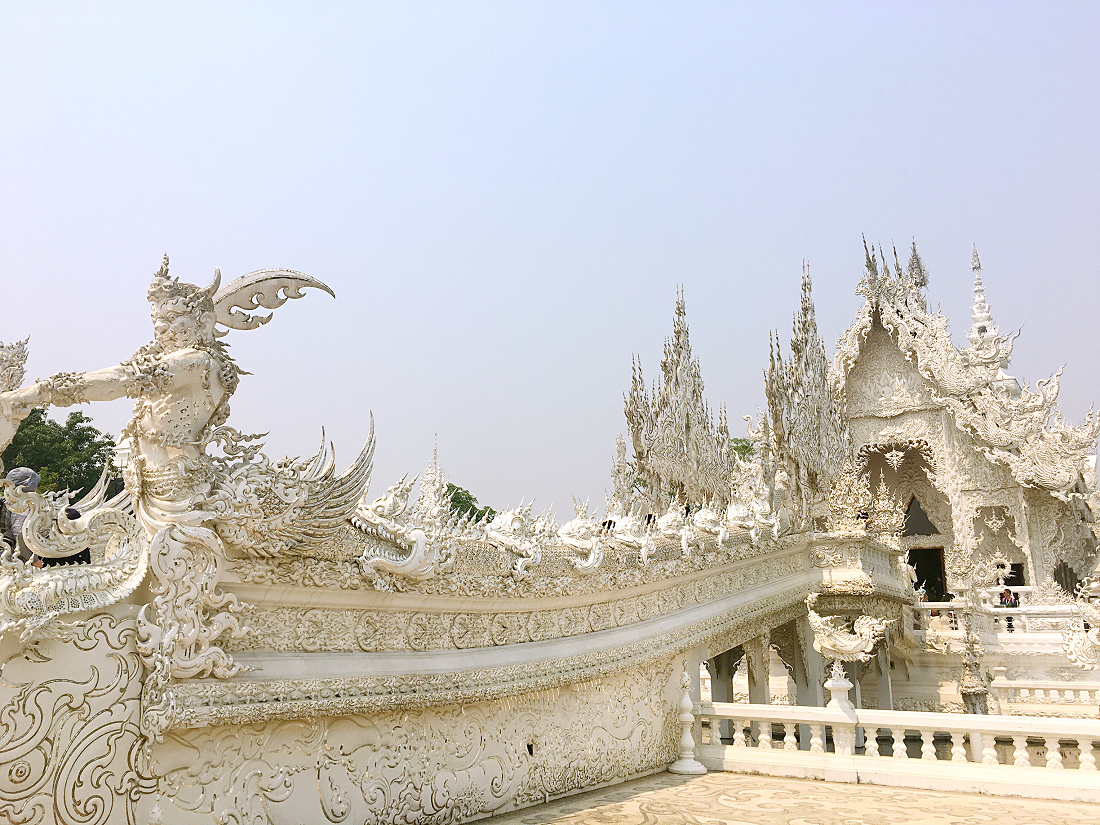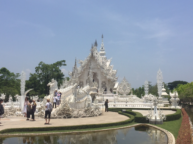 白庙·白庙建于1997年,本名白龙寺,也叫龙昆寺等。由泰国著名设计师Chakermchai Kosipipat设计建造。 ·从远处看,这座寺庙似乎是用瓷器建造的,走近才会发现这种错觉是由白色涂料和玻璃亮片造成的。 ·白庙以素白做底,通身无一处镶金,象征佛陀的纯洁;银镜镶边,寓意着佛的智慧照耀全宇宙。 ·寺庙进门处手臂造型,更是寓意地狱场景。里面的壁画,除了传统的佛教主题,还增添了许多现代元素。