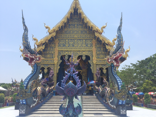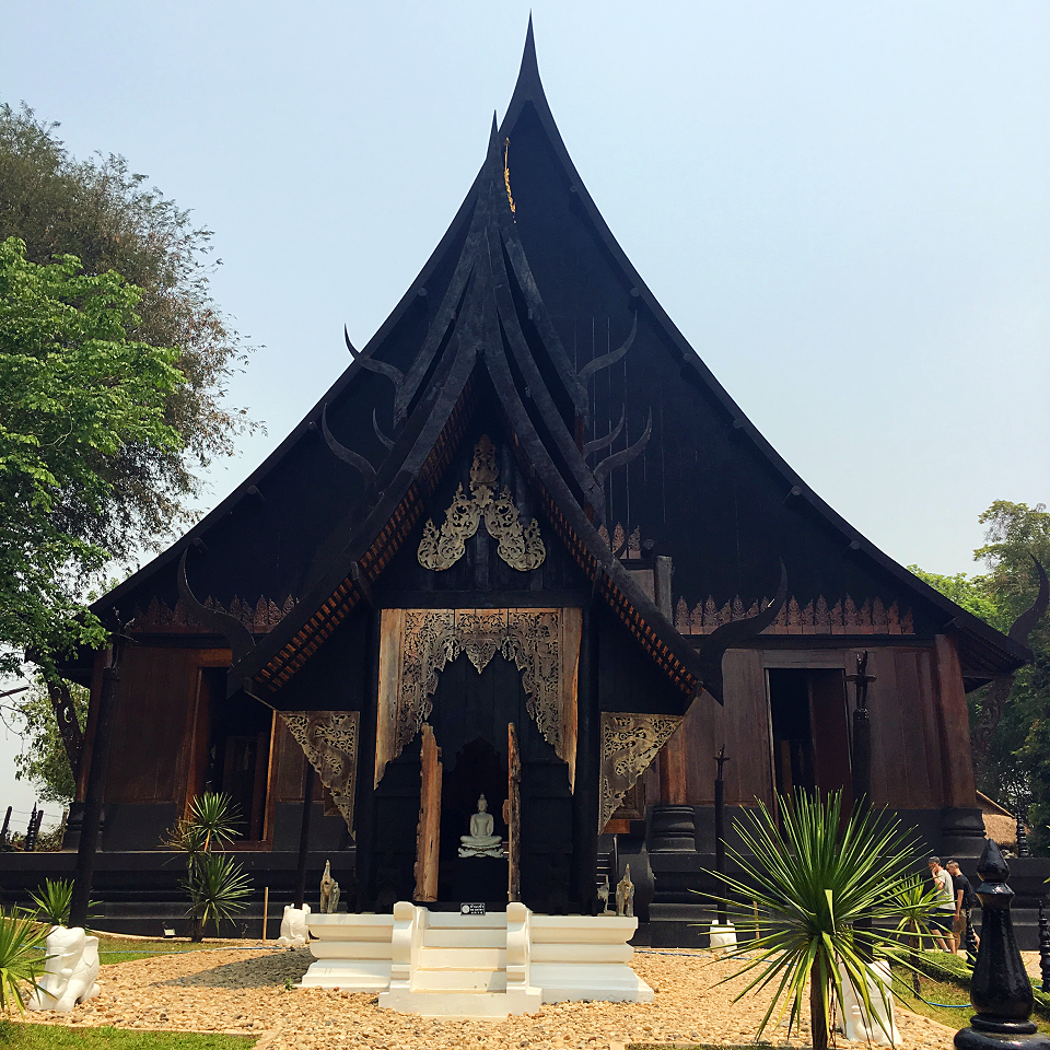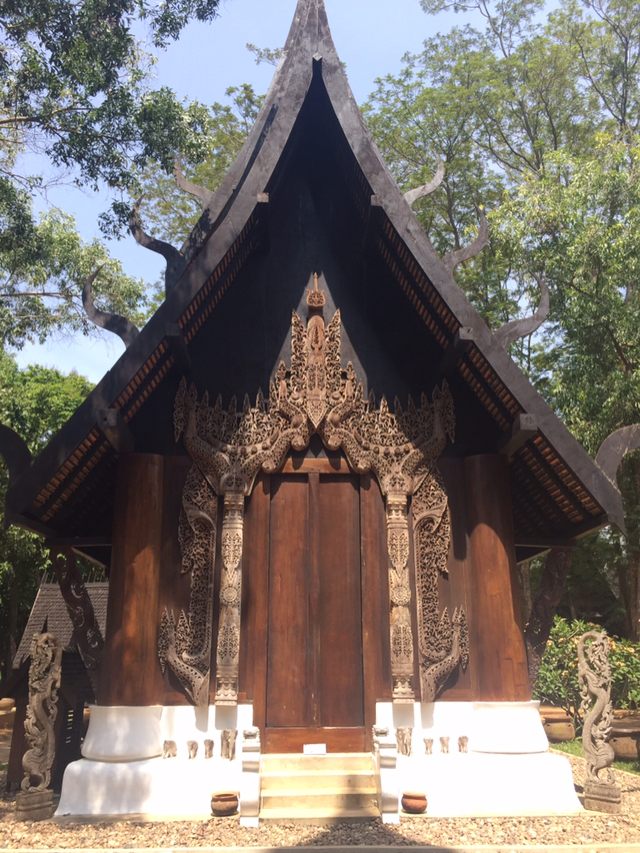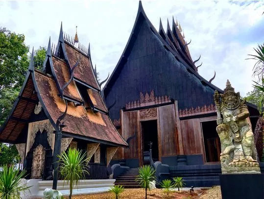 黑庙·由泰国鬼才艺术家Thawan Duchanee花费36年设计建造完成,其实它不是庙,而是一座博物馆。 ·博物馆搜集了大量关于死亡的展品,把远古时代的兽骨、原始的猎杀工具等,融合成各种艺术品。 ·水牛角的巨型座椅、木船上的魔鬼浮雕、吊在半空的动物皮做成的风铃装置等,给人关于地狱的联想。 ·黑庙周围散落着十几栋以牛角为装饰的建筑,所有的建筑、展品等都以黑色为基调,与白庙截然不同,展现了天堂与地狱的天壤之别。