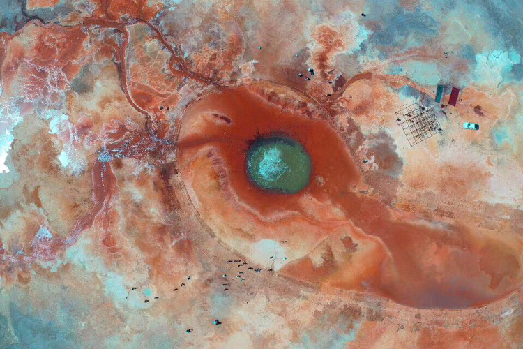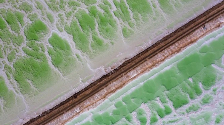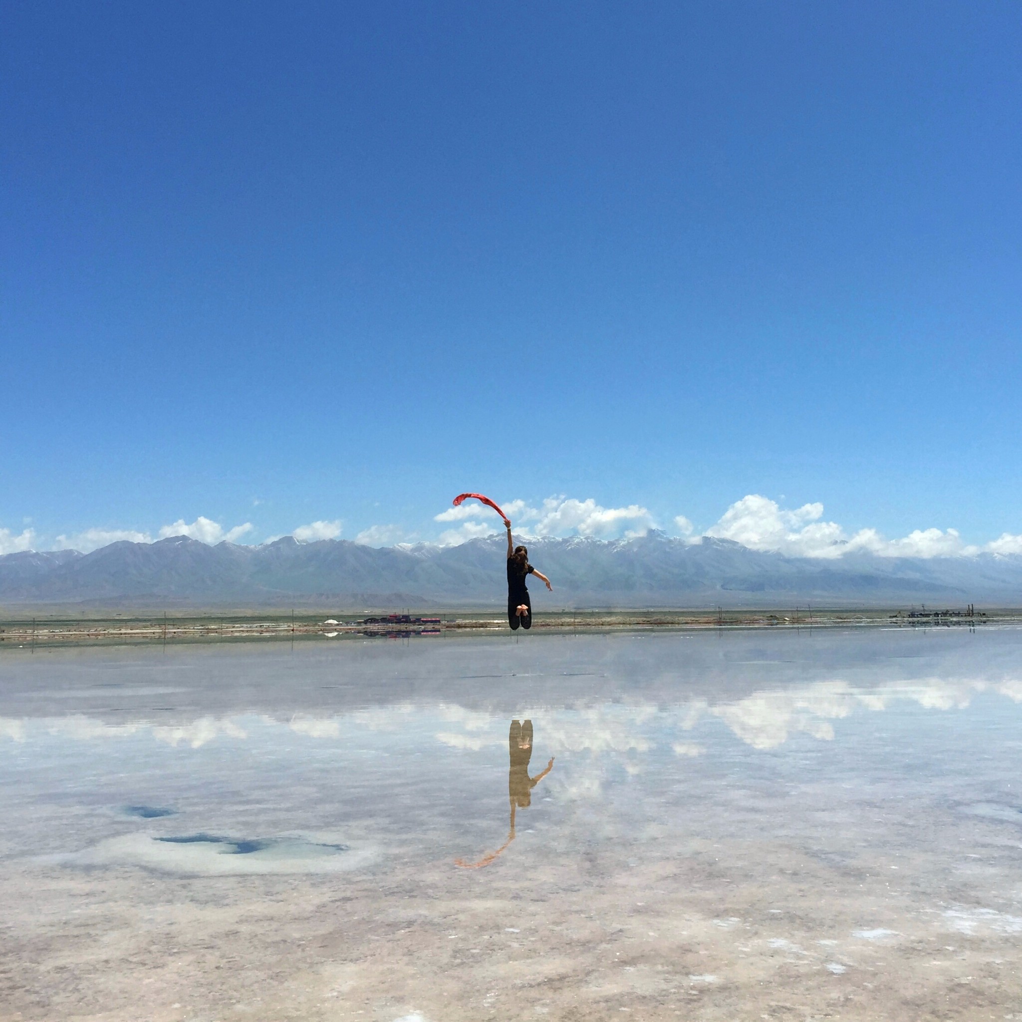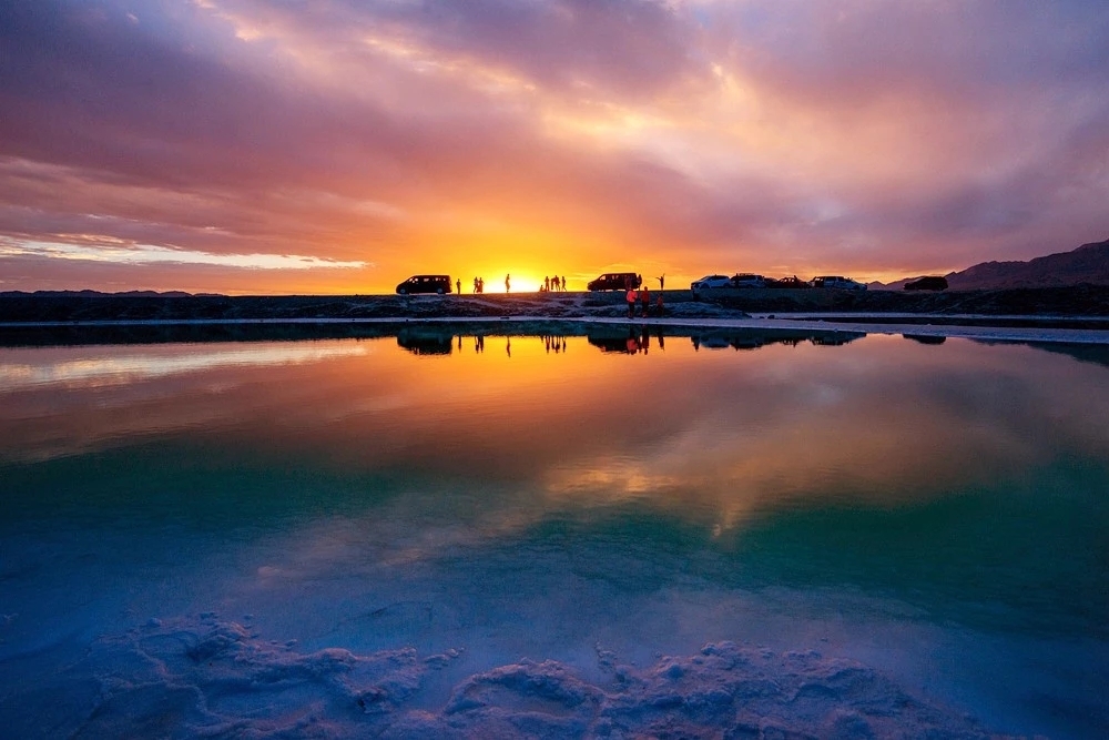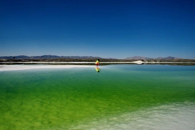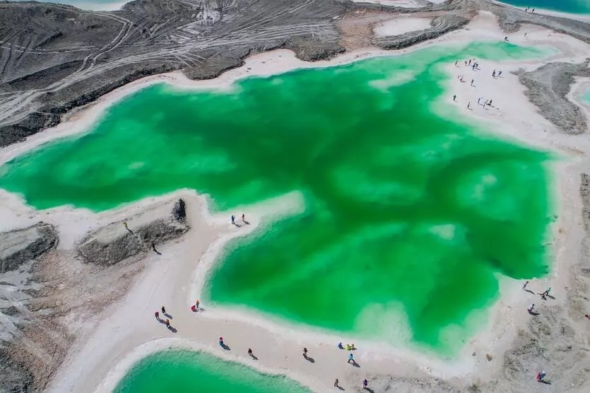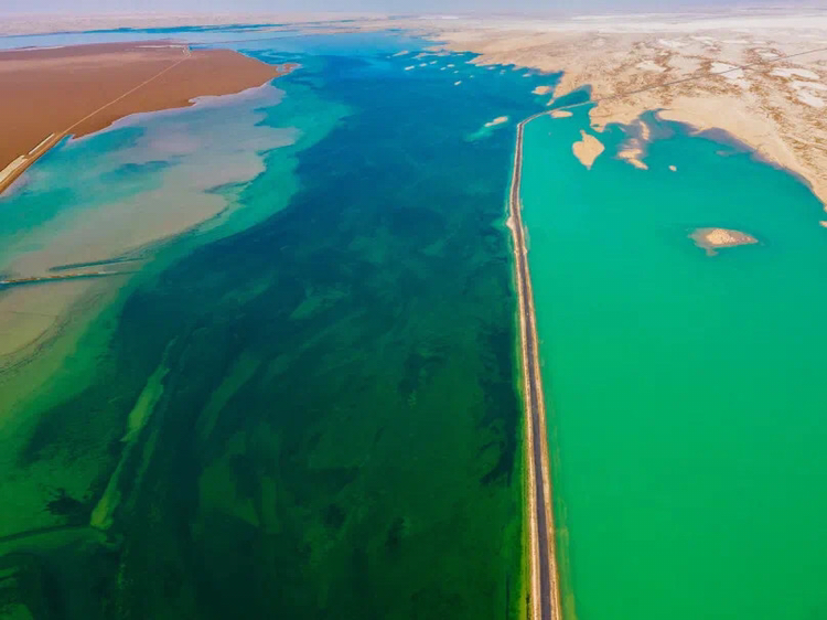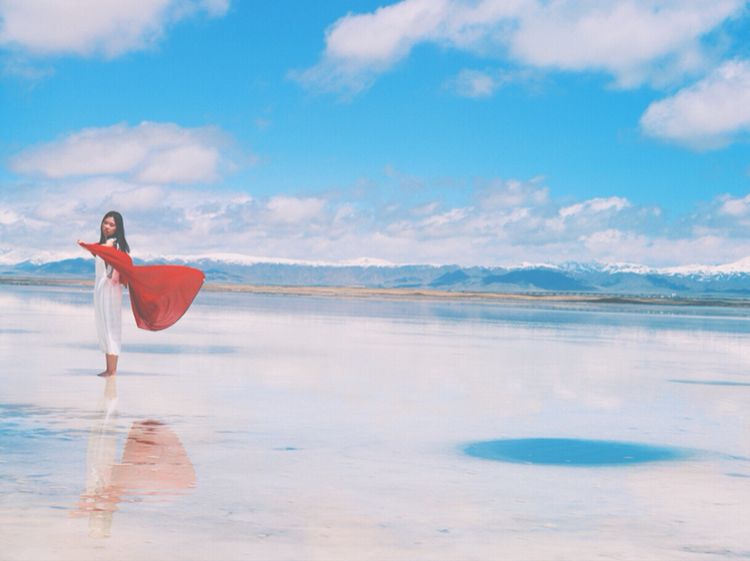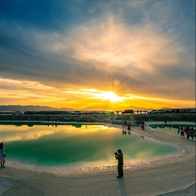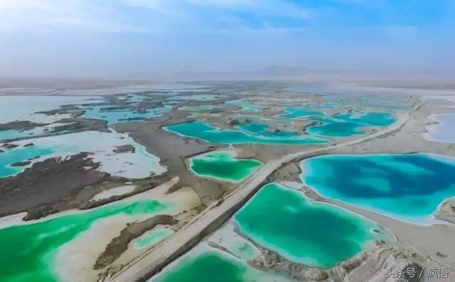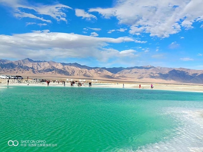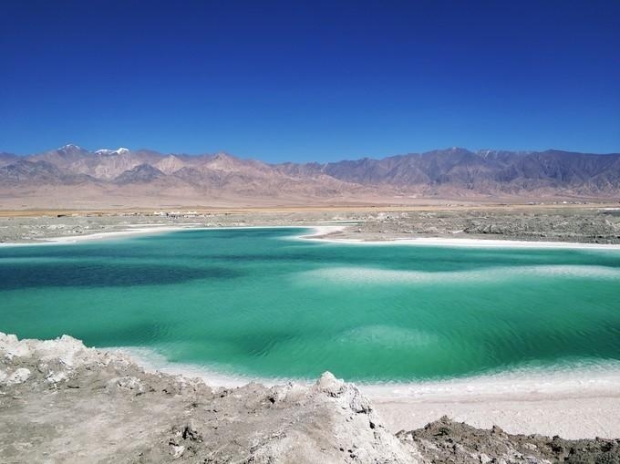 这片约6平方公里的“翡翠湖”名为大柴旦湖,是原大柴旦化工厂盐湖采矿队采矿区,由于所含的矿物质浓度的不同,形成了颜色多彩的景象。天气晴好时,宛若镜面般的湖面倒影着蓝天白云和皑皑雪峰,宛如置身于仙境中