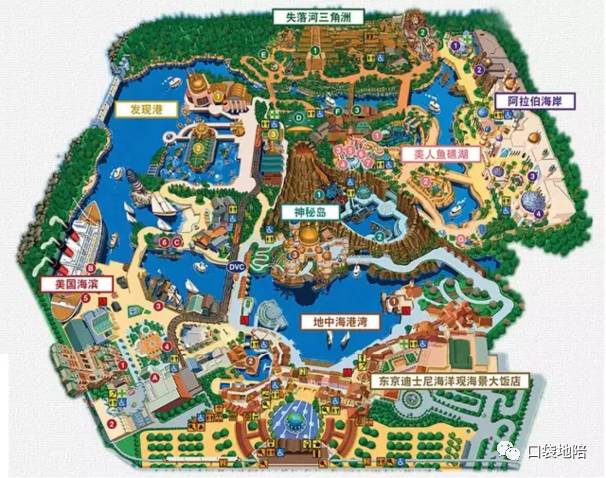 迪士尼海洋共分为地中海港湾、美国海滨、发现港、失落河三角洲、阿拉伯海岸、美人鱼礁湖、神秘岛七个主题区域。