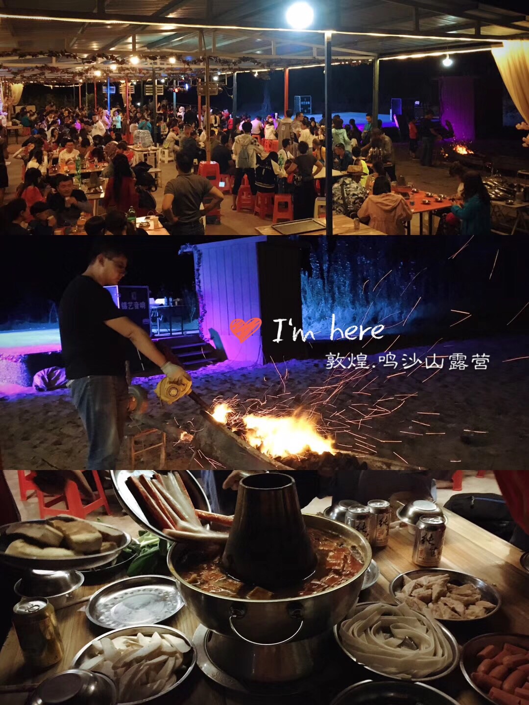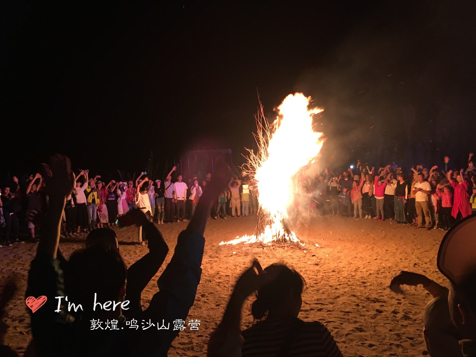 鸣沙山一群人围着篝火唱歌,气氛热烈。