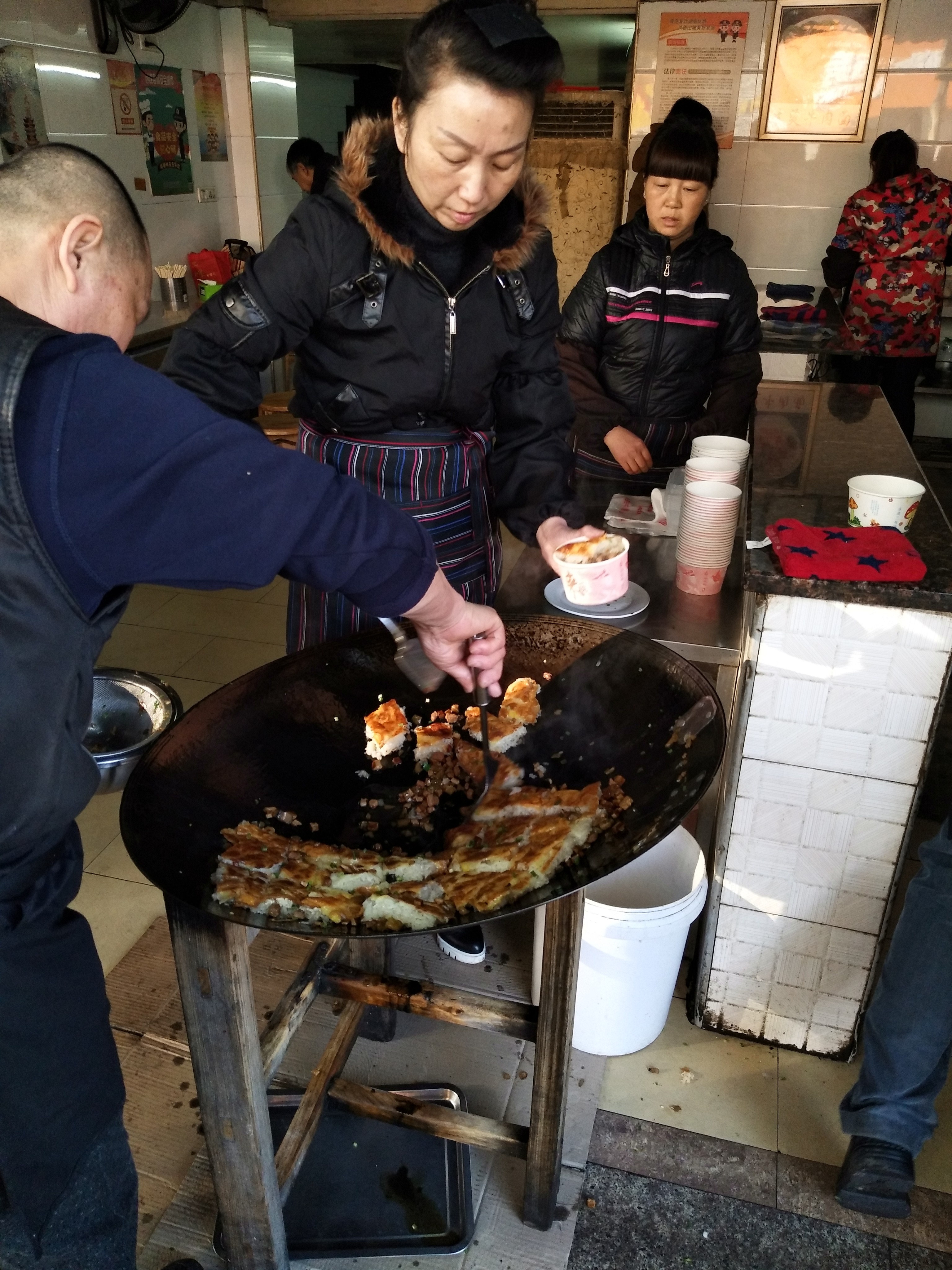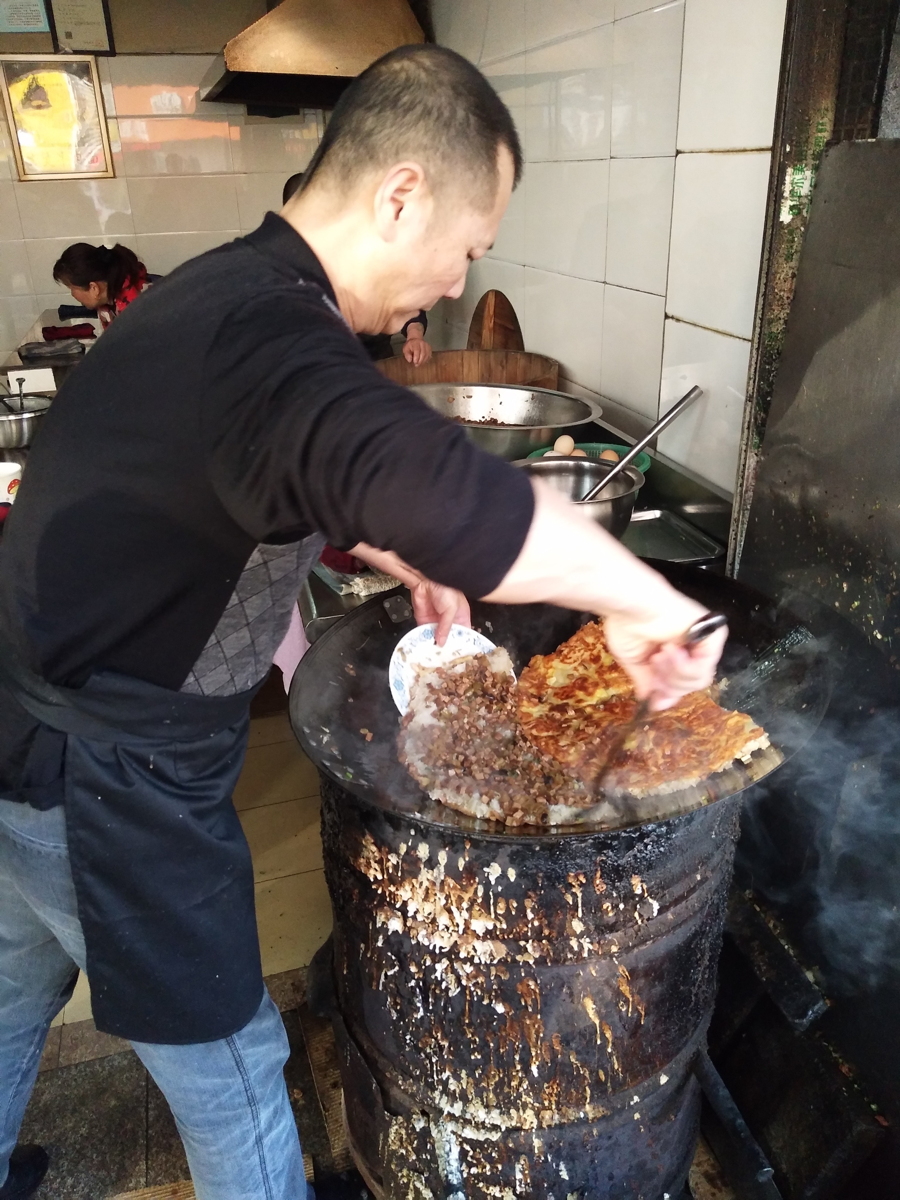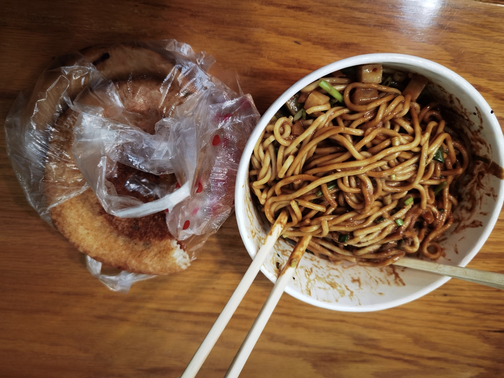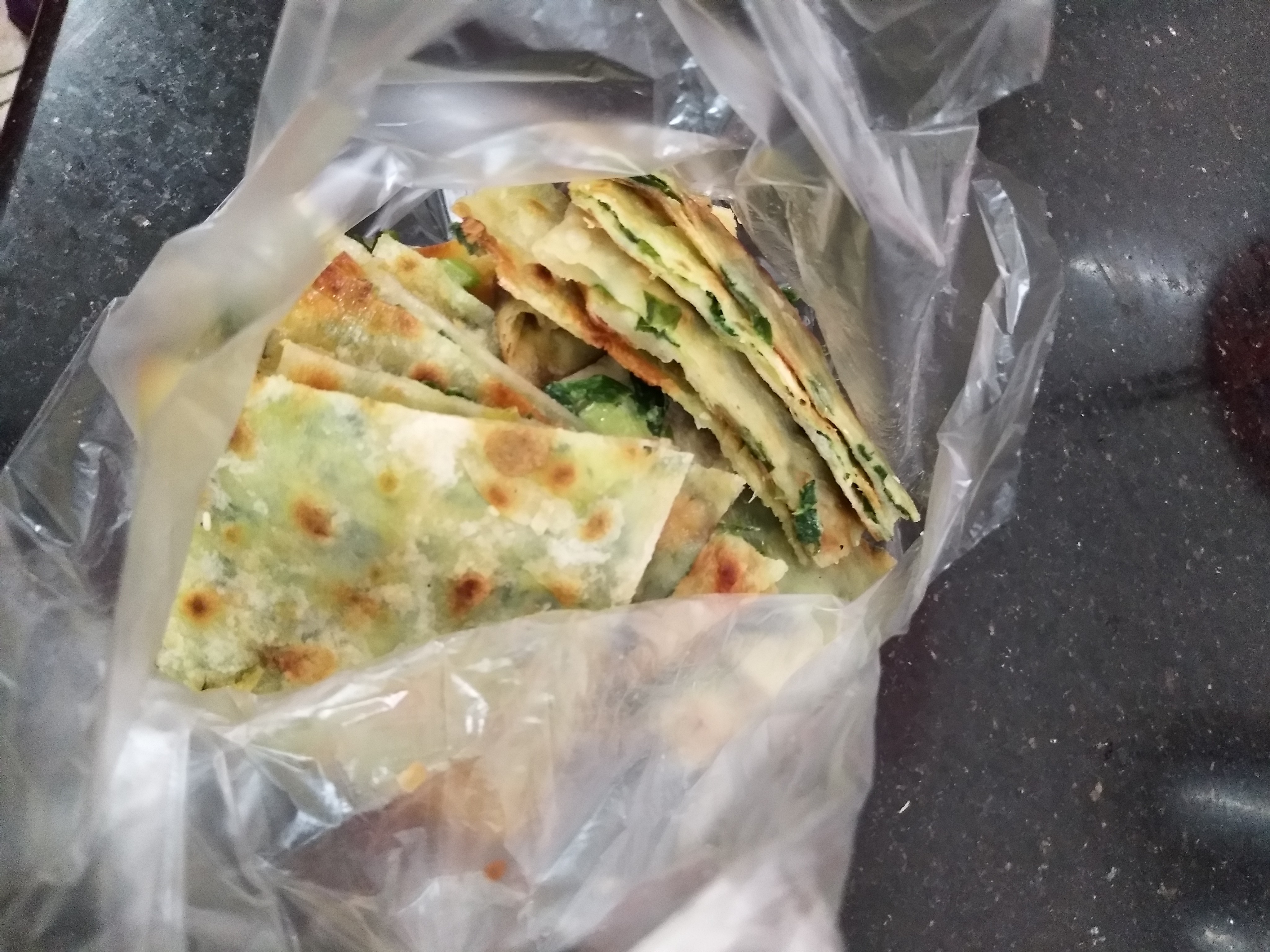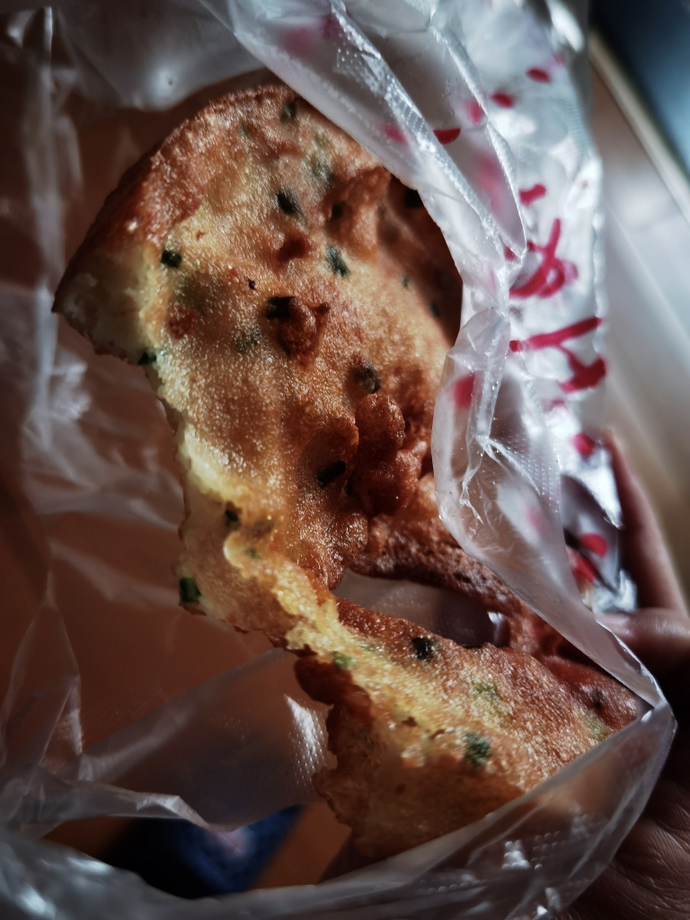 与这家店共生的还有一家做烙饼的摊位,点了一份葱花饼,口味酥脆,葱香味很美味,反正比我在家做的好吃~~