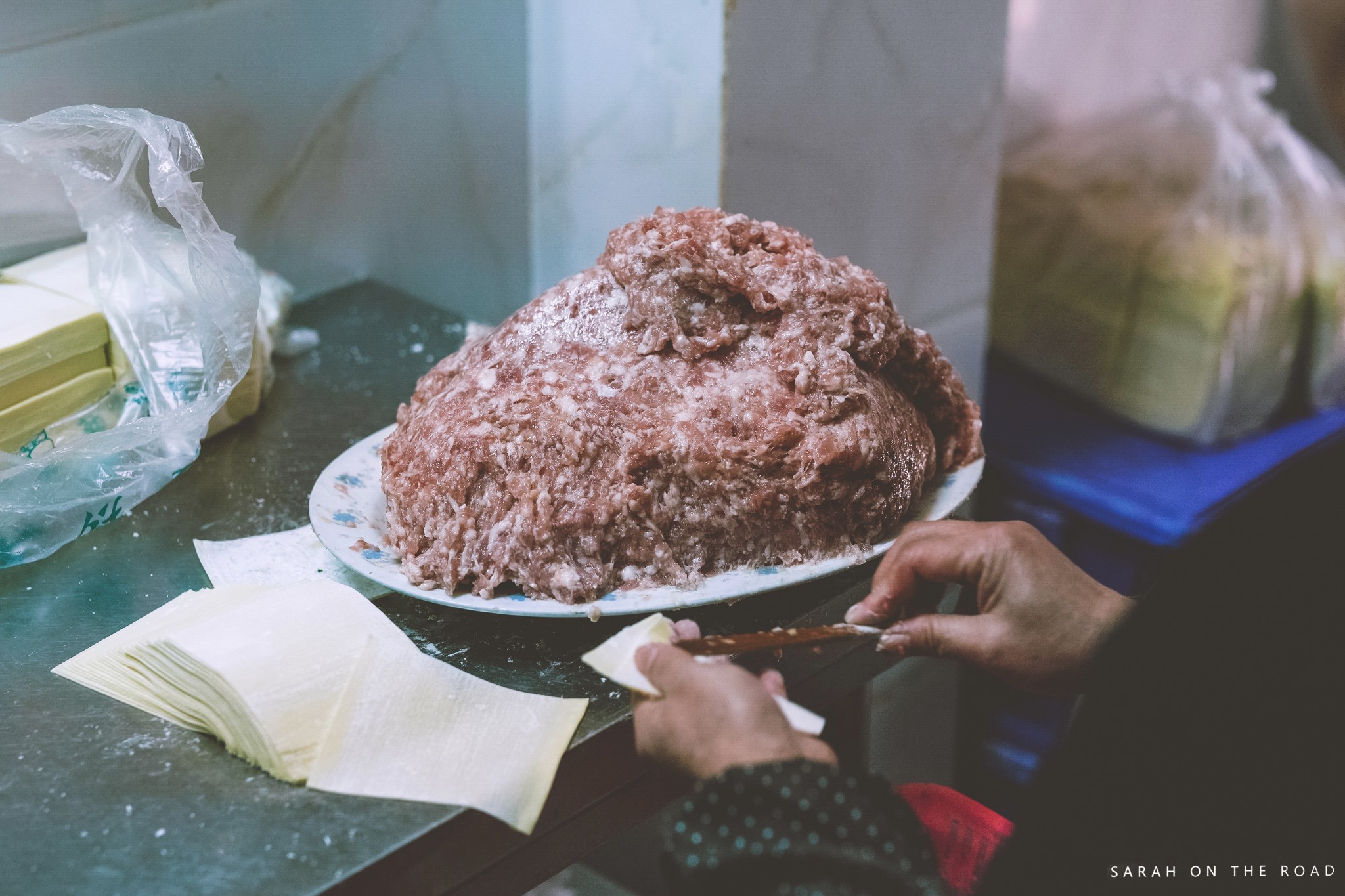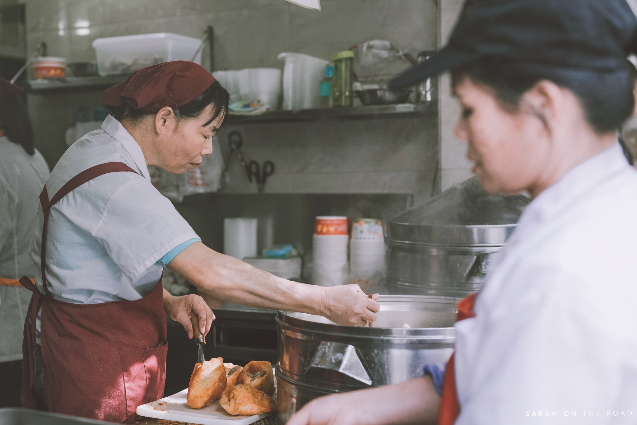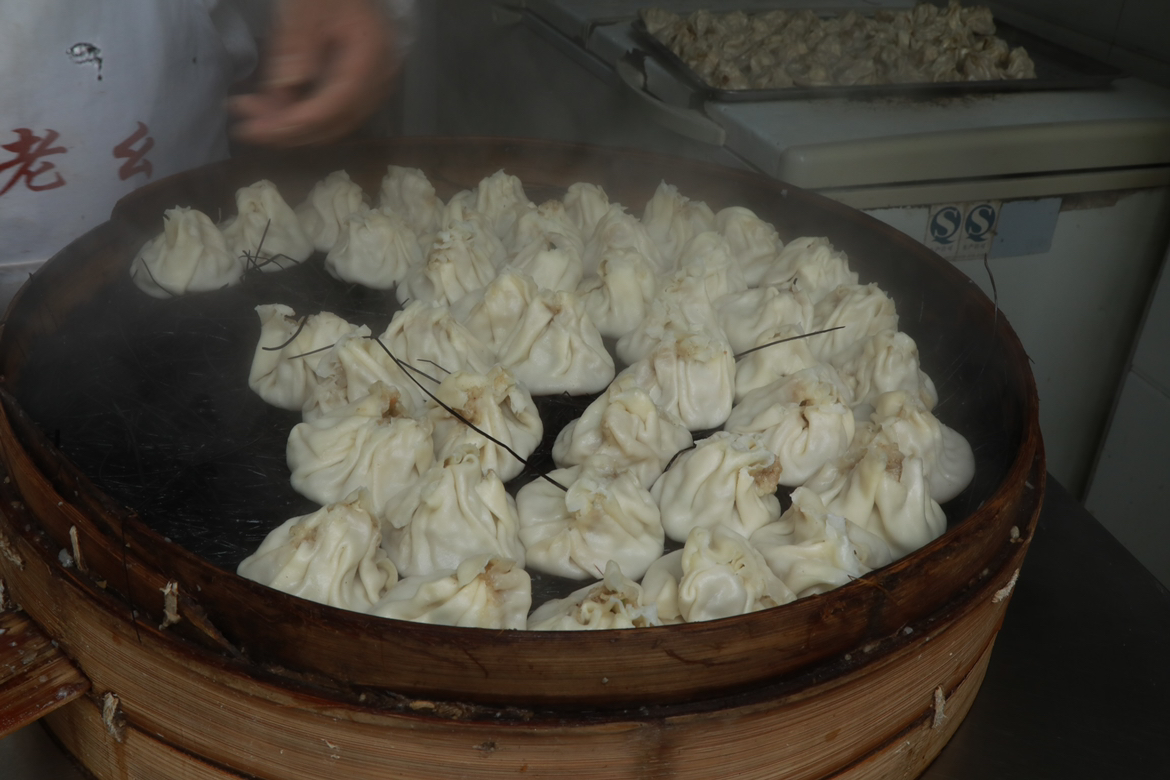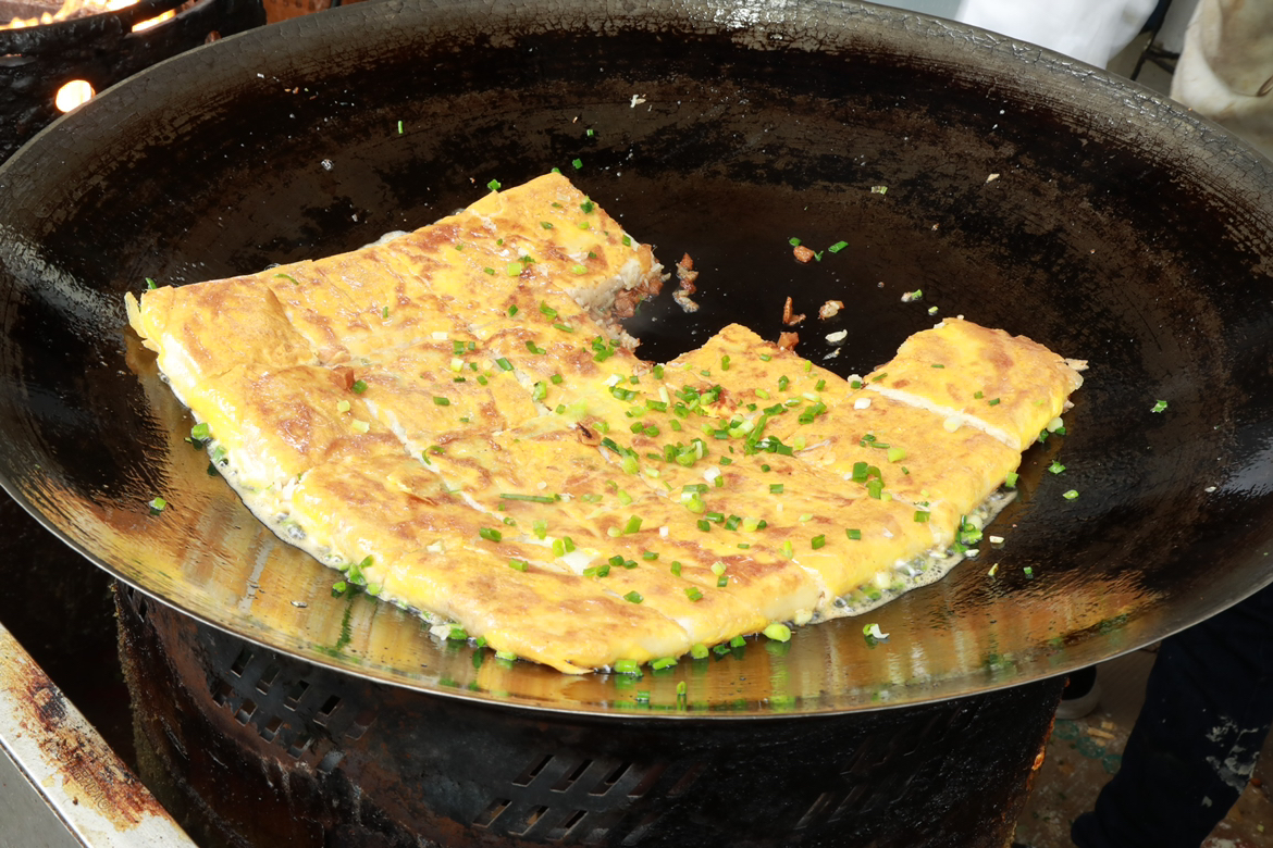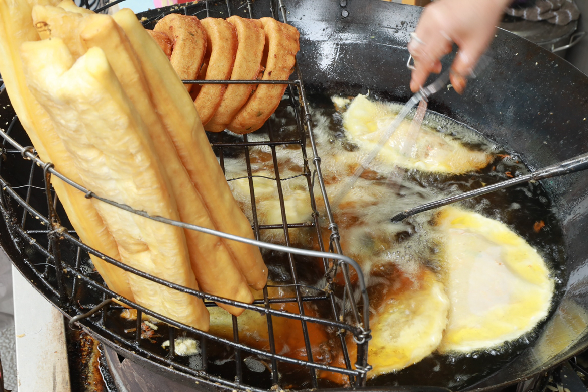 差点忘了油饼,另一边阿姨们忙着煎油饼,面皮在油锅里炸的金黄蓬起来,中空外脆,顺手给旁边的阿姨装烧麦,一个油饼包四个烧麦,就怕你们吃不饱啊。