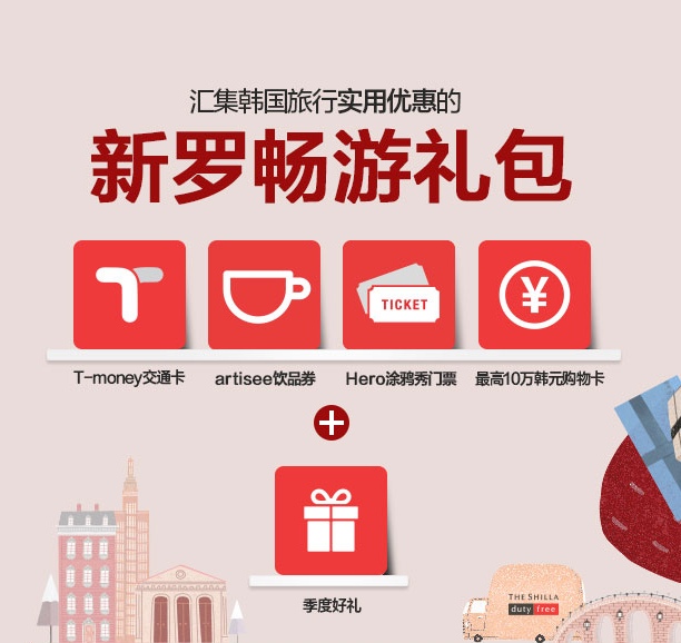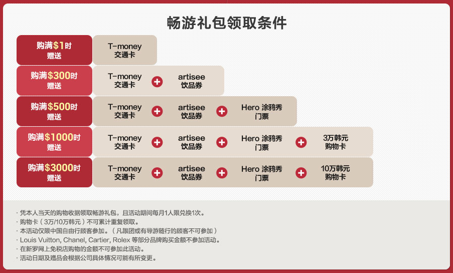 最新一期的畅游礼包是以下条件:购物满100美元赠送T-money交通卡,内含5000韩币;购物满300美元赠送T-money交通卡+artisee咖啡券;购物满500美元赠送T-money交通卡+artisee咖啡券+涂鸦秀门票;购物满1000美元赠送T-money交通卡+artisee咖啡券...显示全部