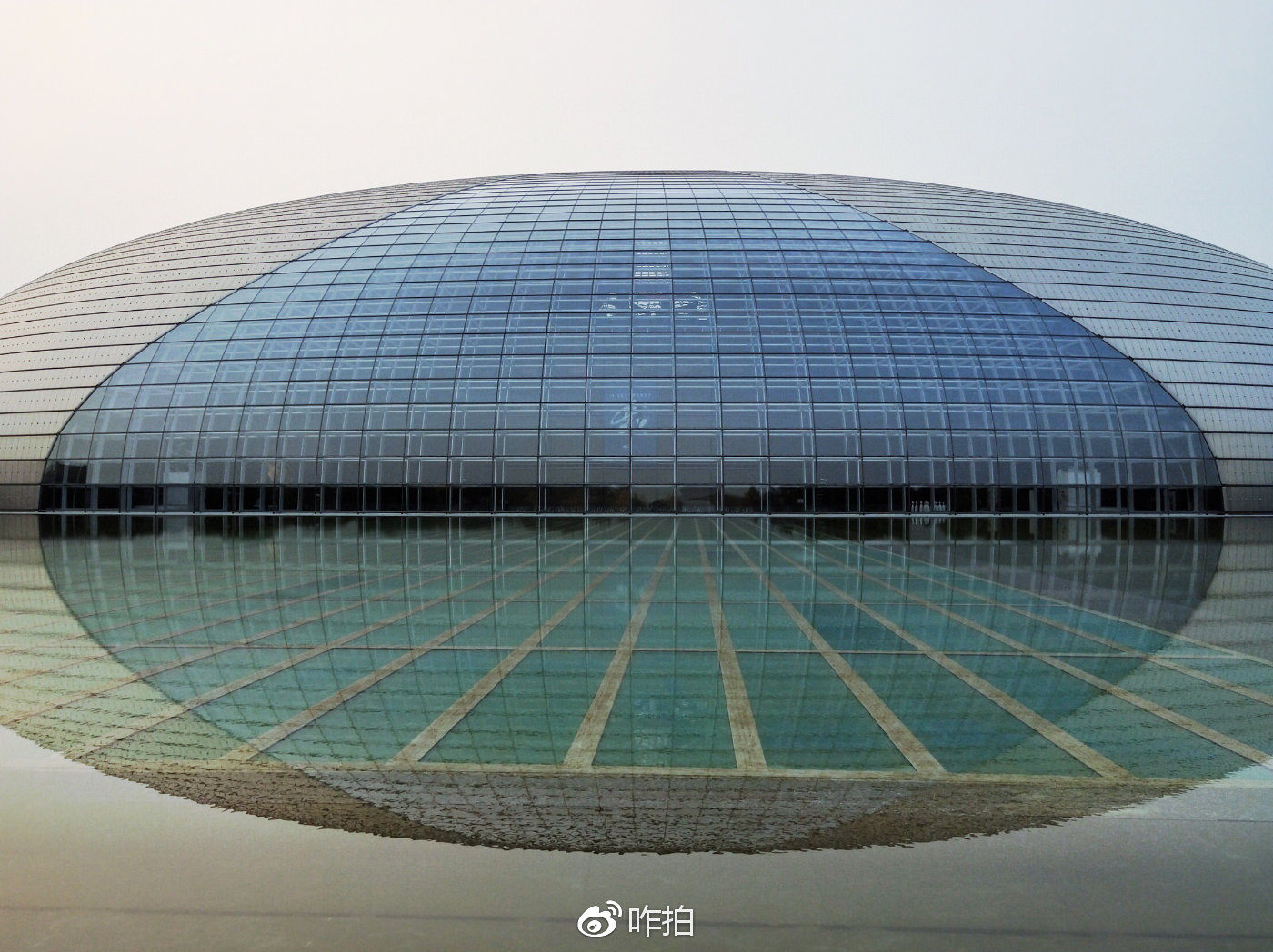人民大会堂西侧的国家大剧院,是中国国家表演艺术的最高殿堂,独特的造型也吸引了很多游人来这里打卡留念,我们可以利用水面的倒影这样拍: