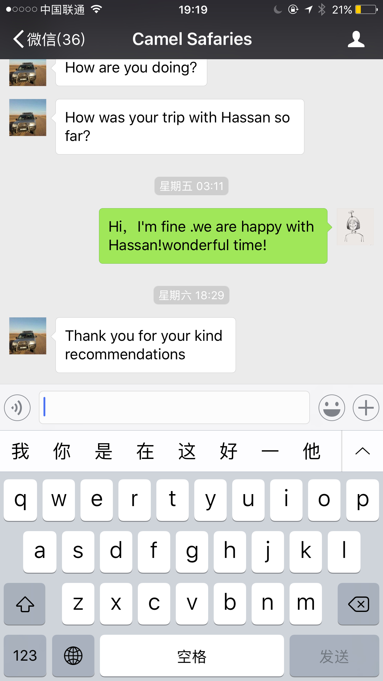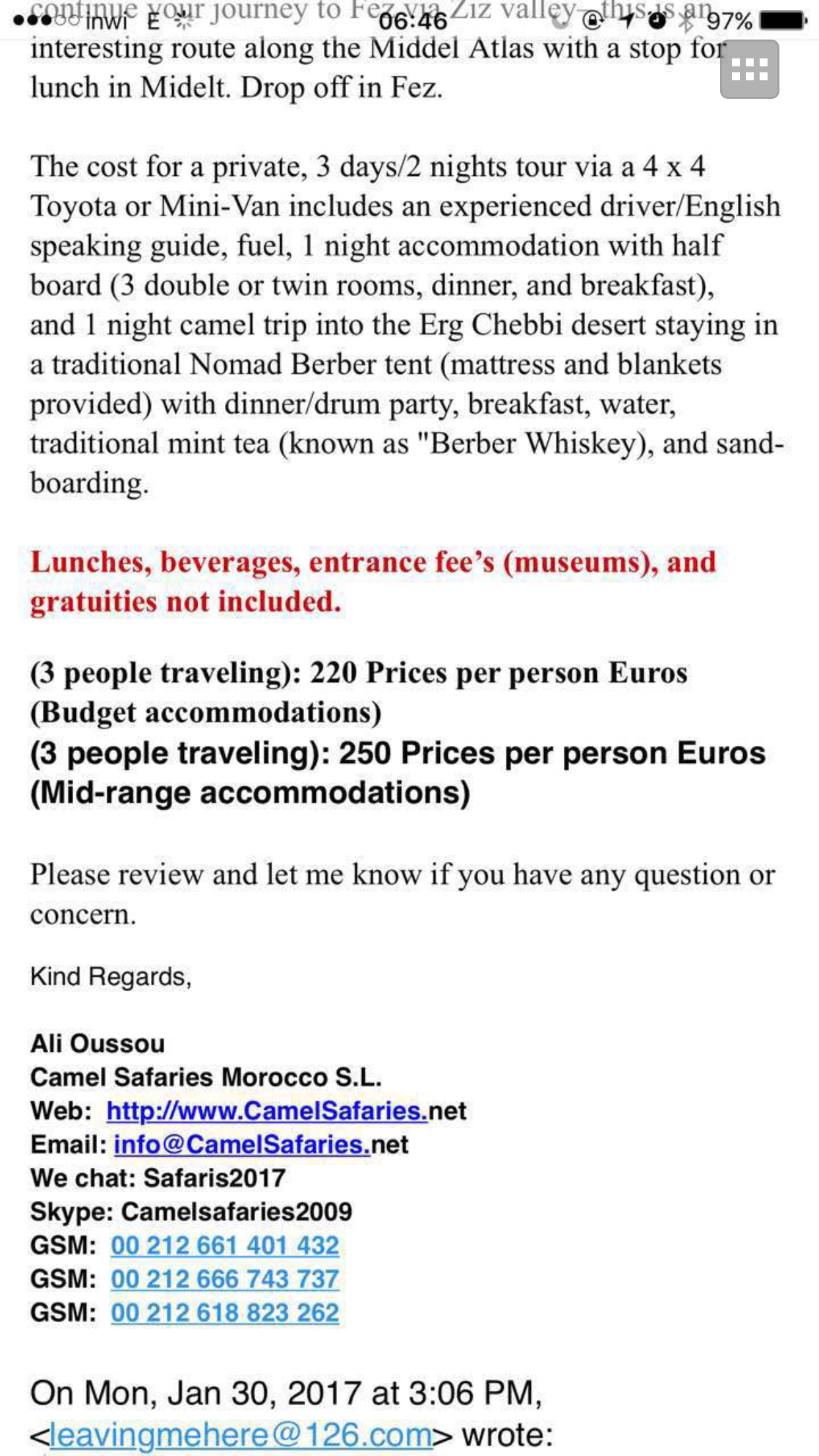 (因为一点处女洁癖想在沙漠里用热水洗澡,所以就定了豪华团,而且总共1100km感觉更大团有点累,所以一开始我就看的豪华团。)Camel Safaries我在猫途鹰上找的!!棒呆了!好几个朋友也是找的他们,而且之前咨询过的淘宝也是他们的地接但淘宝要300欧每人还要300的定金 ,定金不退。他们是...显示全部