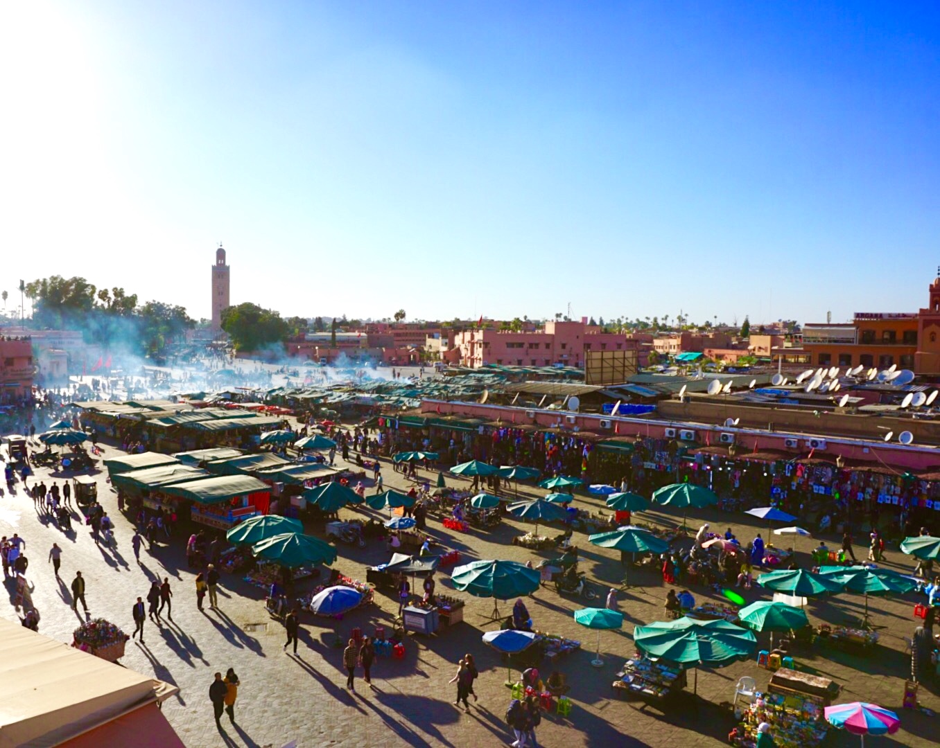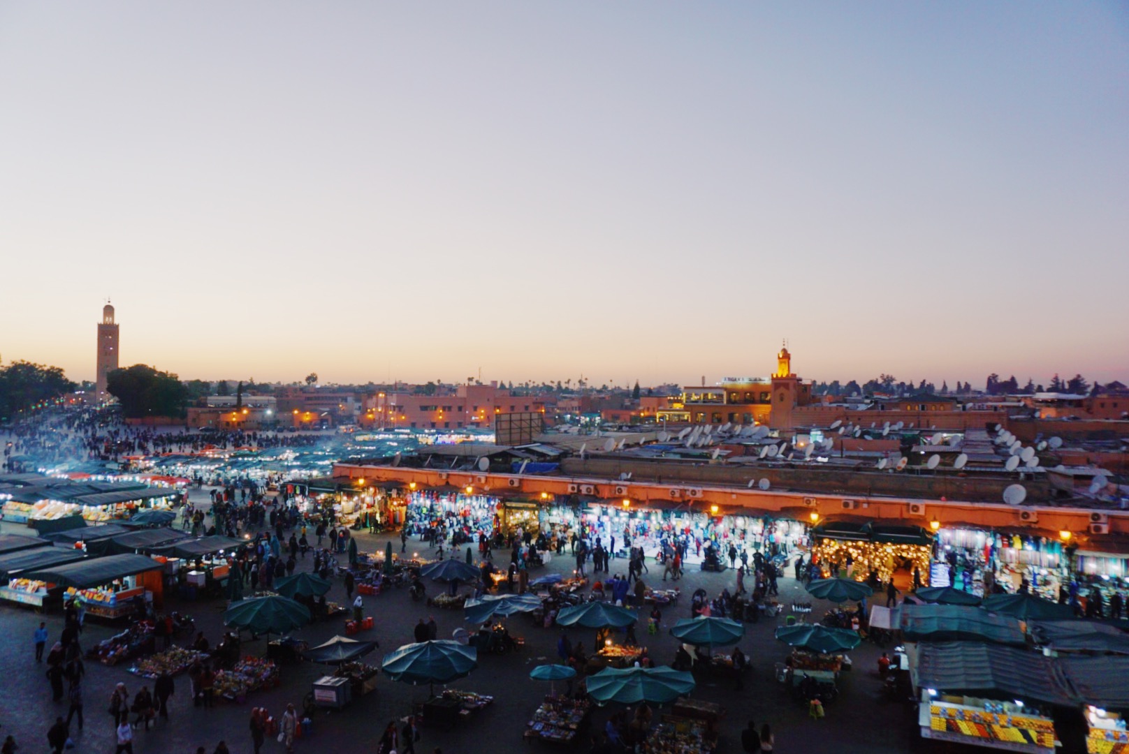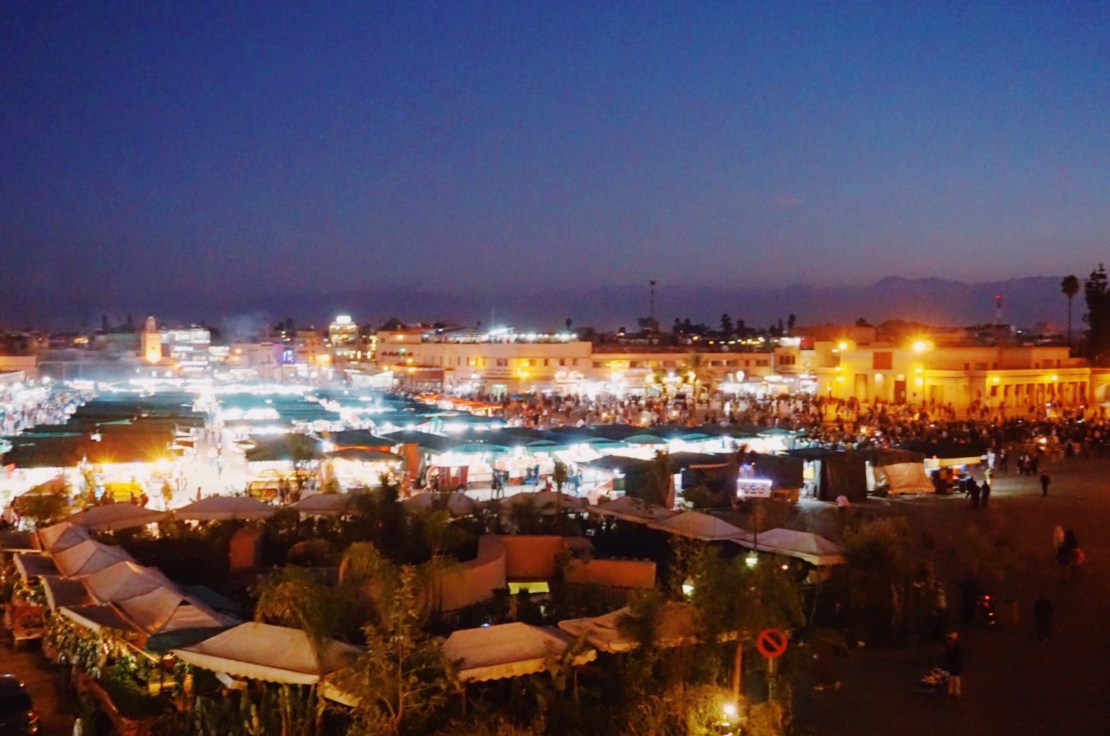 晚上我們凭著酒店管家畫給我們的地圖用了約25分鐘找到了不眠廣場,杰马夫纳广场是全球唯一还在使用且被列入世界文化遗产的广场,已有千年历史。這裡非常熱鬧,當地人會在這裡擺地攤、表演、用各種誇張手法吸引路人,但說實話小編和小夥伴都有點內心抗拒這個廣場的,因為當地人都很踴躍的跑過來跟你推銷,纏著你講,小編還被一位當地女人在不知道的情況下把Henna畫了一筆在我手上,當場氣的忍不住鬨了一聲